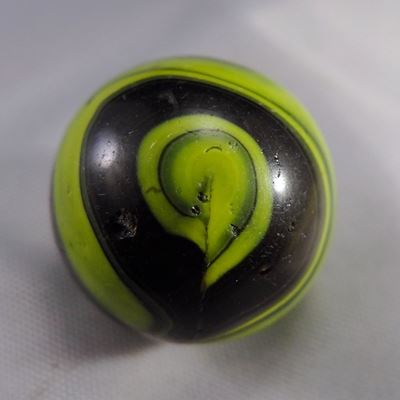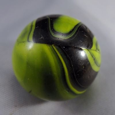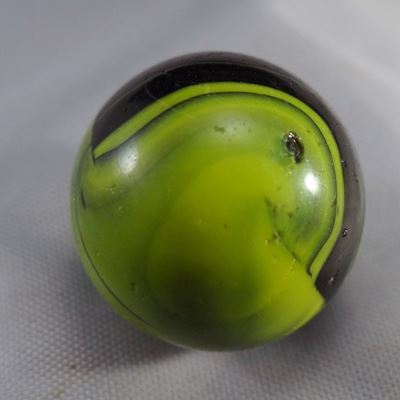 Opaque black base with electric green banding on it. Diaper fold design. One pit on it, some pocket wear. Cambridge OH, circa 1927-1929. 5/8". Near Mint(+) (8.9).