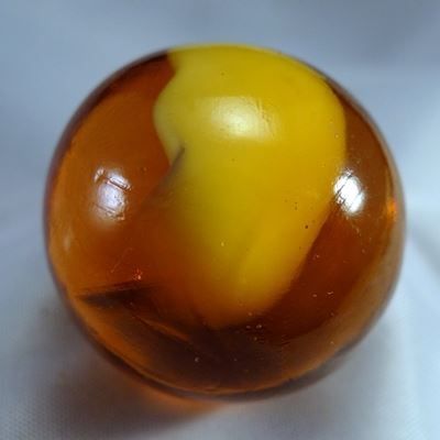 Transparent brown root beer base with opaque white ribbon in it. Ottawa IL, circa 1985-1995. 1". Mint (9.9).