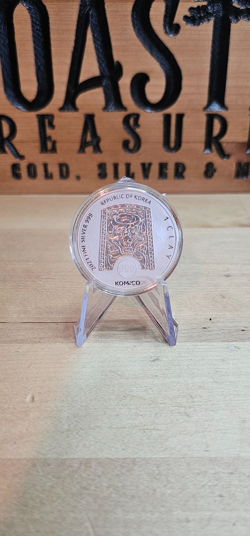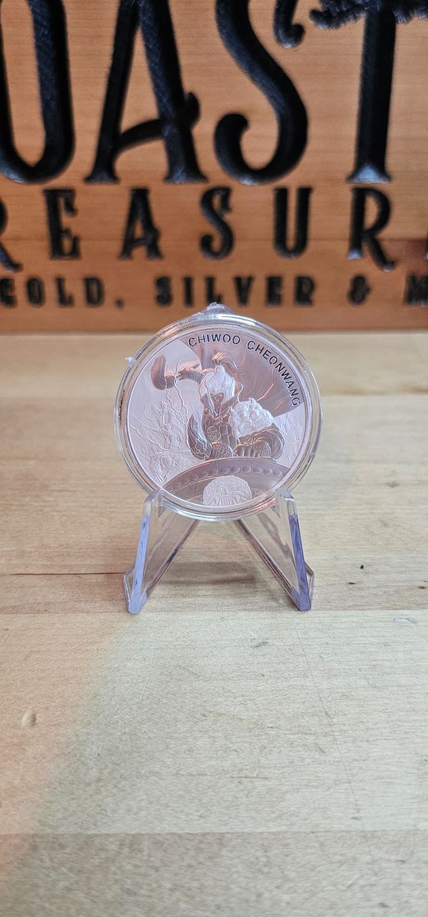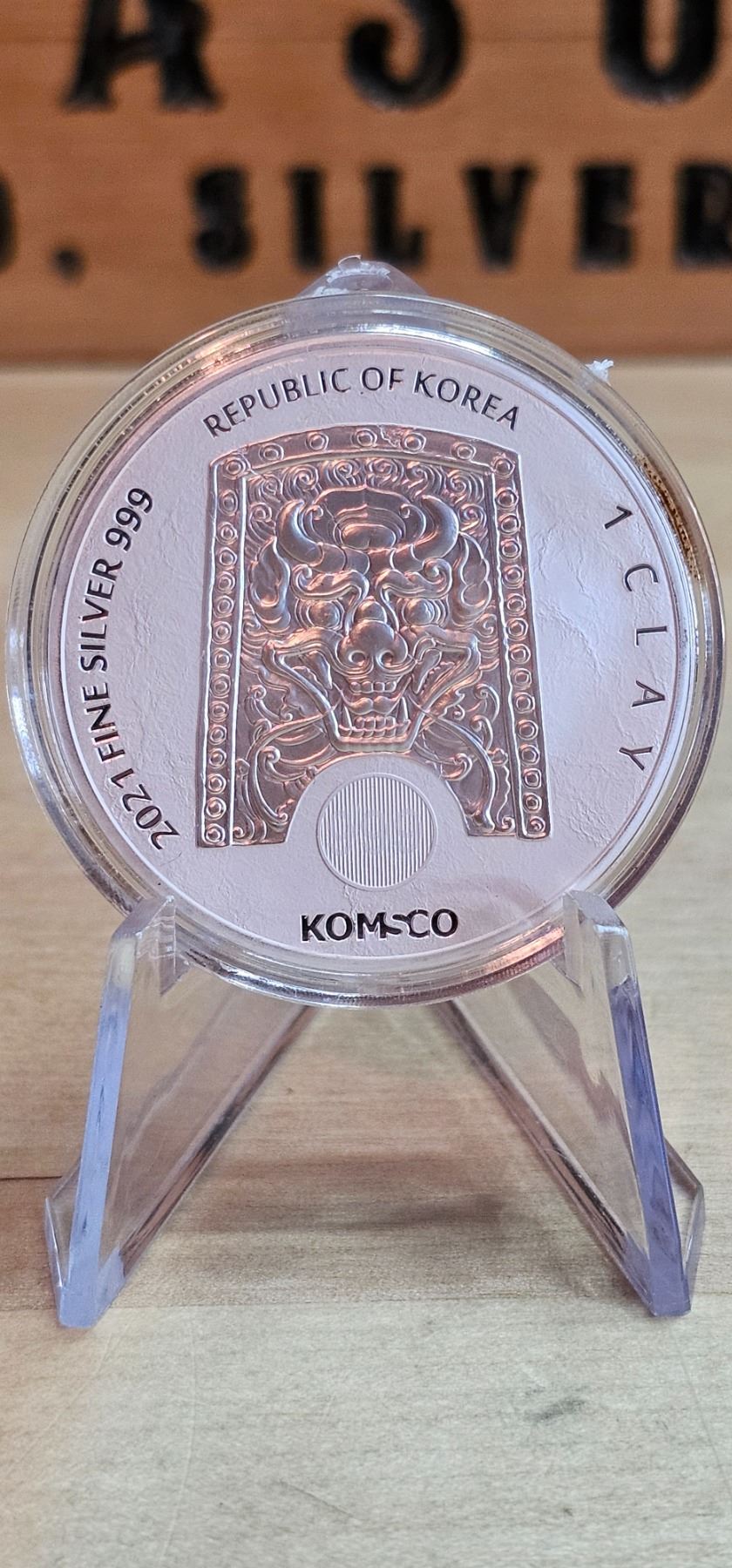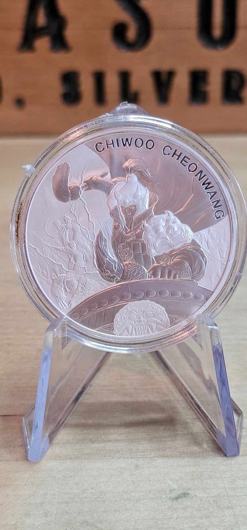The 2021 1 Oz Silver Chiwoo Cheonwang Coin from KOMSCO is crafted from .999 fine silver and features a striking design of the legendary Korean warrior, Chiwoo Cheonwang. Known for its artistic detail and limited mintage, this coin is a sought-after collectible for both investors and history enthusiasts.