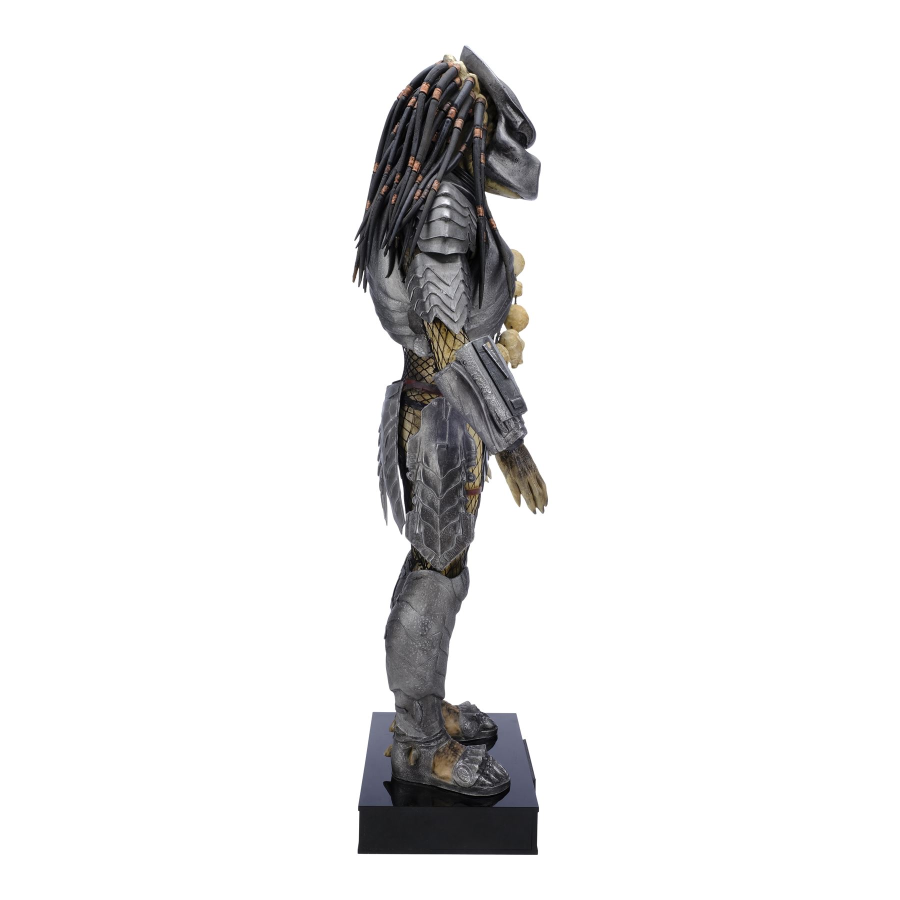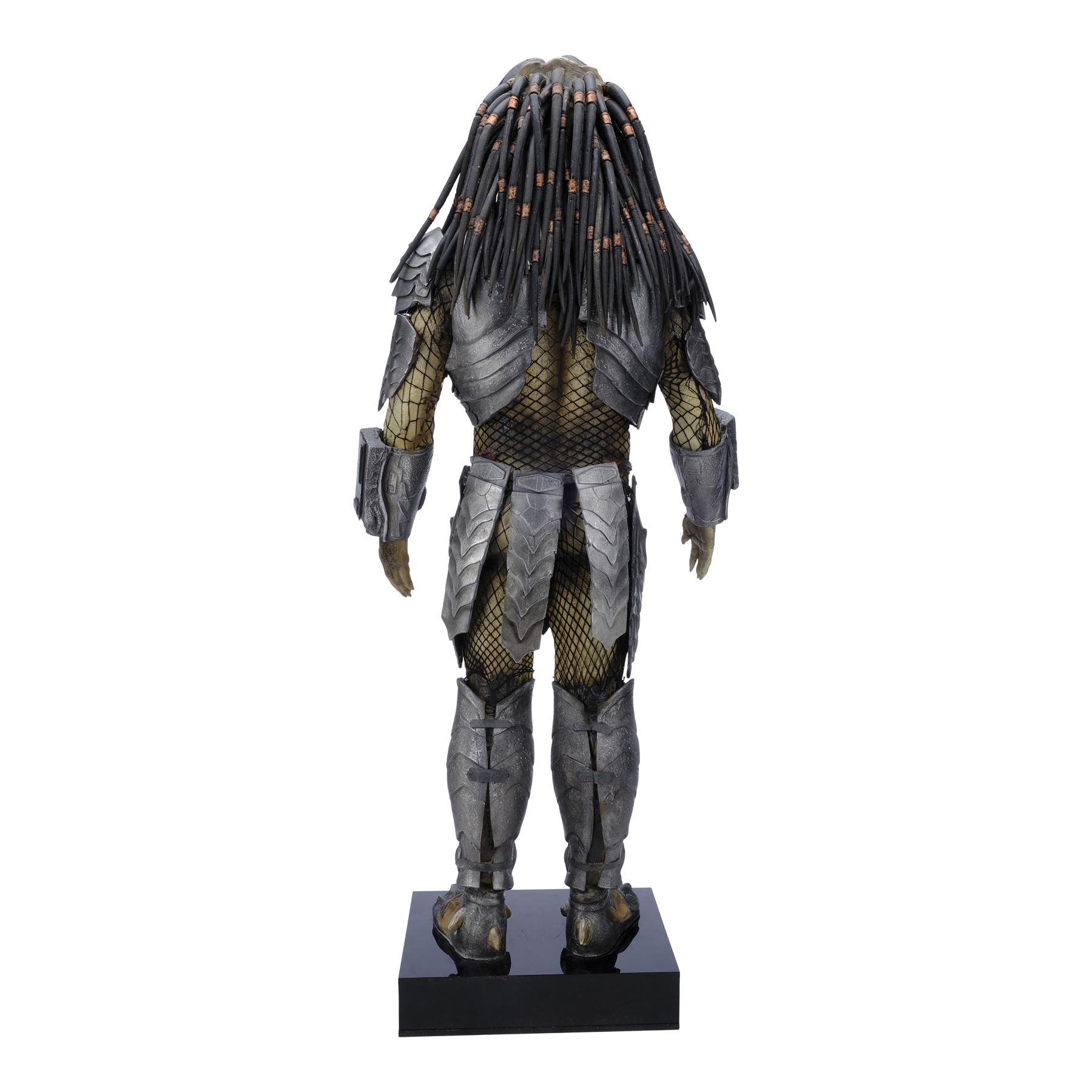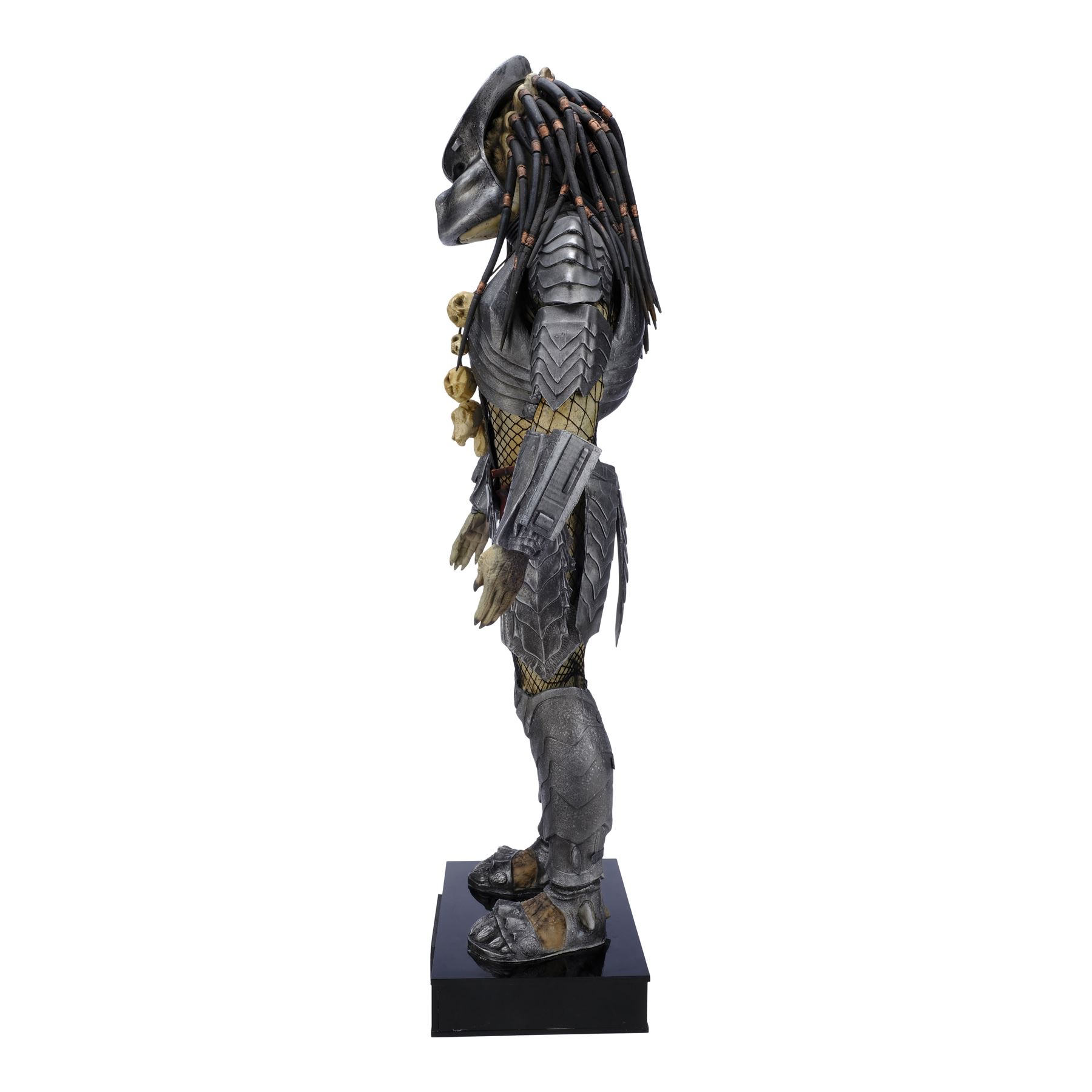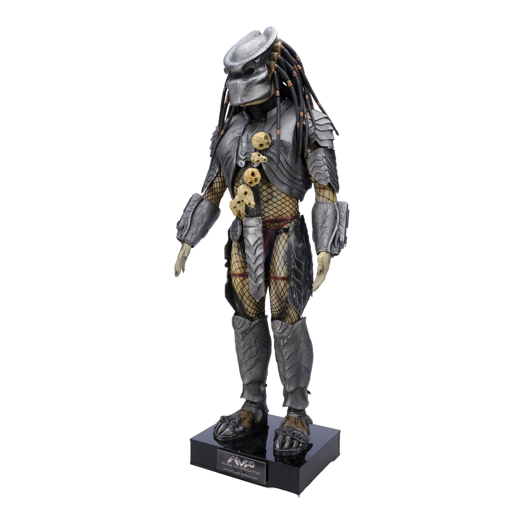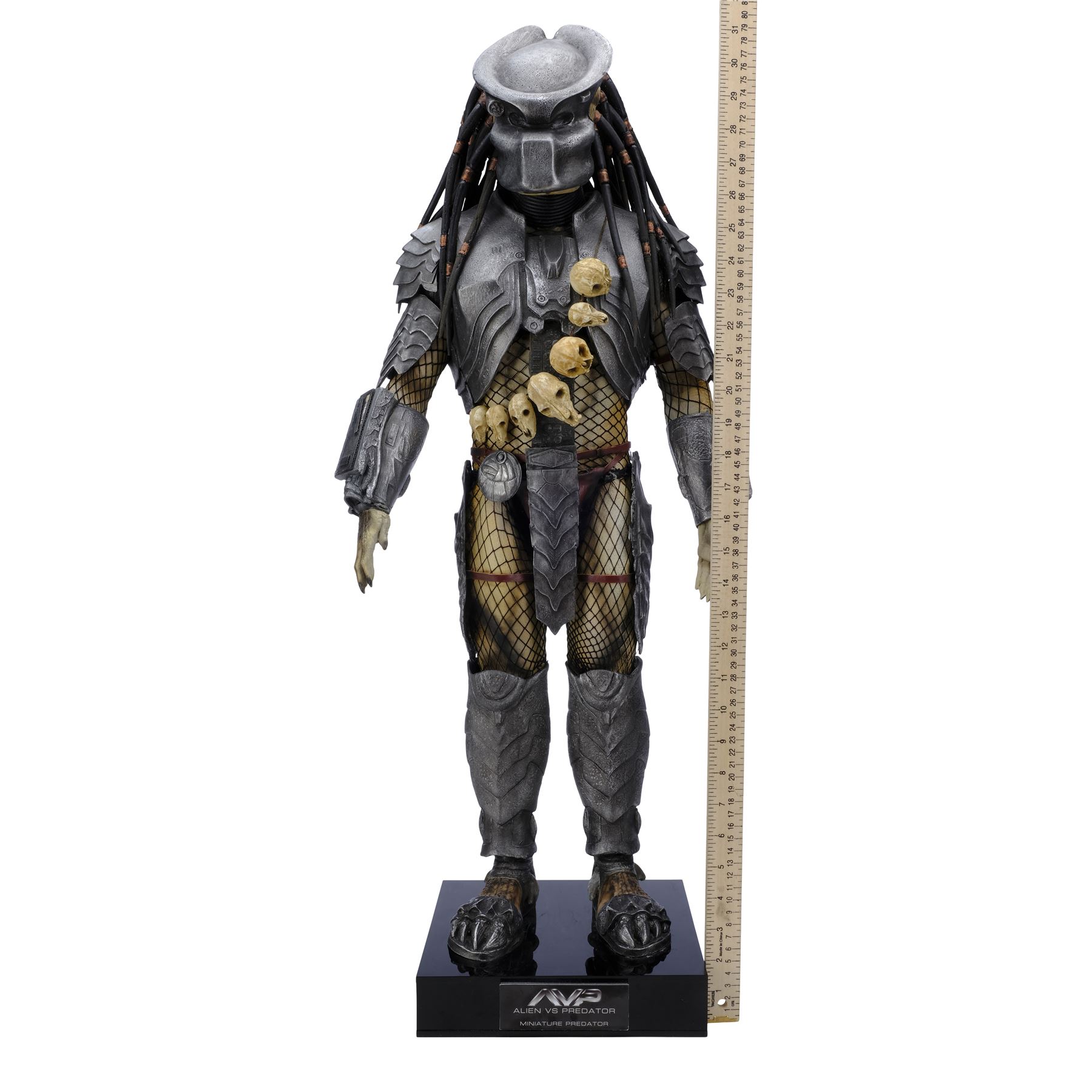 Created by Richard Van Den Bergh's miniatures unit, this hand-painted plastic Predator features resin, fibreglass, and pleather armour, including a Yautja bio-mask, torso piece, pairs of shoulder, wrist, and calf pieces, and belt pieces; a black nylon body net; a resin-skull bandolier; and black rubber urethane locs. Also included is a black plastic display base affixed with a plaque labelled "AVP Alien VS Predator Miniature Predator." The model exhibits notable adhesive residue; chipped and cracked armour; loose armour; missing chunks of urethane; and notable paint marks. Dimensions: (displayed) 34.5 cm x 21.75 cm x 81.5 cm (13.5" x 8.5" x 32")