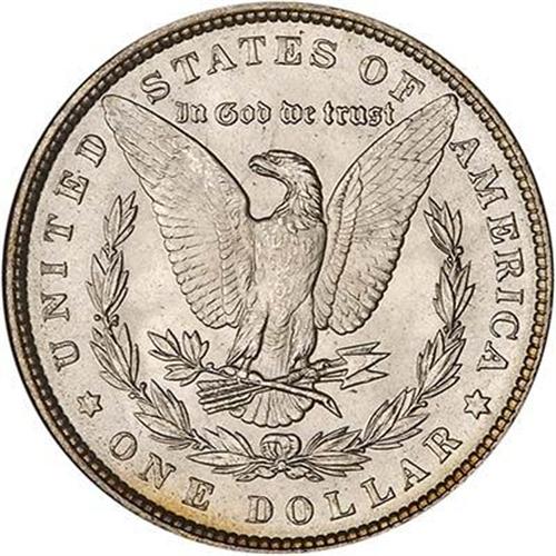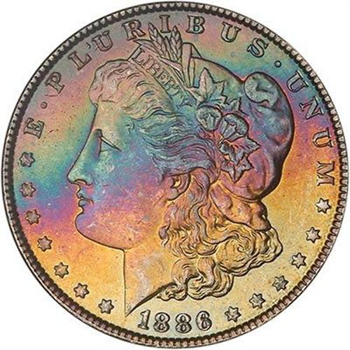 1886 Morgan Dollar. What thrills us about this particular Gem is its even-handed distribution of colors, a rainbow of absolute perfection that enfolds the obverse in its embrace. (#7166)<p><i>from The Battle Creek Collection, Part III</i>