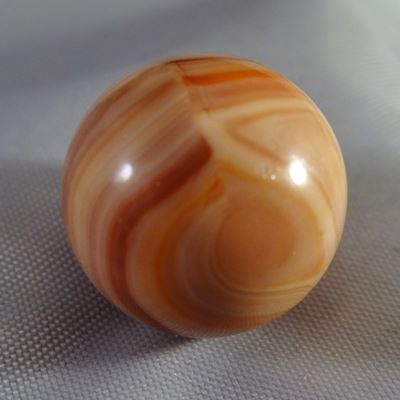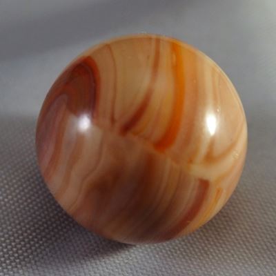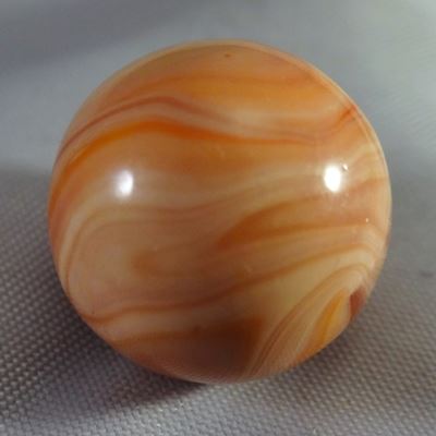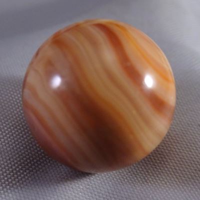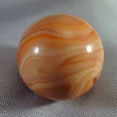 Interesting Striped Opaque, almost looks like a Layered Sand. Salmon, peach and ruddy red striping on a pale peach base. Two seam. Rare. Cambridge OH, circa 1927-1929. 9/16". Mint (9.9).