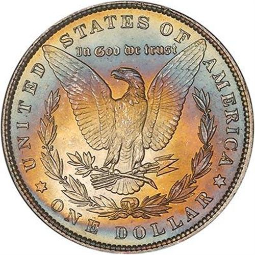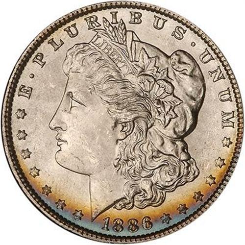 1886 Morgan Dollar. Color so bright and vivid it lands with a thud on the back of your eye-receptors, shaking them too and fro with its natural iridescent sheen. This is one of the very special Gem MS65 examples that we expect bidders will want to own. (#7166)<p><i>from The Battle Creek Collection, Part III</i>
