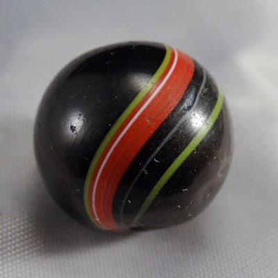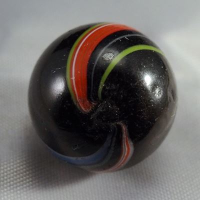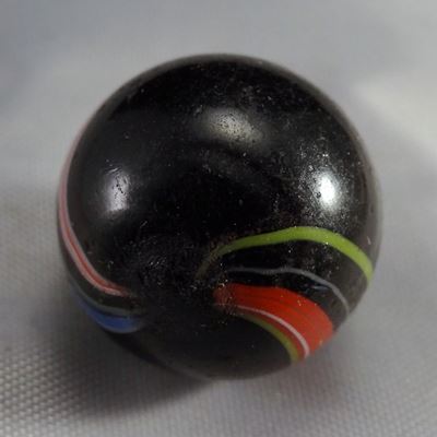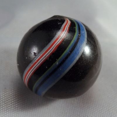 Opaque black base. Two bands covering about thirty percent of the surface. One is pink, blue, white and yellow. Other is red, white and yellow. A couple of tiny pinpricks. Germany, circa 1860-1920. 19/32". Mint(-) (9.2).