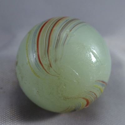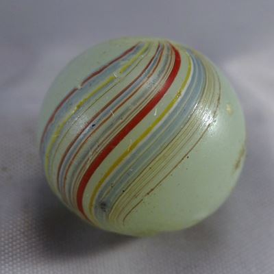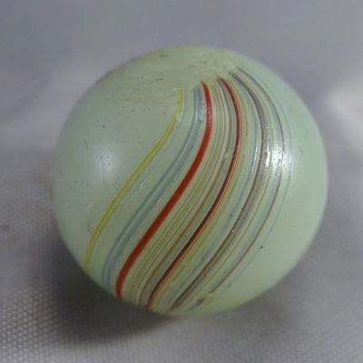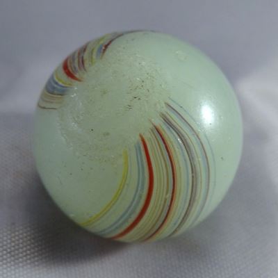 Semi-opaque white base with two bands of stretched color covering about thirty percent of the surface. Very pretty. Germany, circa 1860-1920. 11/16". Mint (9.5).