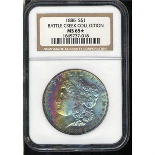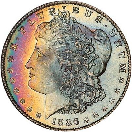 1886 Morgan Dollar. Blue, gold, purple and aquamarine: even the most serious bidder with a stern abstracted air will, after casual inspection of this dollar, pull up his trouser legs and dance around the room from the sheer excitement of contemplating such a remarkable offering. (#7166)<p><i>from The Battle Creek Collection, Part III</i>