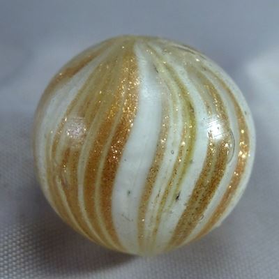 Nice Onionskin Lutz. White subsurface layer with heavy stretched bands of lutz. One tiny melt spot. Germany, circa 1860-1920. 11/16". Mint (9.3).
