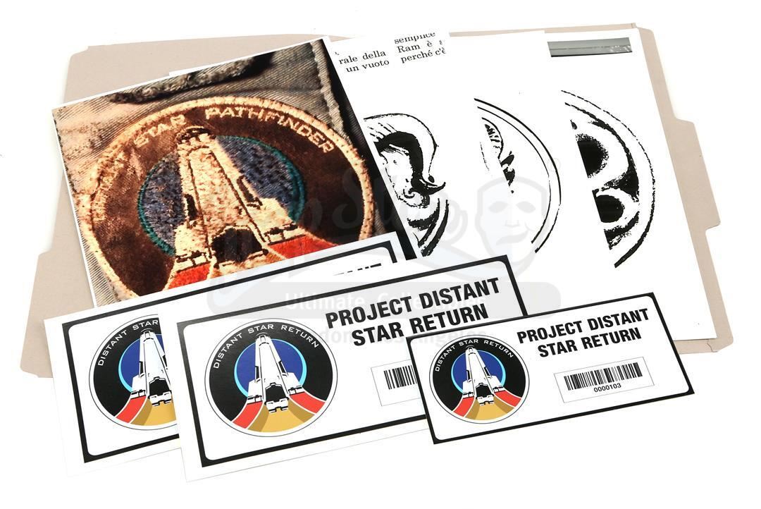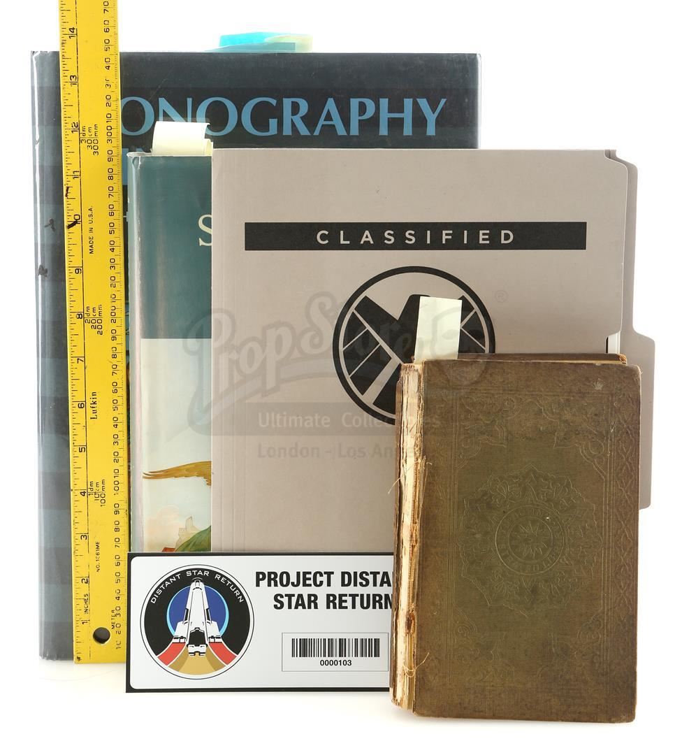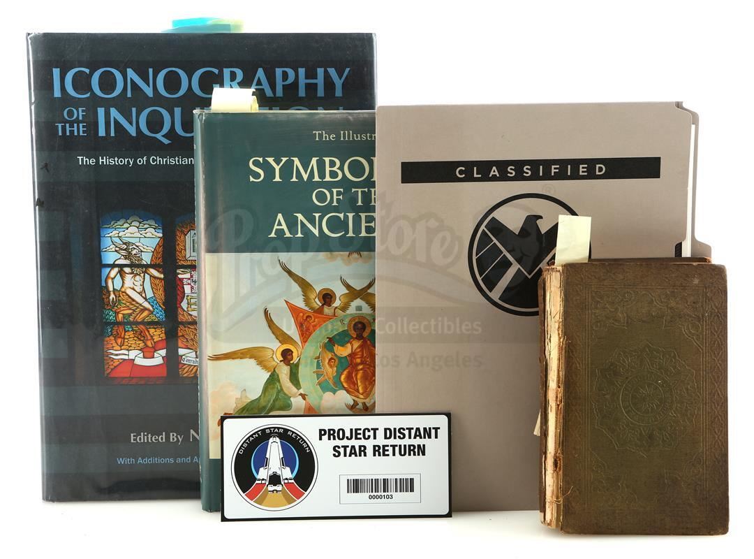 A set of Hydra history books and paperwork from Season 3 of Marvel's Agents of S.H.I.E.L.D. Gideon Malick and Grant Ward conspire throughout the season to bring Hive, the ancient Inhuman whose face is the source of Hydra's tentacled logo, to Earth. This set consists of three hardcover books, one untitled, one titled 'Iconography of the Inquisition', and another titled 'The Illustrated Symbology of the Ancients', all with production-illustrated covers and pages noted with adhesive paper on the interiors. The authors of the titled books, Aaron Guertin and Norah Houtz, are 'Easter Eggs' referring to art department artists from production. Also included are five printed pages showing the evolution of the Hydra logo into the Pathfinder vessel, a gray S.H.I.E.L.D. folder labeled 'Classified', and one small and two large unpeeled color Project Distant Star Return stickers. The set is in good overall condition with the untitled book's spine ripped to appear old and various other signs of use throughout.