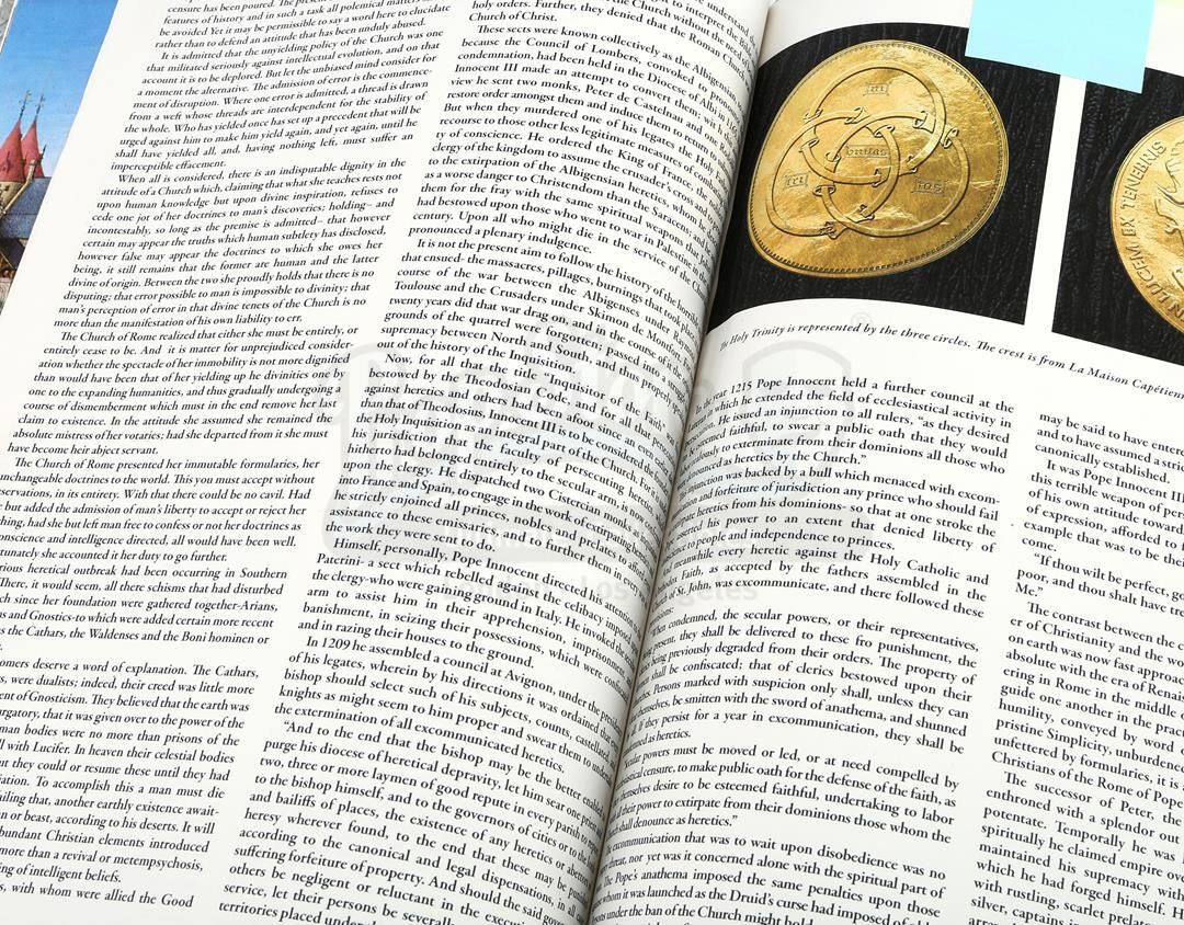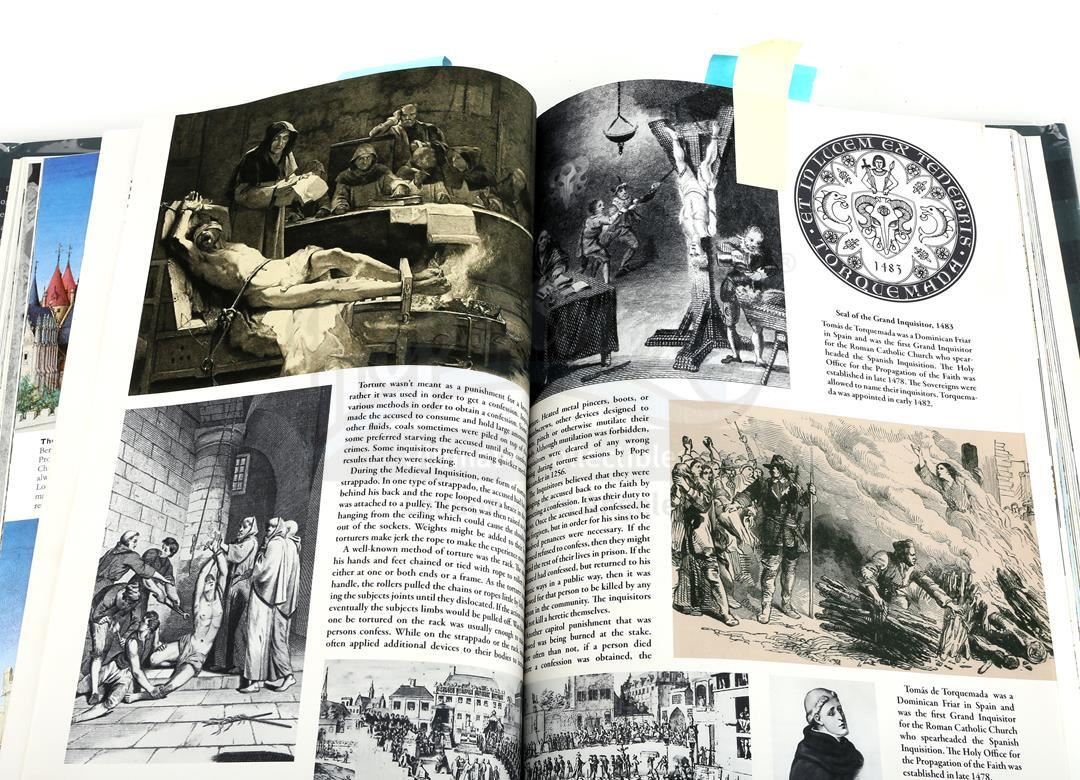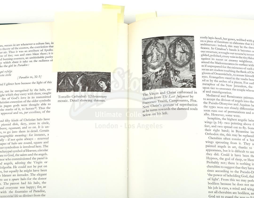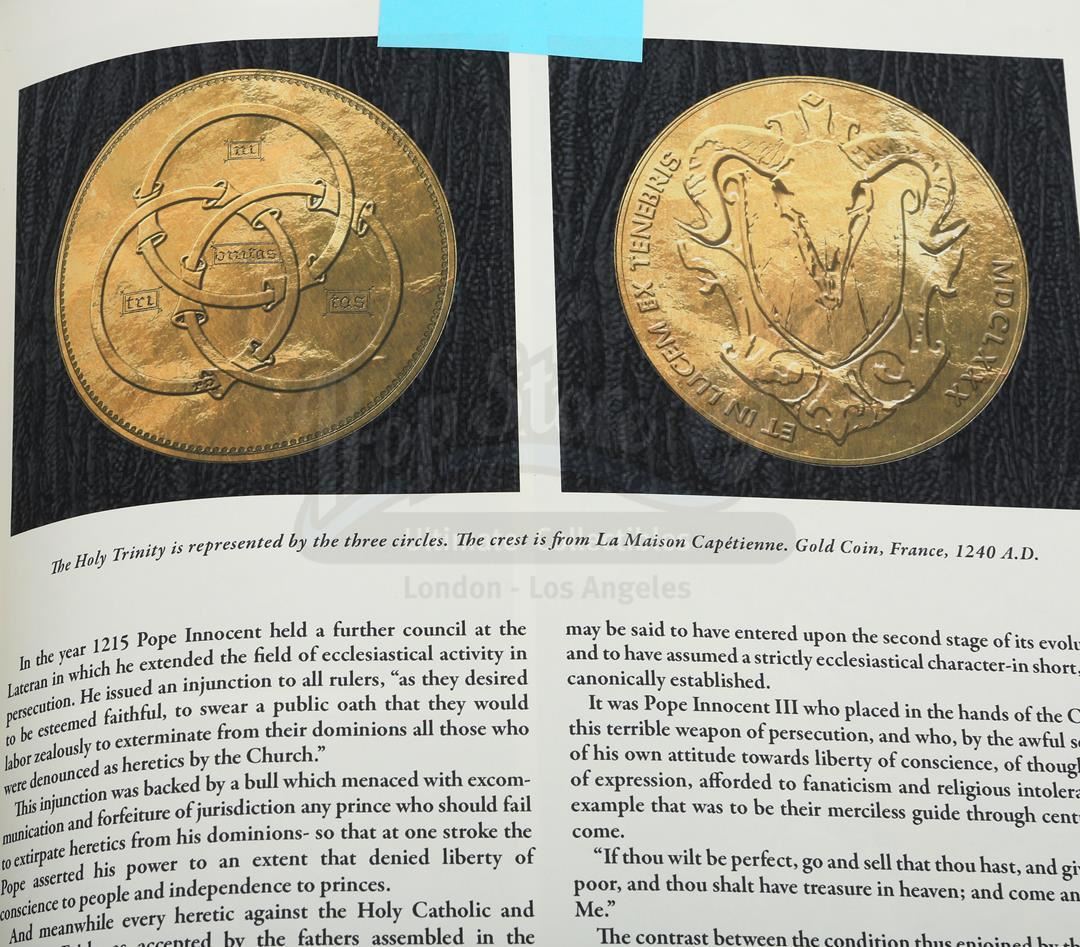 A set of Hydra history books and paperwork from Season 3 of Marvel's Agents of S.H.I.E.L.D. Gideon Malick and Grant Ward conspire throughout the season to bring Hive, the ancient Inhuman whose face is the source of Hydra's tentacled logo, to Earth. This set consists of three hardcover books, one untitled, one titled 'Iconography of the Inquisition', and another titled 'The Illustrated Symbology of the Ancients', all with production-illustrated covers and pages noted with adhesive paper on the interiors. The authors of the titled books, Aaron Guertin and Norah Houtz, are 'Easter Eggs' referring to art department artists from production. Also included are five printed pages showing the evolution of the Hydra logo into the Pathfinder vessel, a gray S.H.I.E.L.D. folder labeled 'Classified', and one small and two large unpeeled color Project Distant Star Return stickers. The set is in good overall condition with the untitled book's spine ripped to appear old and various other signs of use throughout.