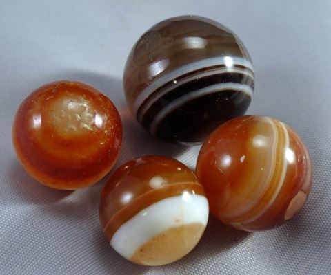 Lot of four marbles. All are handcut Agates. Largest is dyed black. 9/16" to 23/32". One of the smaller is Near Mint, rest are Mint.