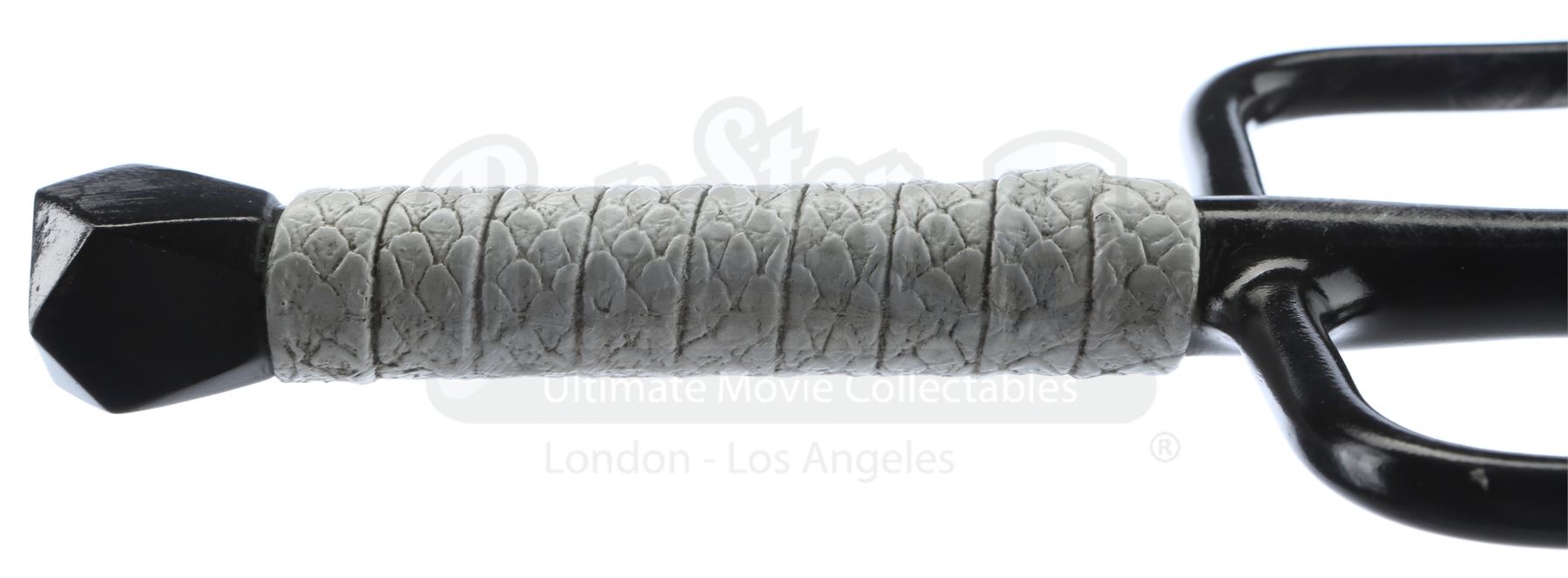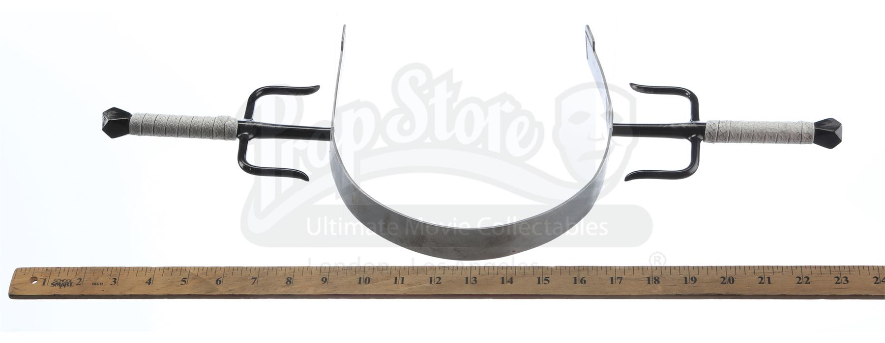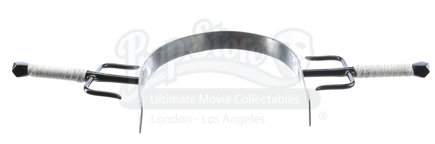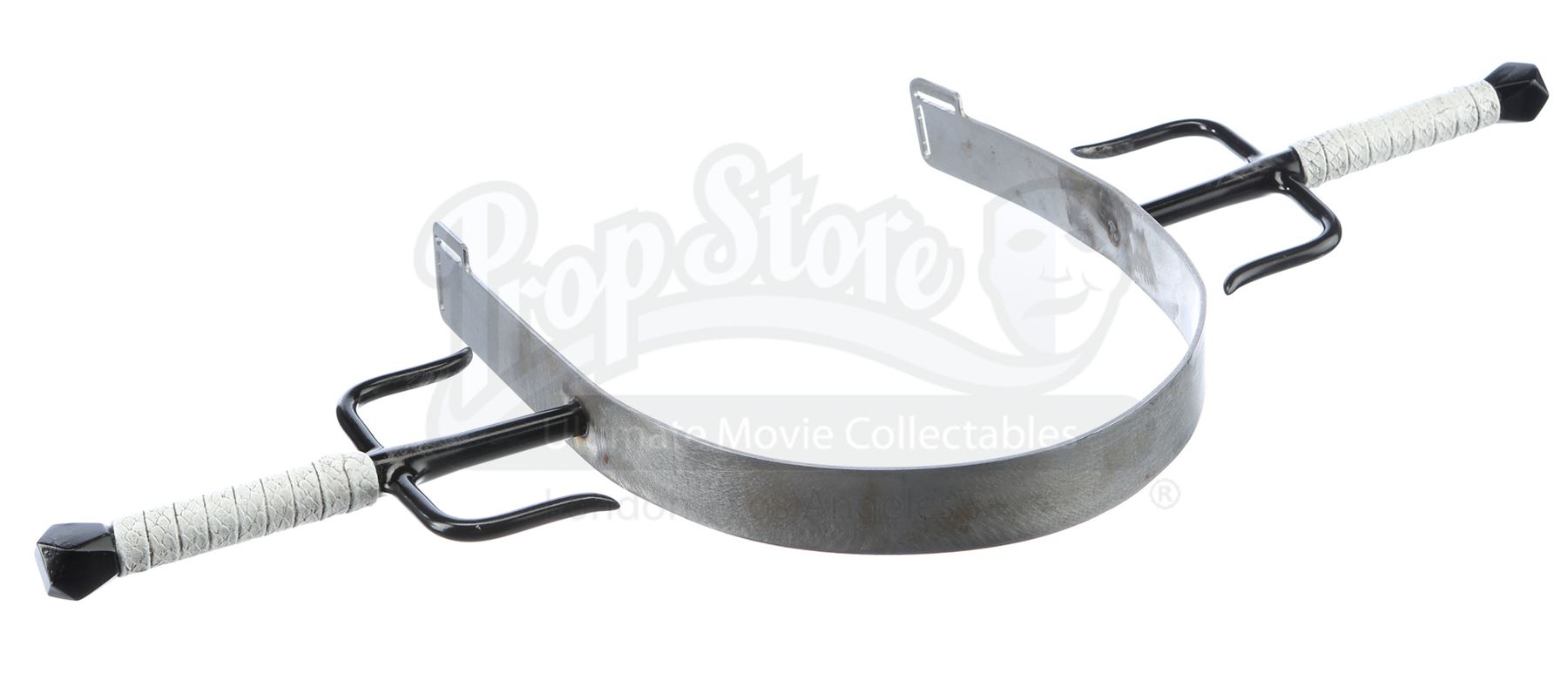 Elektra Natchios’ SFX sai rig from the episode ‘The Man in the Box’ (210) of Marvel's Daredevil. In the episode, professional assassin Natchios uses her sais to stab Jacques Duchamps in an airplane hangar. This lot consists of a metal SFX rig with two black and white painted urethane sais affixed at opposite ends. It is in good overall condition, with some scuffing to the paint and various signs of wear throughout from production.