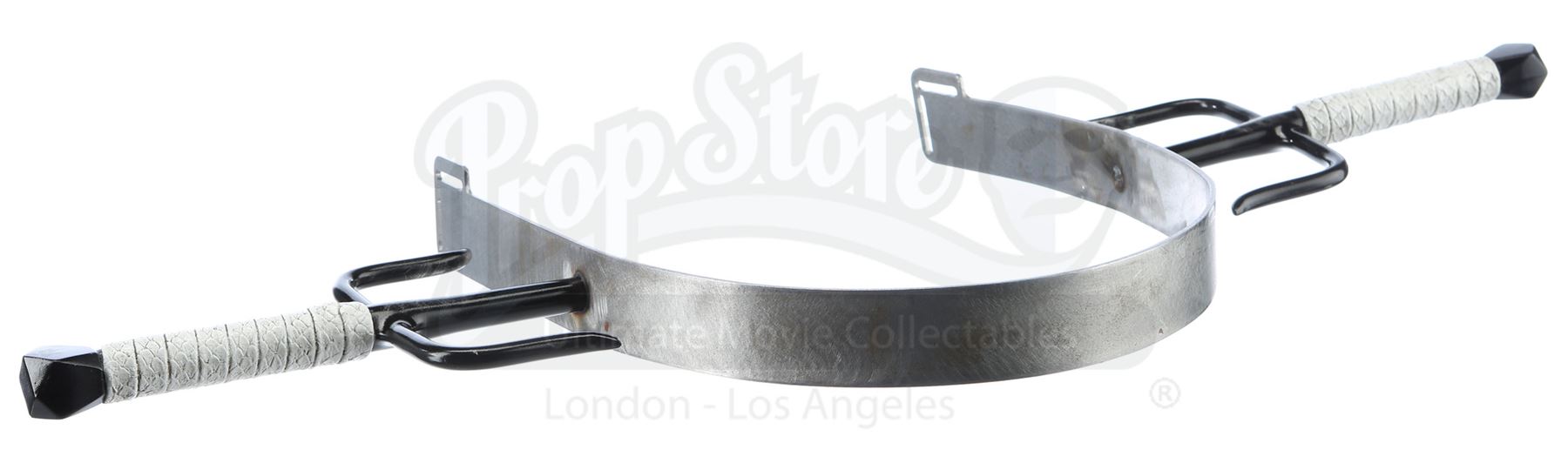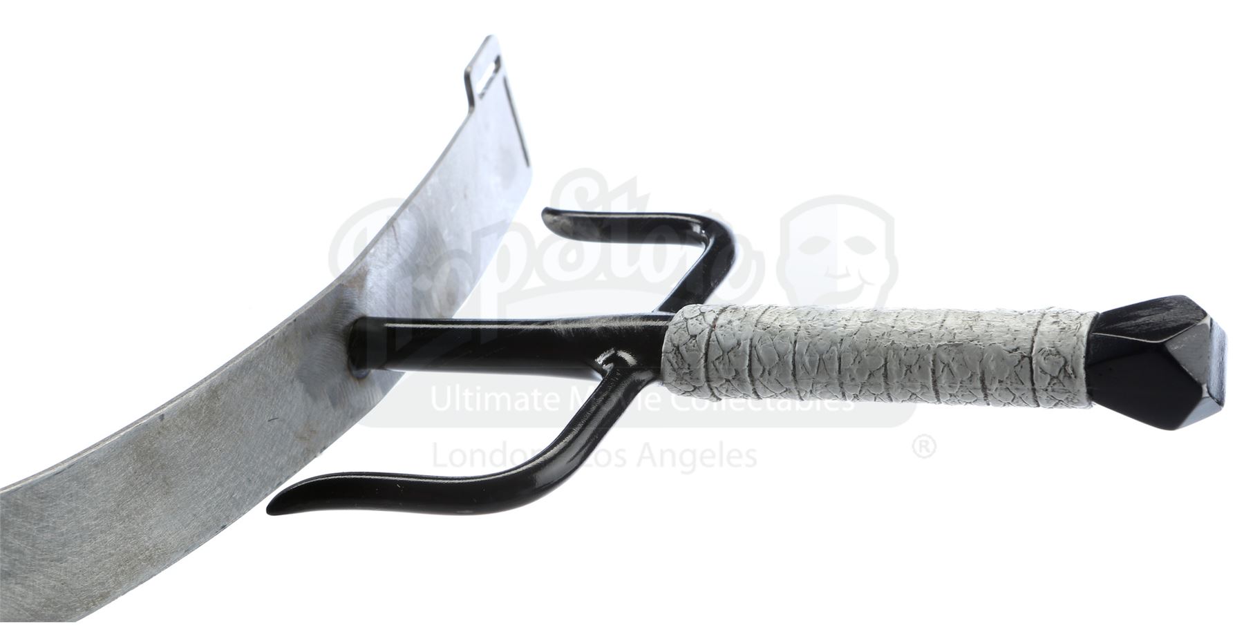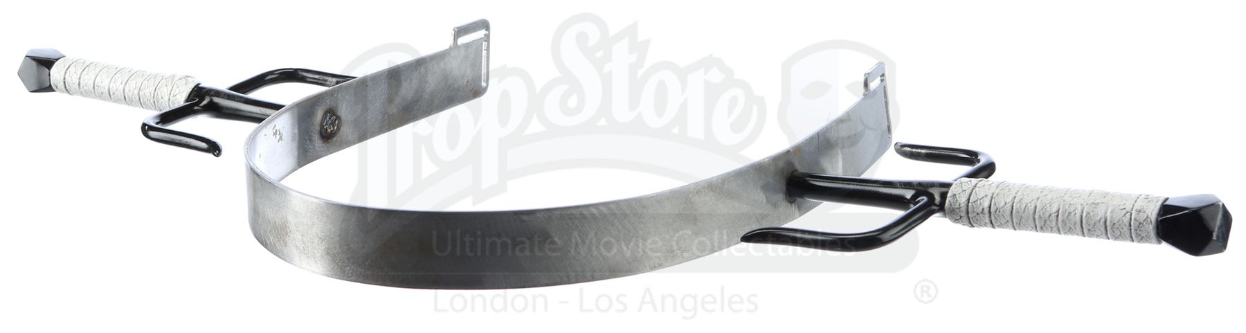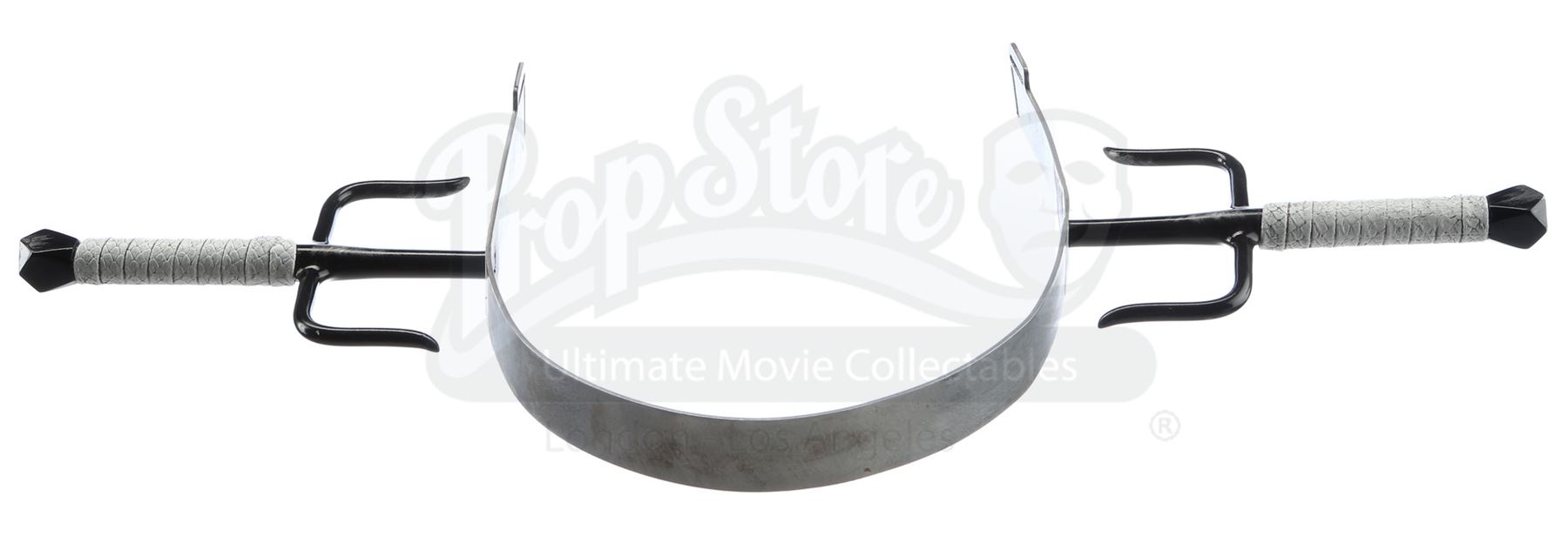 Elektra Natchios’ SFX sai rig from the episode ‘The Man in the Box’ (210) of Marvel's Daredevil. In the episode, professional assassin Natchios uses her sais to stab Jacques Duchamps in an airplane hangar. This lot consists of a metal SFX rig with two black and white painted urethane sais affixed at opposite ends. It is in good overall condition, with some scuffing to the paint and various signs of wear throughout from production.
