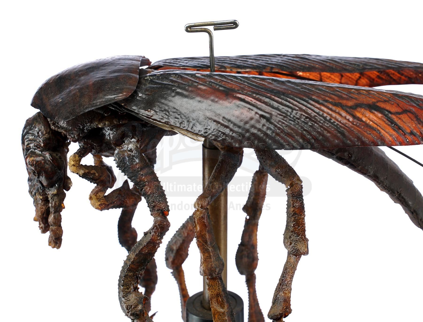 This lot will be auctioned on Tuesday, June 29th. The auction will begin at 9:00am PDT and lots are sold sequentially via live auctioneer; tune in to the live streaming broadcast on auction day to follow the pace. Note other lots in the auction may close on June 30th or July 1st. An animatronic Judas Breed insect from Guillermo Del Toro's sci-fi horror film Mimic. A new species of insect genetically engineered to wipe out Manhattan's many cockroaches quickly evolved to massive size and began hunting humans. This resin and plastic animatronic insect is hand-painted brown and black and constructed around a mechanical armature with cables and wires designed to articulate its six legs. The bug is mounted via metal rod to a black wooden base with metal bars and fastening strips attached. While it has undergone some sympathetic restoration, this lot remains in fair overall condition with cracking, paint flaking, and broken legs from use and age, and the levers should not be operated. Dimensions: 26.75" x 21.5" x 16.75" (68 cm x 54.75 cm x 42.75 cm) Contains mechanical components; see notice in the Buyer's Guide. Estimate: $3,000 - 5,000