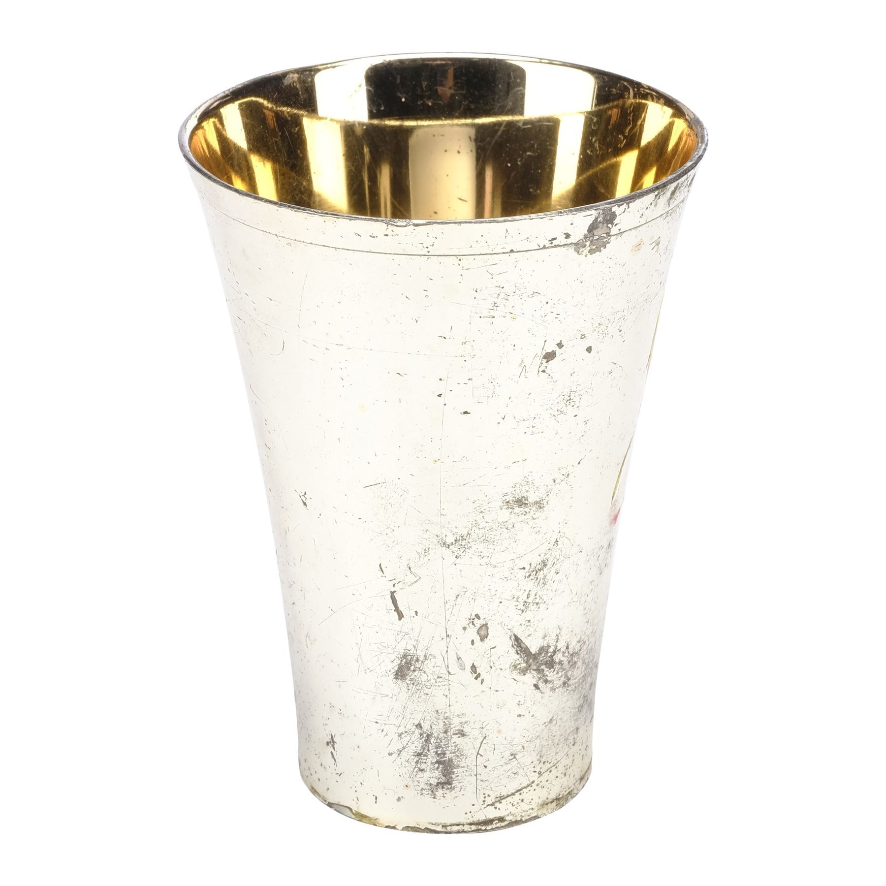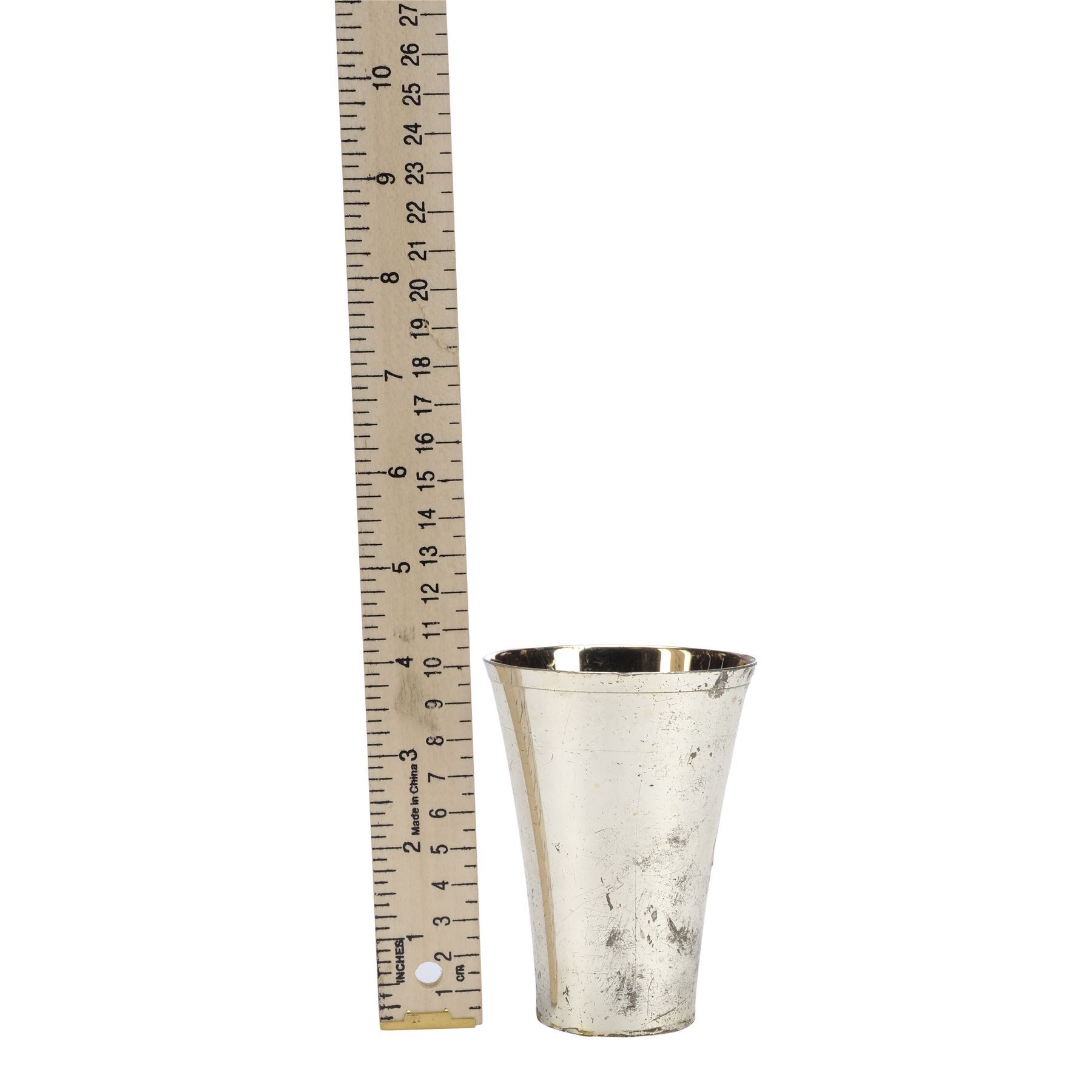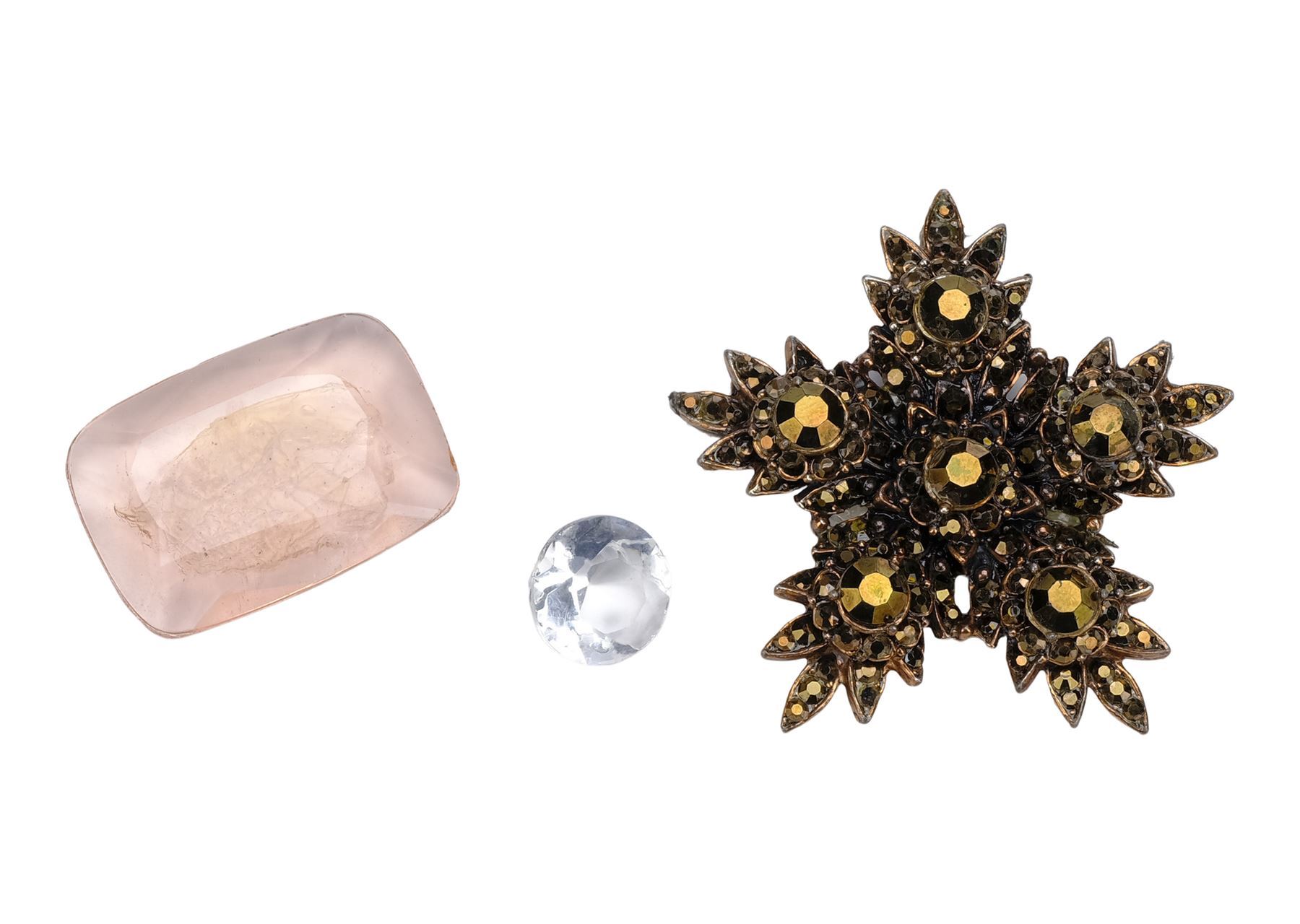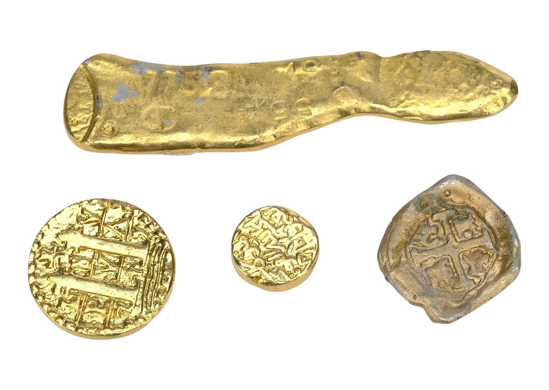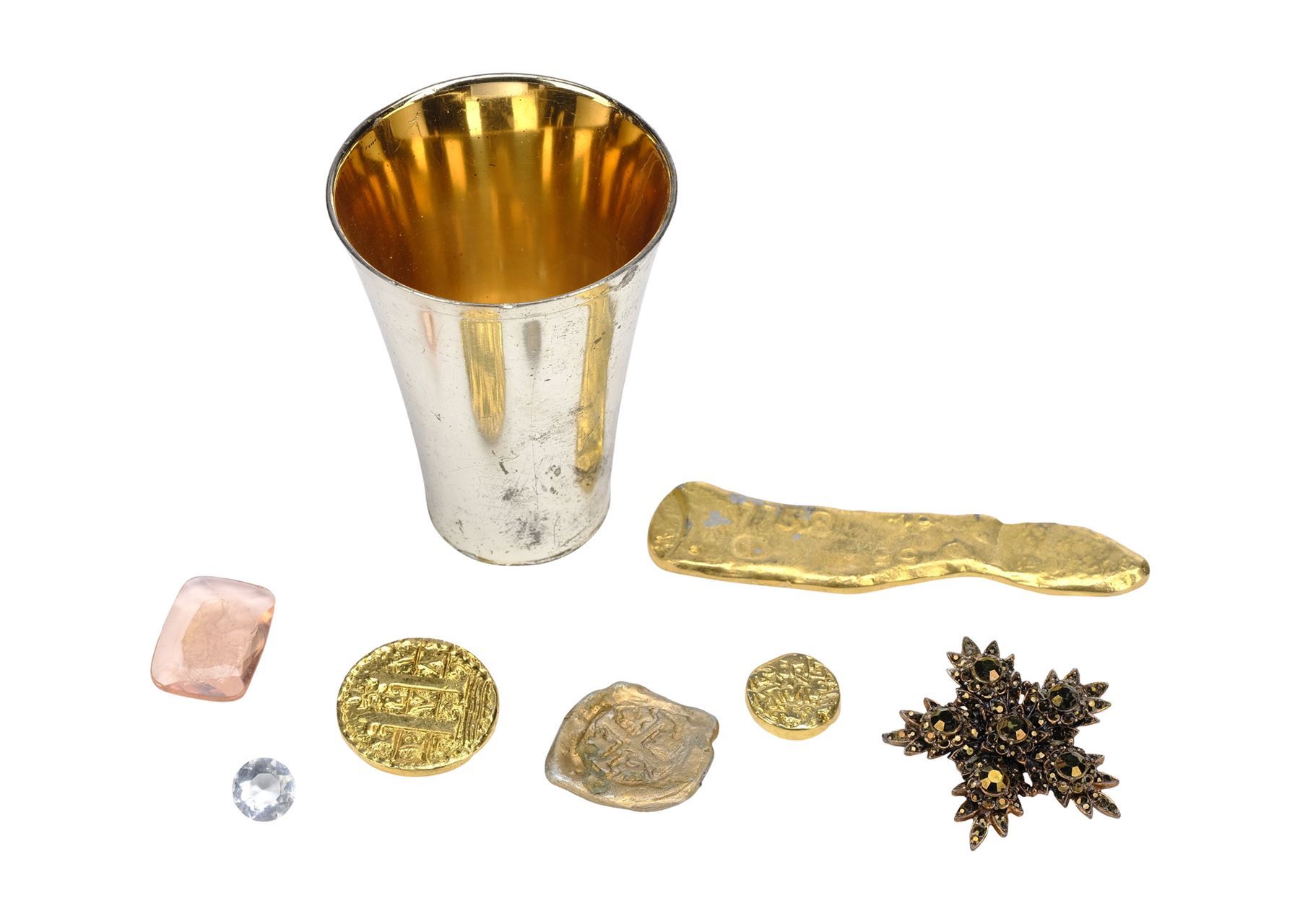 Created by and originally sourced from production, this collection consists of a small silver-color cup, a large "melted" gold-color metal piece, three Spanish crest detailed metal coins of various styles and sizes finished in gold-color paint, a faux diamond, a faux amethyst, and one dark brown bejeweled ornate metal broach. Production intentionally distressed the items to look aged and tarnished. This lot exhibits nicks, chipped paint, and glue residue from handling and production use. Dimensions: 4" x 3" x 3" (10.25 cm x 7.75 cm x 7.75 cm)