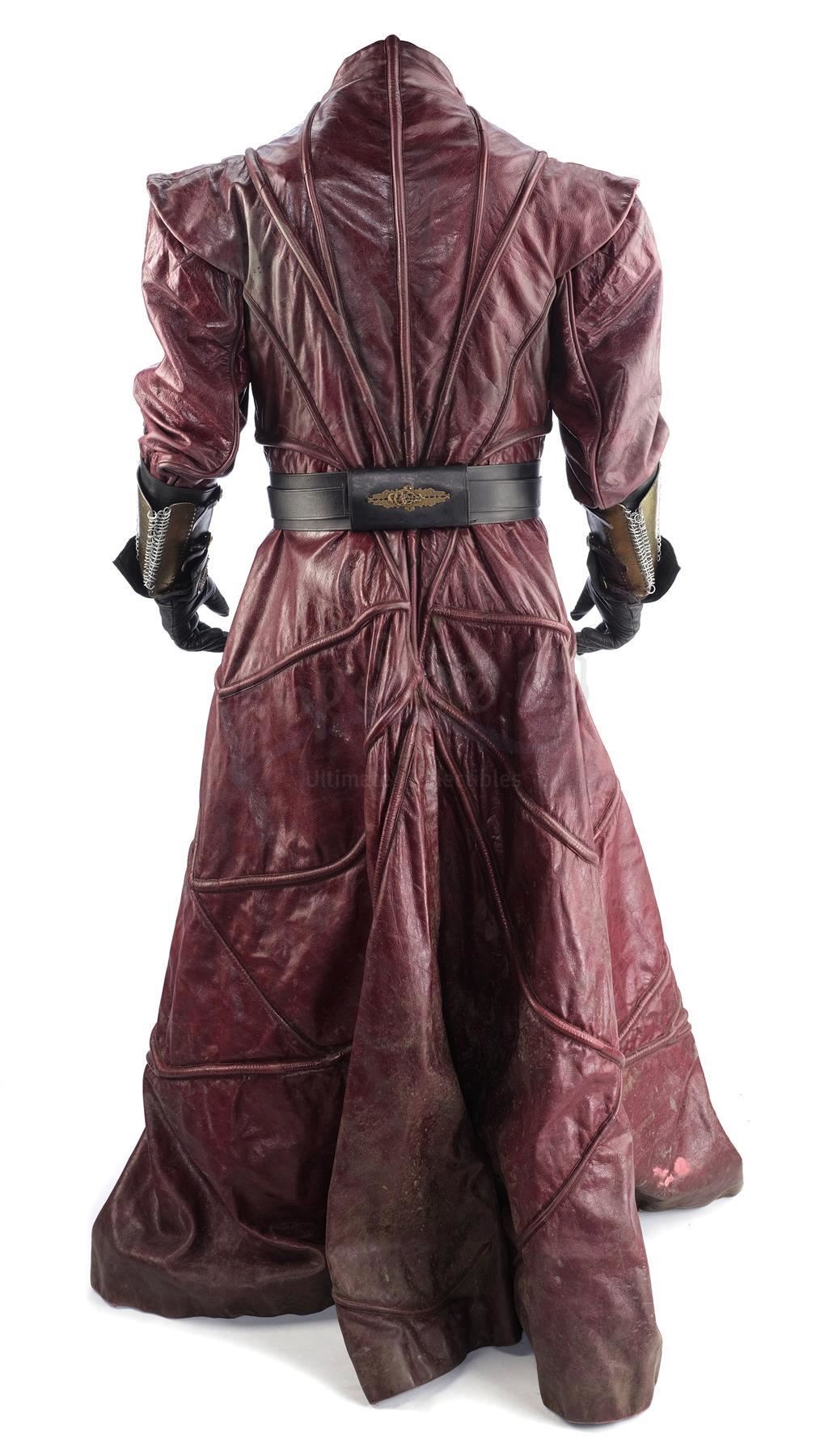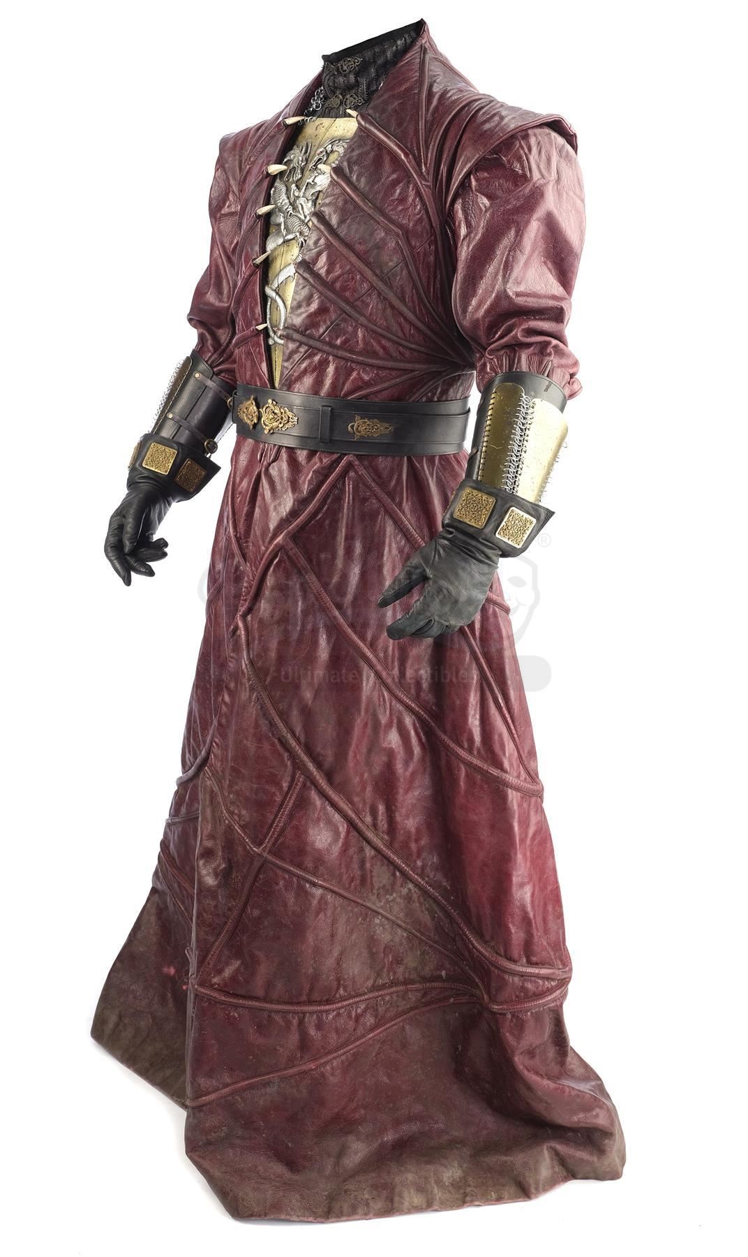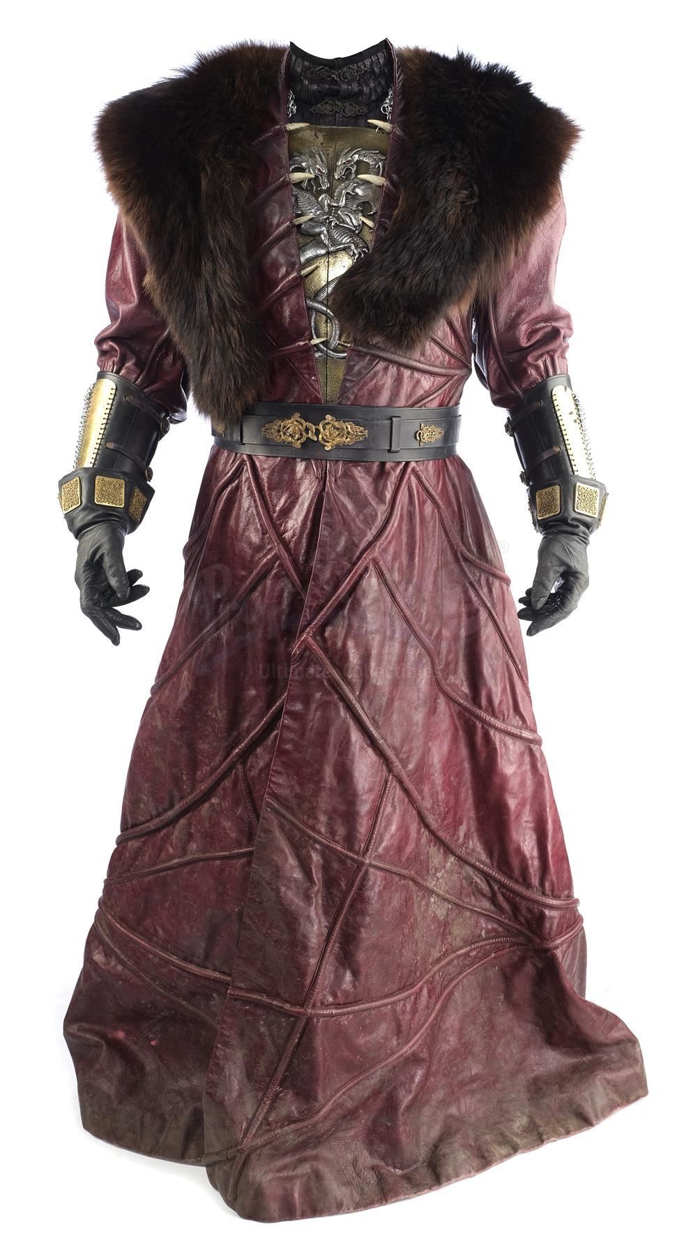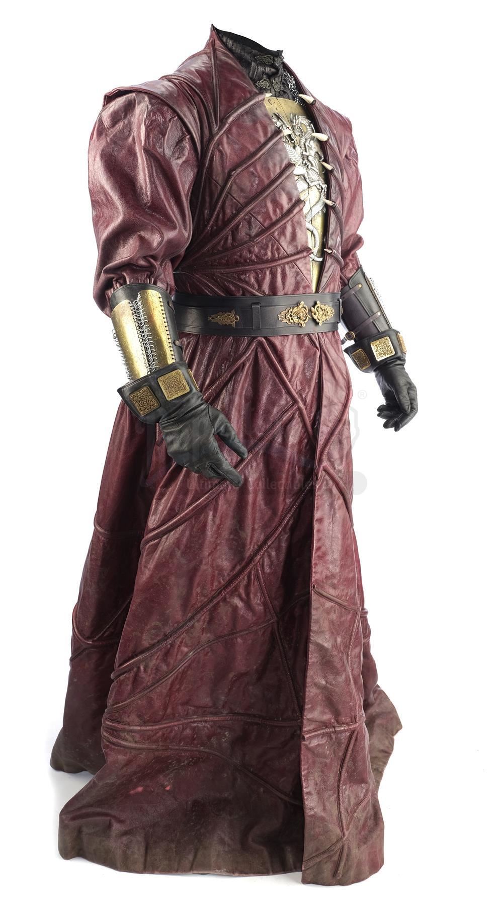 The costume consists of a dark red leather overcoat, a brown faux fur stole, a black and red ruffled fabric blend shirt, a goldtone and silvertone urethane armor chest plate with dragon insignias, a pair of black leather gloves with metallic details, a black leather and metal belt, black polyester-blend pants, a pair of black leather boot covers, and several wardrobe tags. The lot is in good overall condition with various signs of wear from production throughout.