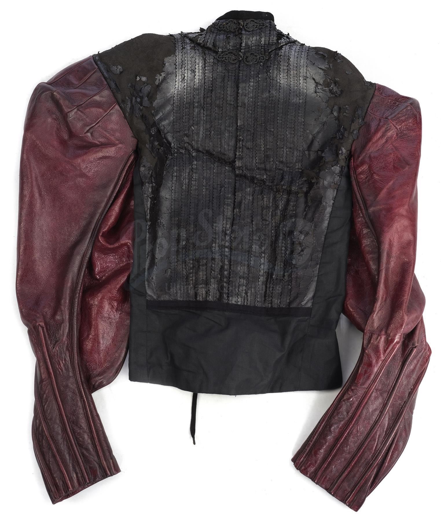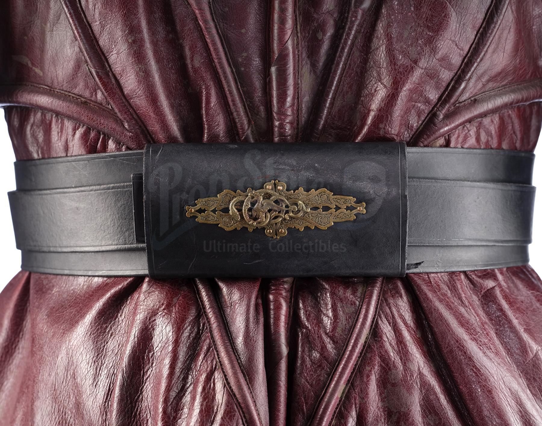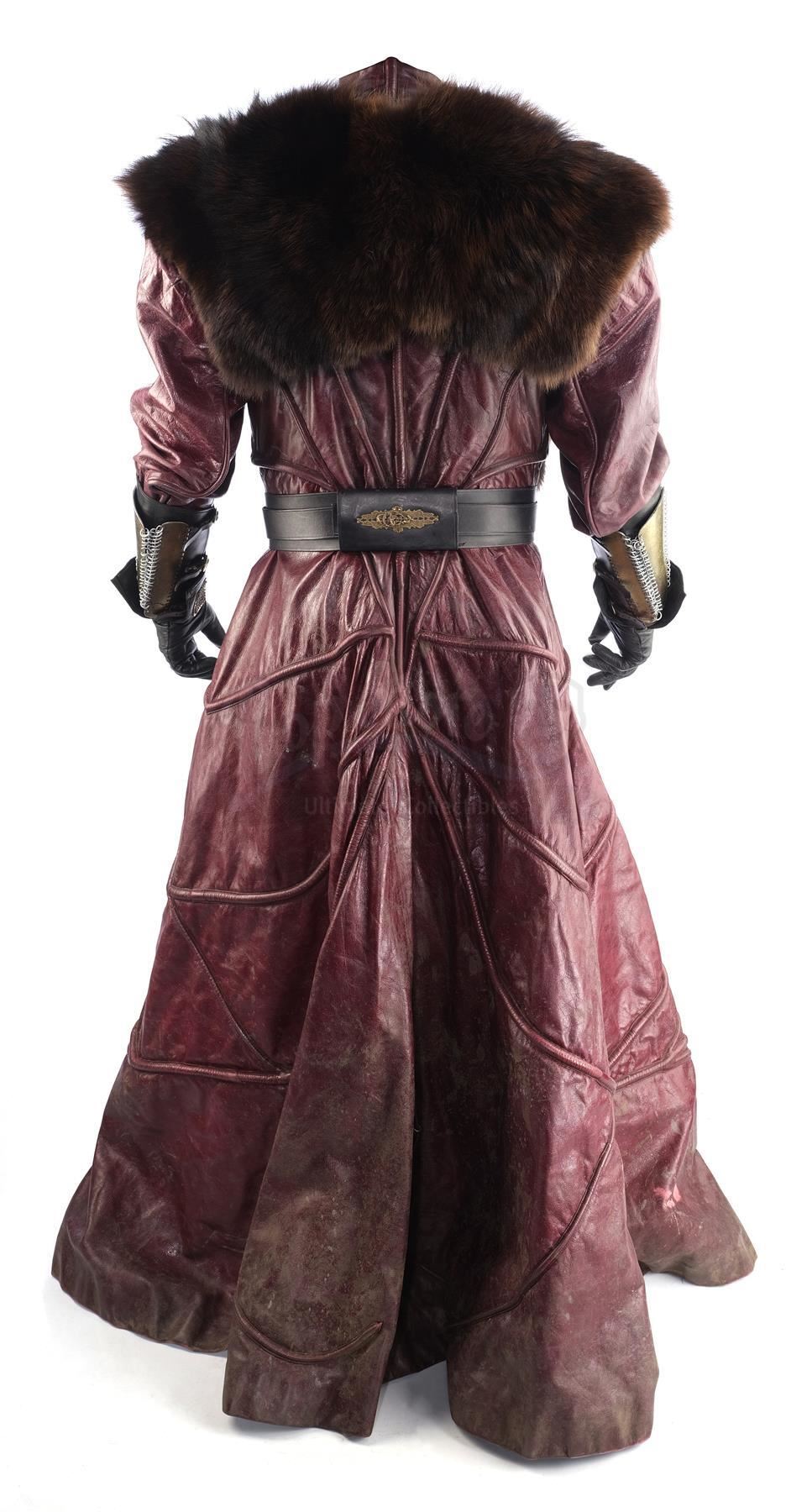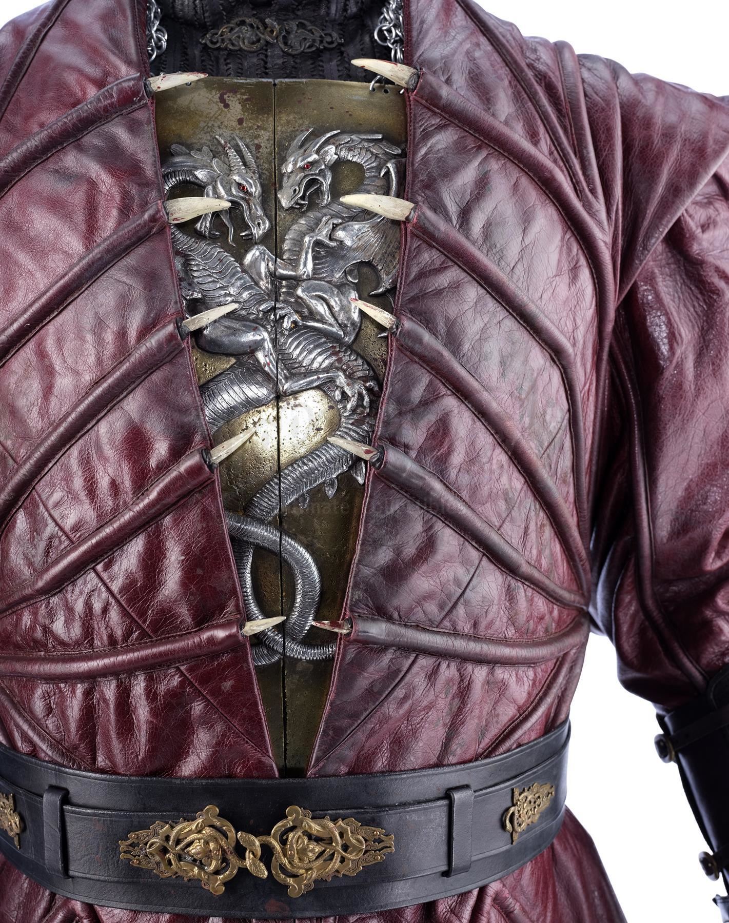 The costume consists of a dark red leather overcoat, a brown faux fur stole, a black and red ruffled fabric blend shirt, a goldtone and silvertone urethane armor chest plate with dragon insignias, a pair of black leather gloves with metallic details, a black leather and metal belt, black polyester-blend pants, a pair of black leather boot covers, and several wardrobe tags. The lot is in good overall condition with various signs of wear from production throughout.