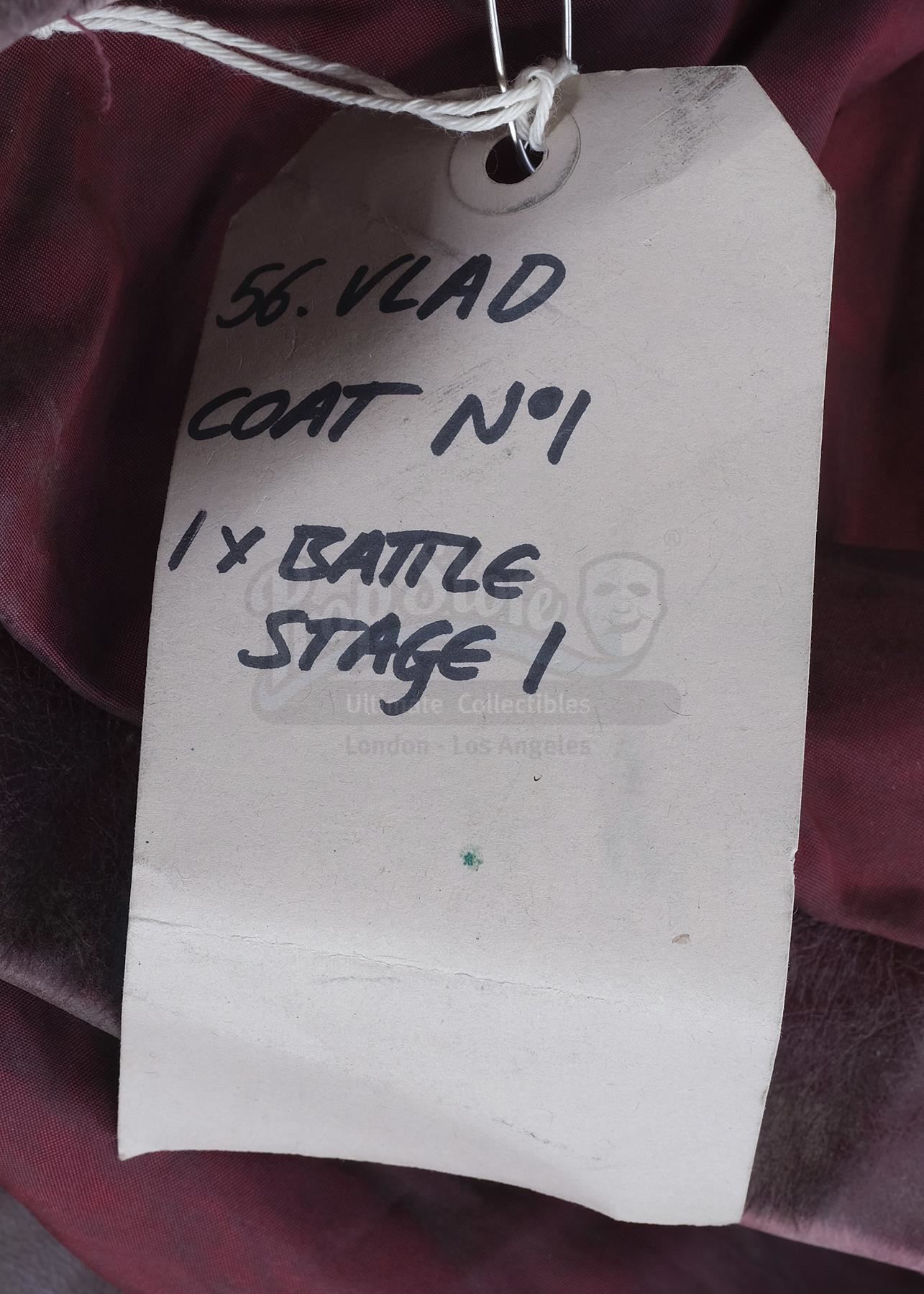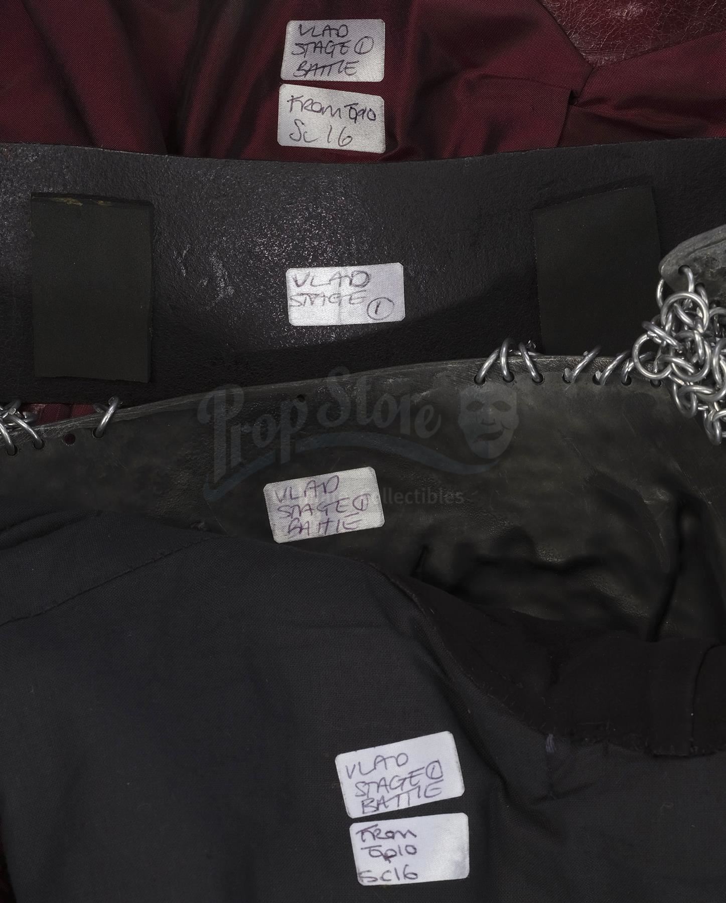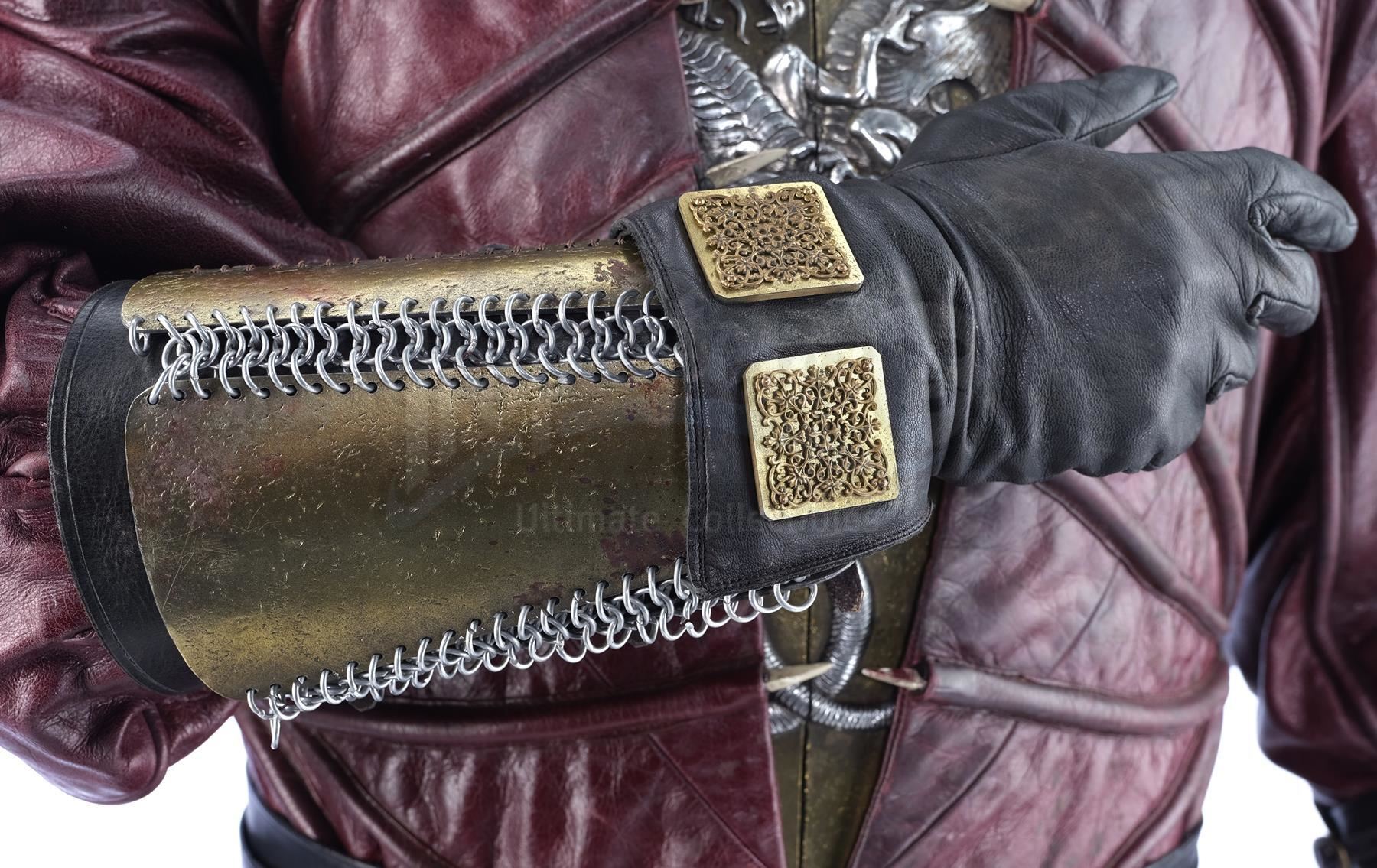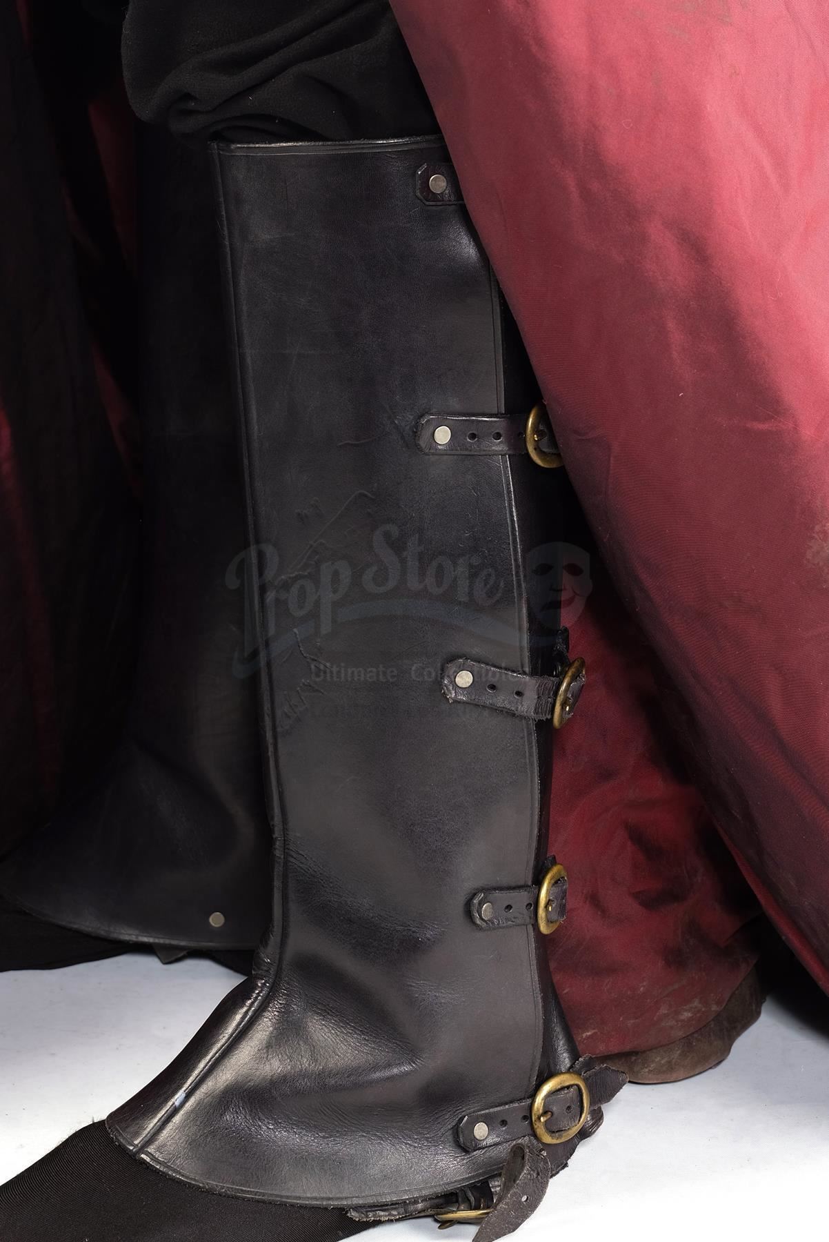 The costume consists of a dark red leather overcoat, a brown faux fur stole, a black and red ruffled fabric blend shirt, a goldtone and silvertone urethane armor chest plate with dragon insignias, a pair of black leather gloves with metallic details, a black leather and metal belt, black polyester-blend pants, a pair of black leather boot covers, and several wardrobe tags. The lot is in good overall condition with various signs of wear from production throughout.
