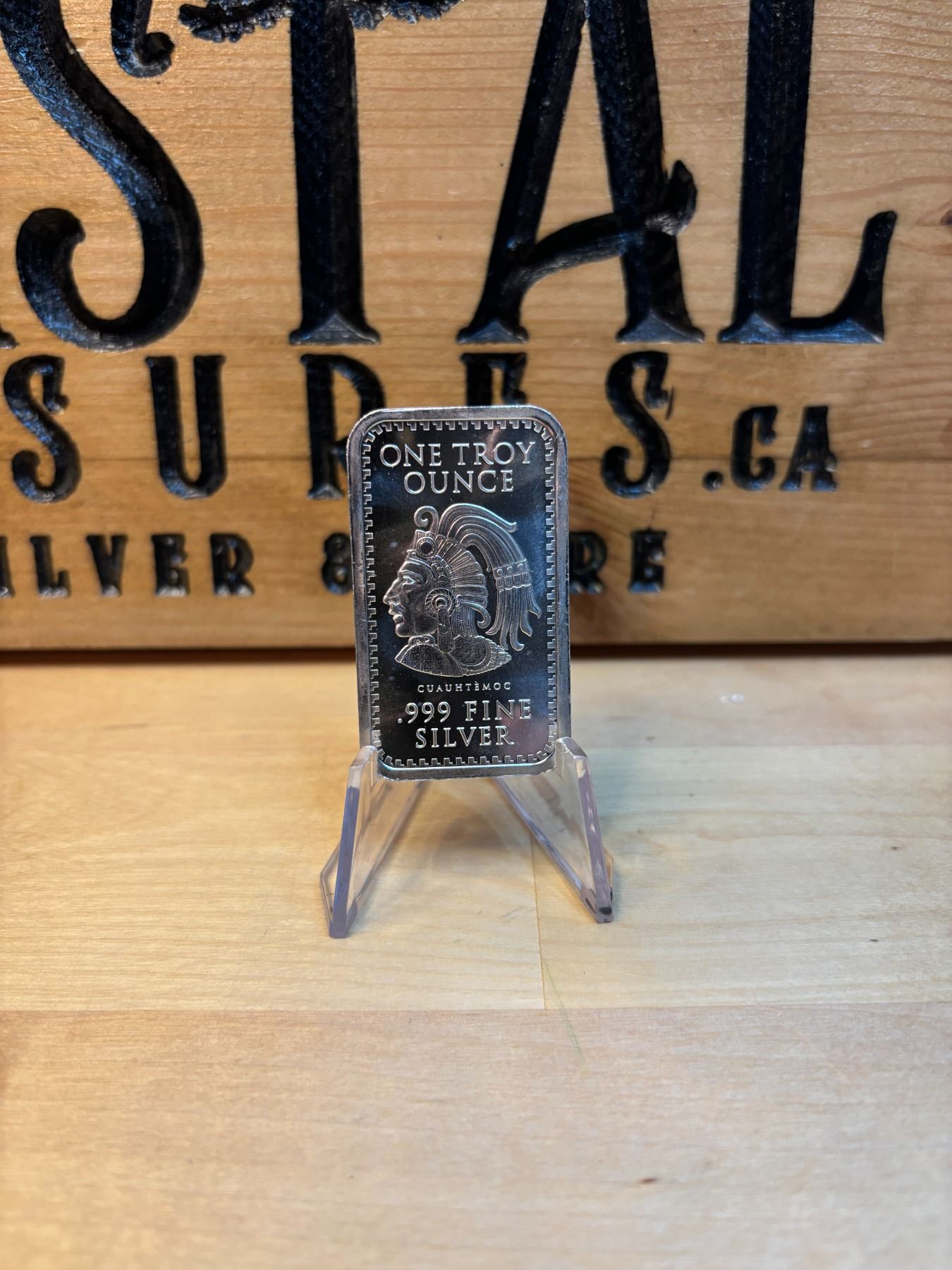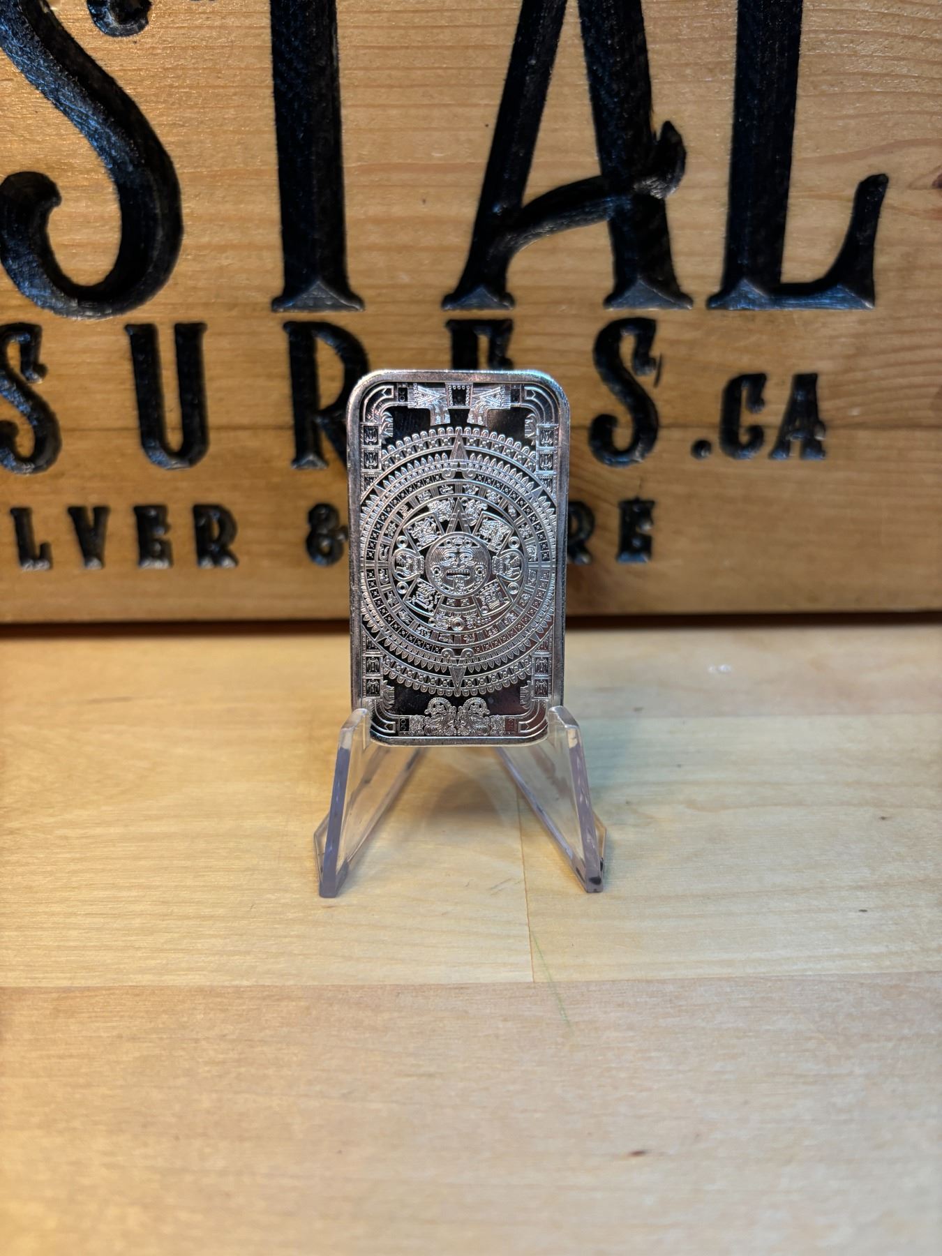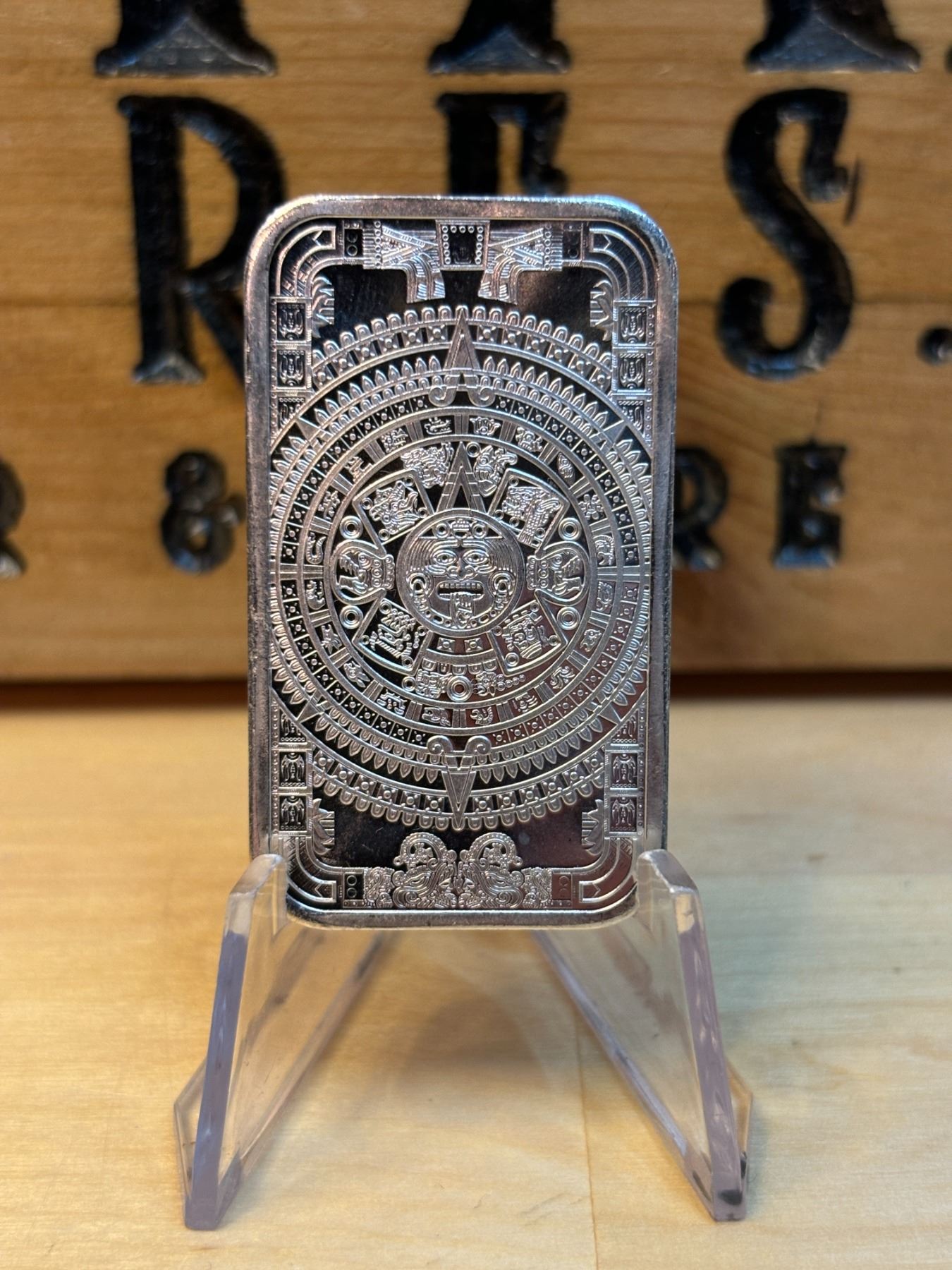 The 1 oz Aztec Calendar Silver Bar is a bullion bar that contains 1 ounce of .999 fine silver. It features a design based on the famous Aztec calendar stone, also known as the Sun Stone, which is a symbol of the Aztec civilization and represents the ancient Mesoamerican understanding of time and cosmology. The bar’s value is based on the silver content, but it may also carry a premium due to its intricate design, cultural significance, and appeal to collectors interested in ancient history or Mesoamerican art.