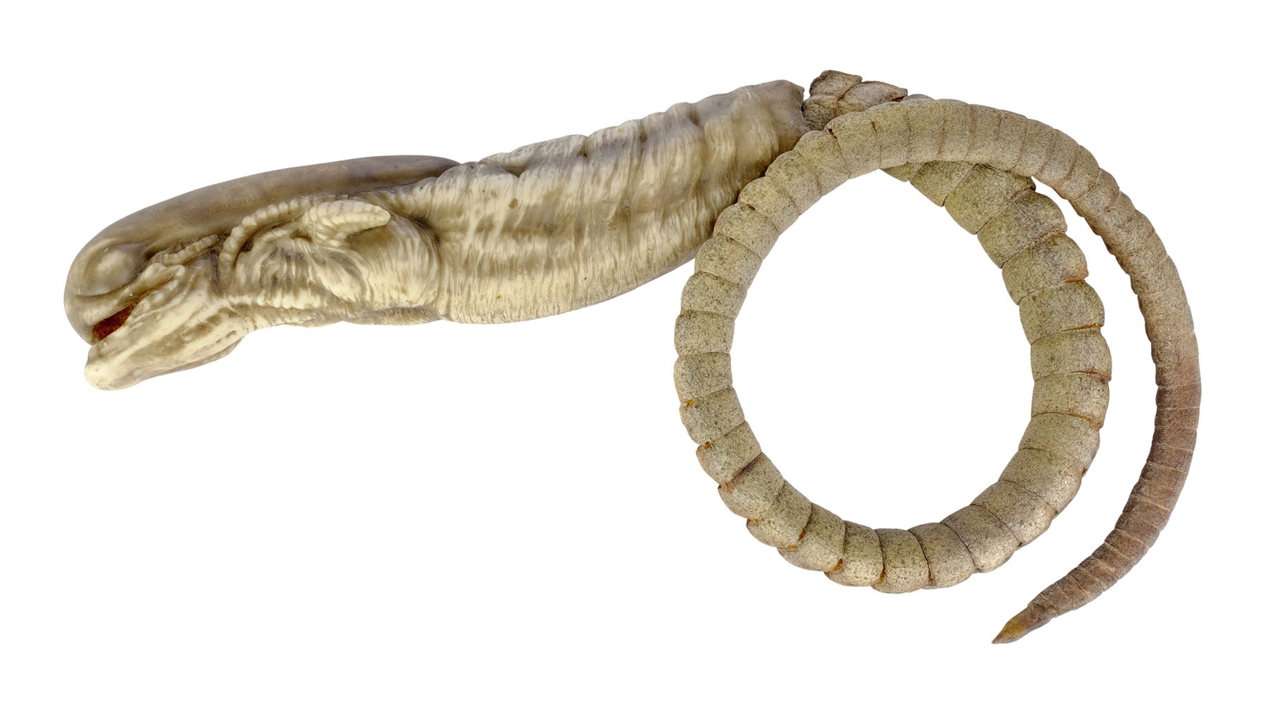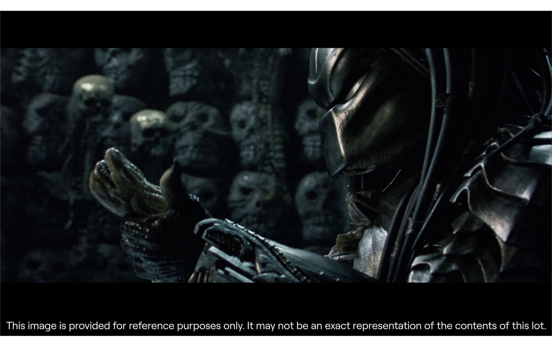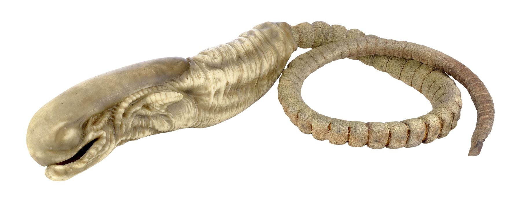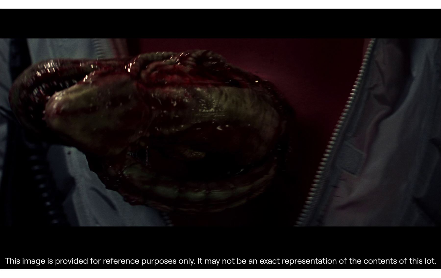 Designed for the film by Academy Award& reg;-winning special effects group Amalgamated Dynamics, Inc., this Chestburster features a head and body made of detailed painted silicone with a foam centre and interior wire; a loose extra long tail crafted from foam latex with a resin tip and a small wire inside which protrudes slightly from the base of the tail that allows for insertion into the foam back of the Chestburster's body; and a pair of grey resin teeth. The Chestburster exhibits some wear, including cracking in the foam. Dimensions: 35.75 cm x 23 cm x 9 cm (14" x 9" x 3.5")