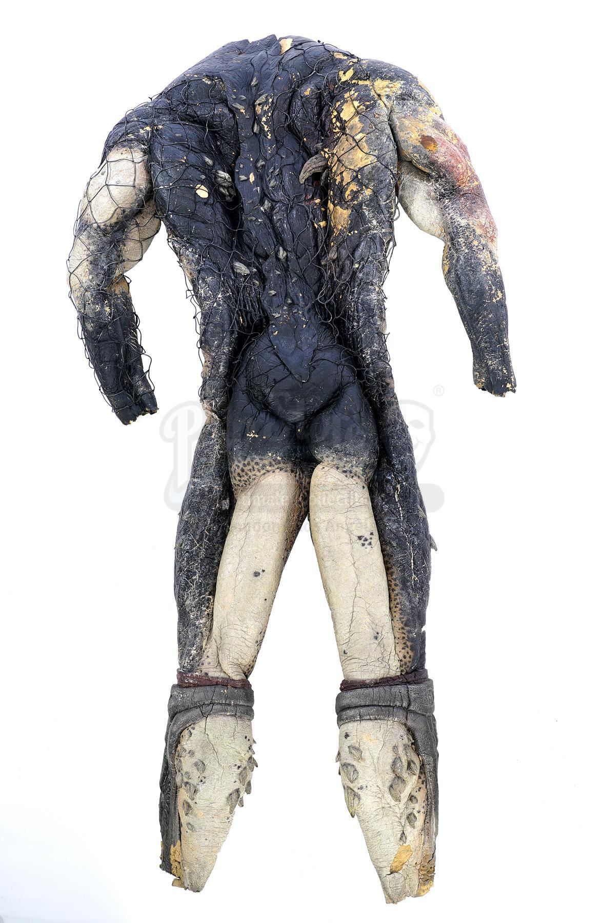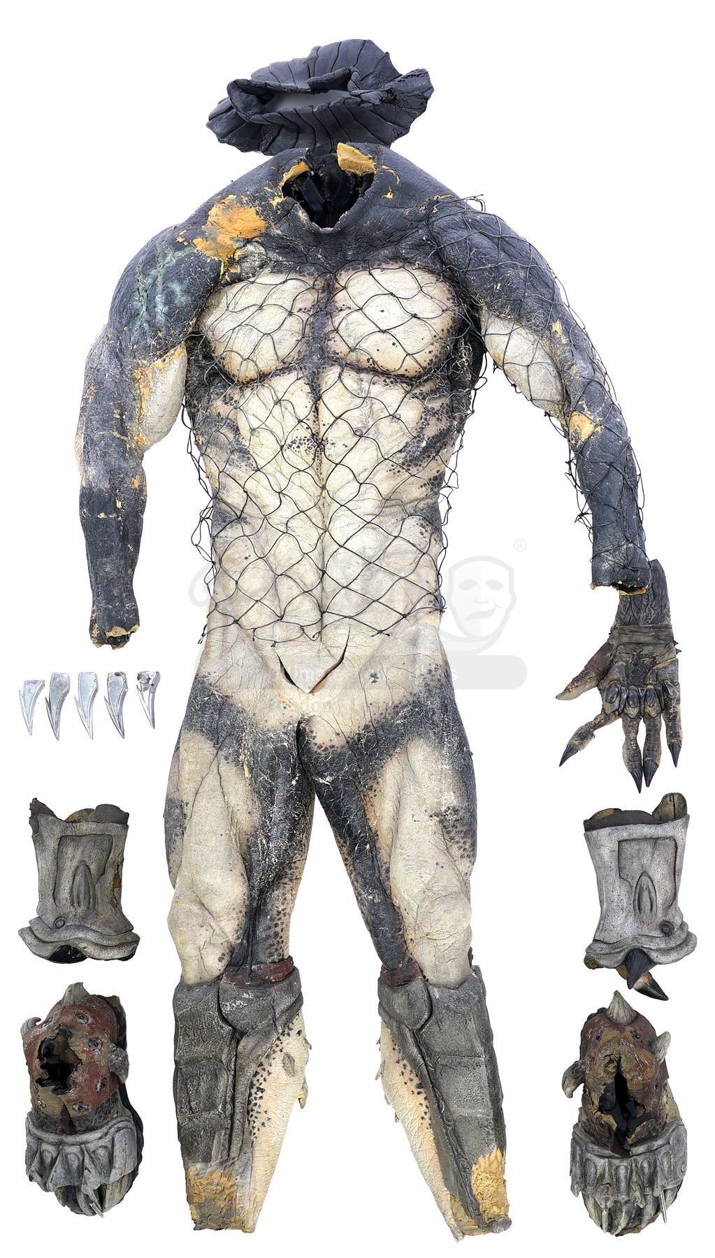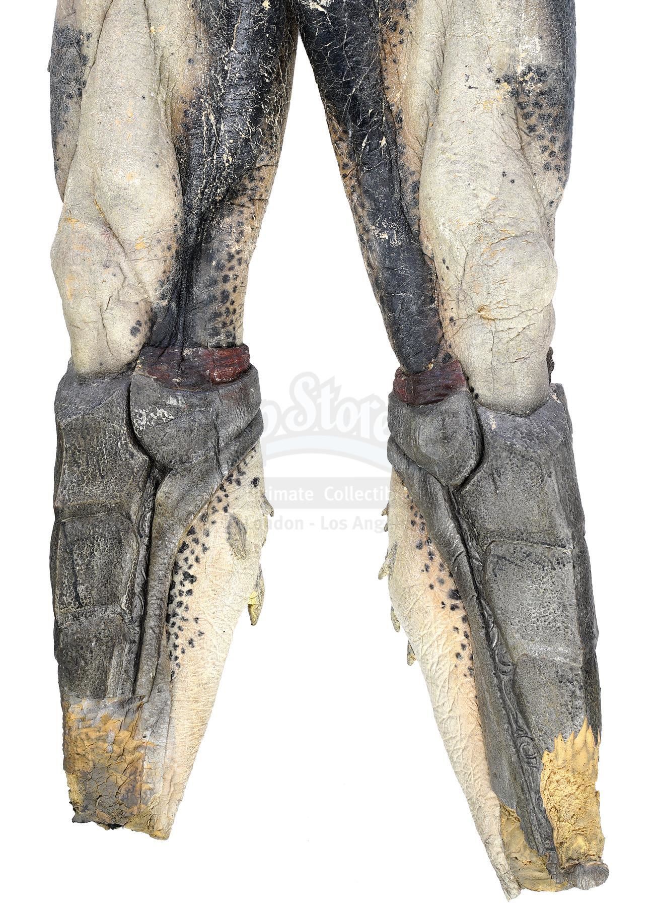 This lot will be auctioned on Tuesday, June 29th. The auction will begin at 9:00am PDT and lots are sold sequentially via live auctioneer; tune in to the live streaming broadcast on auction day to follow the pace. Note other lots in the auction may close on June 30th or July 1st. A set of Wolf (Ian Whyte) Predator costume components from Colin and Greg Strause' sci-fi horror sequel Alien vs. Predator: Requiem. The "cleaner" Yautja known as Wolf traveled to Gunnison, Colorado to address an accidental xenomorph outbreak following the events of Paul W.S. Anderson's Alien vs. Predator. This full-size costume consists of pieces created by Academy Award-winning special effects group Amalgamated Dynamics, Inc. (ADI). It includes a mottled green, yellow, and brown foam latex skin zip-up bodysuit with Wolf's personalized netting; a gray foam rubber stunt neck collar attachment; a green, yellow, and brown latex left glove with plastic black nail accents; a pair of silver-color foam rubber shin guards with claw accents and ankle closures; a pair of rubber and foam feet with snap-button silver-color resin toe blades affixed; and several extra loose resin toe blades. It exhibits signs of use and wear throughout, including aging on the foam elements and missing pieces, but remains in fair overall condition. Estimate: $5,000 - 7,000