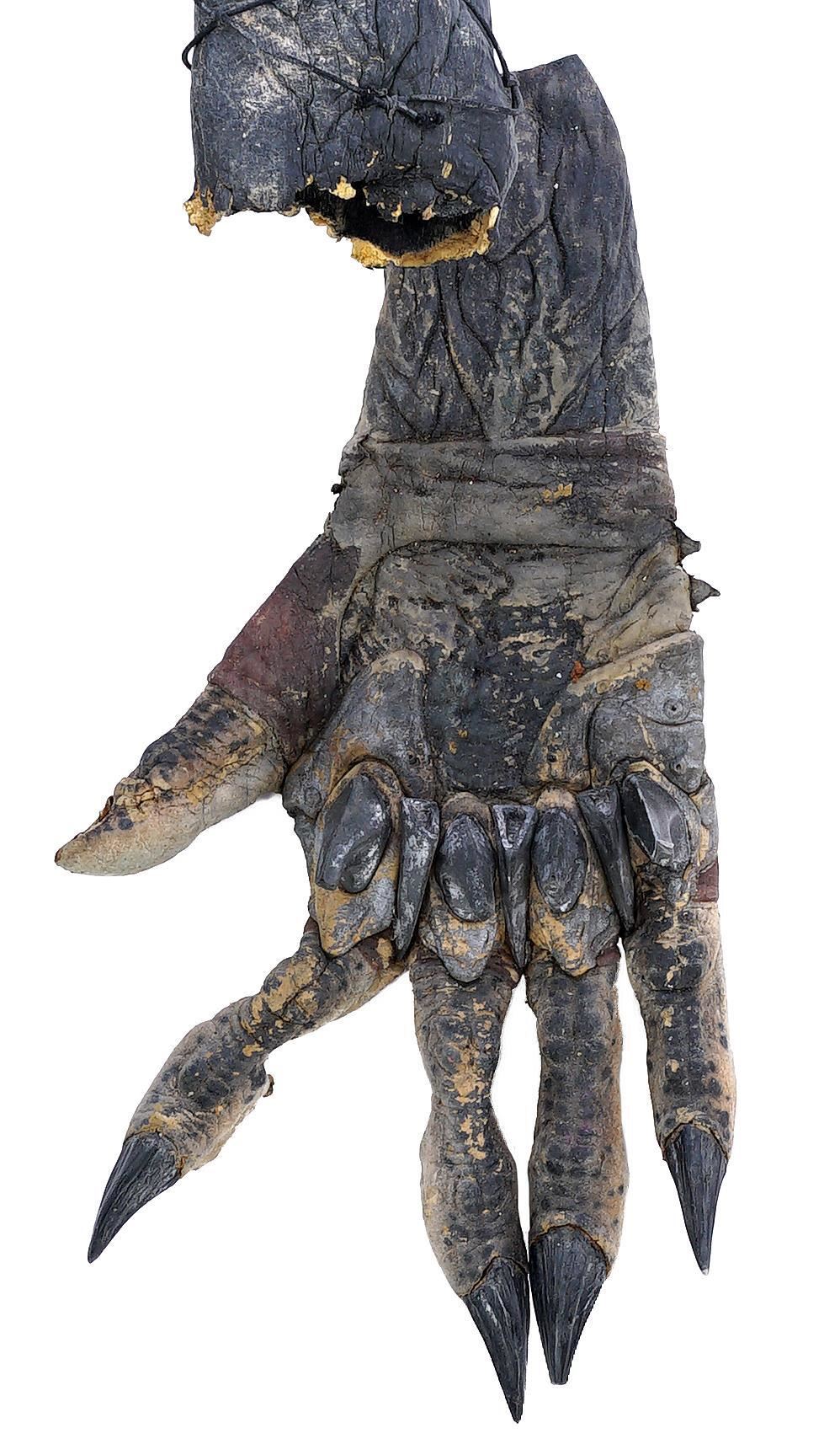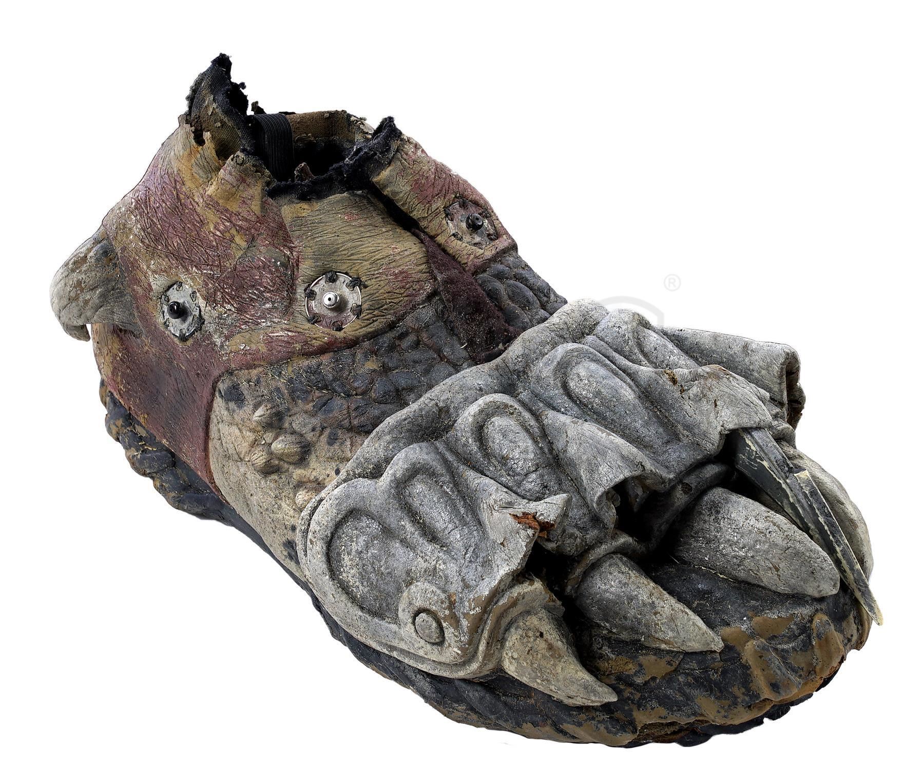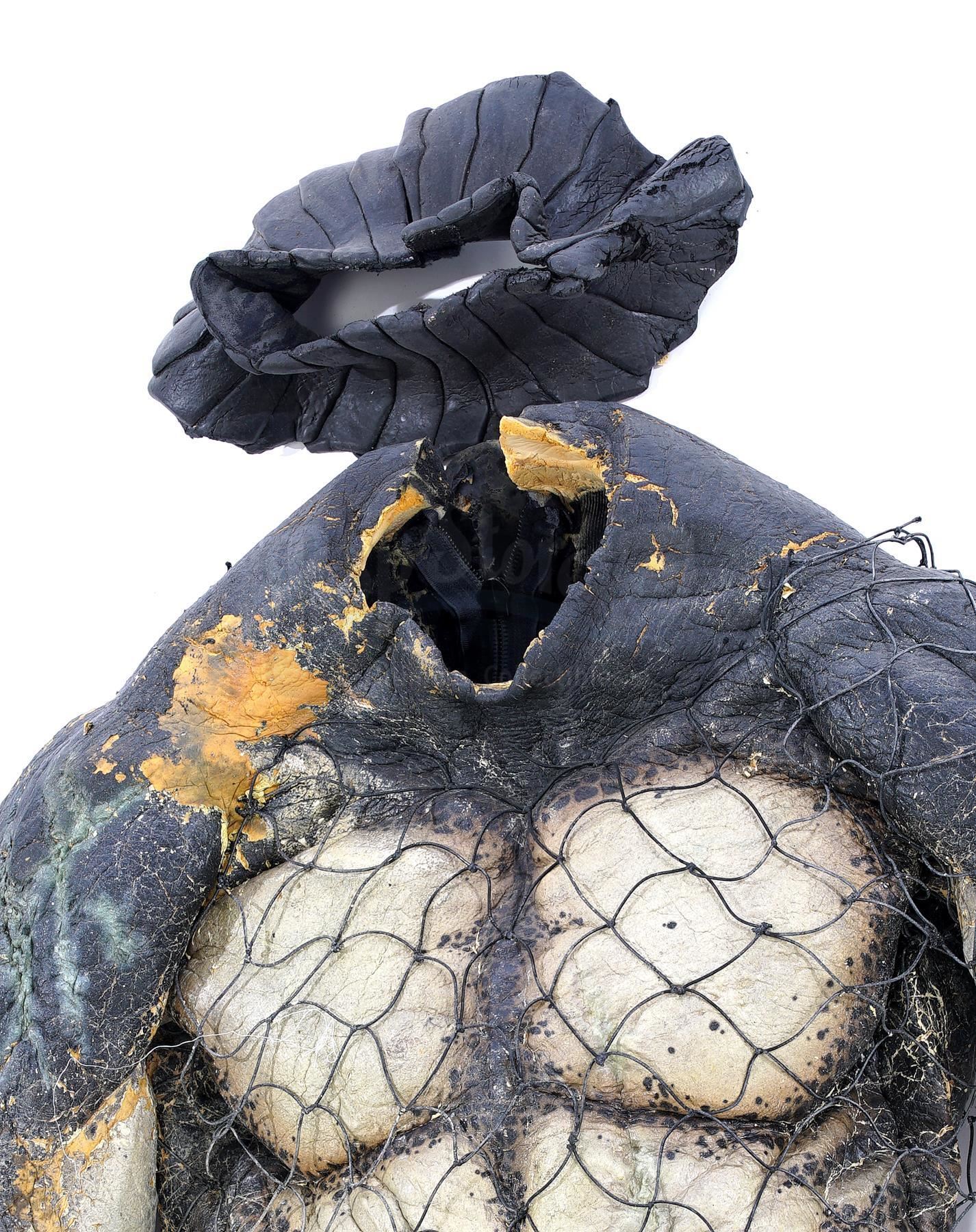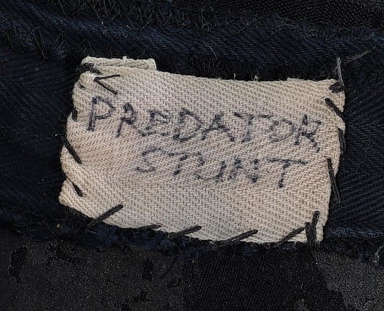 This lot will be auctioned on Tuesday, June 29th. The auction will begin at 9:00am PDT and lots are sold sequentially via live auctioneer; tune in to the live streaming broadcast on auction day to follow the pace. Note other lots in the auction may close on June 30th or July 1st. A set of Wolf (Ian Whyte) Predator costume components from Colin and Greg Strause' sci-fi horror sequel Alien vs. Predator: Requiem. The "cleaner" Yautja known as Wolf traveled to Gunnison, Colorado to address an accidental xenomorph outbreak following the events of Paul W.S. Anderson's Alien vs. Predator. This full-size costume consists of pieces created by Academy Award-winning special effects group Amalgamated Dynamics, Inc. (ADI). It includes a mottled green, yellow, and brown foam latex skin zip-up bodysuit with Wolf's personalized netting; a gray foam rubber stunt neck collar attachment; a green, yellow, and brown latex left glove with plastic black nail accents; a pair of silver-color foam rubber shin guards with claw accents and ankle closures; a pair of rubber and foam feet with snap-button silver-color resin toe blades affixed; and several extra loose resin toe blades. It exhibits signs of use and wear throughout, including aging on the foam elements and missing pieces, but remains in fair overall condition. Estimate: $5,000 - 7,000