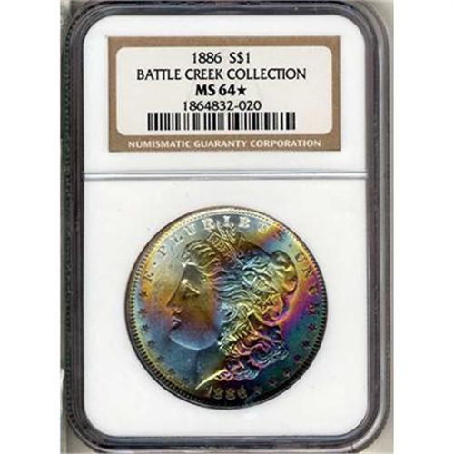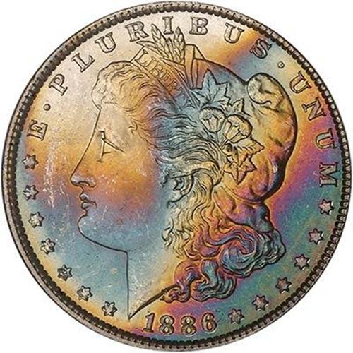 1886 Morgan Dollar. Swirling color throughout, across, and enveloping the obverse side, with fresh mint frost below projecting the colors outward. The relationship between these colors, rather than becoming strained as in some unbalanced dollars with so-so toning, are in complete agreement and harmony, which is why the coin will likely trade for a strong premium over what a "white" lustrous specimen might trade for in the same grade. (#7166)<p><i>from The Battle Creek Collection, Part III</i>