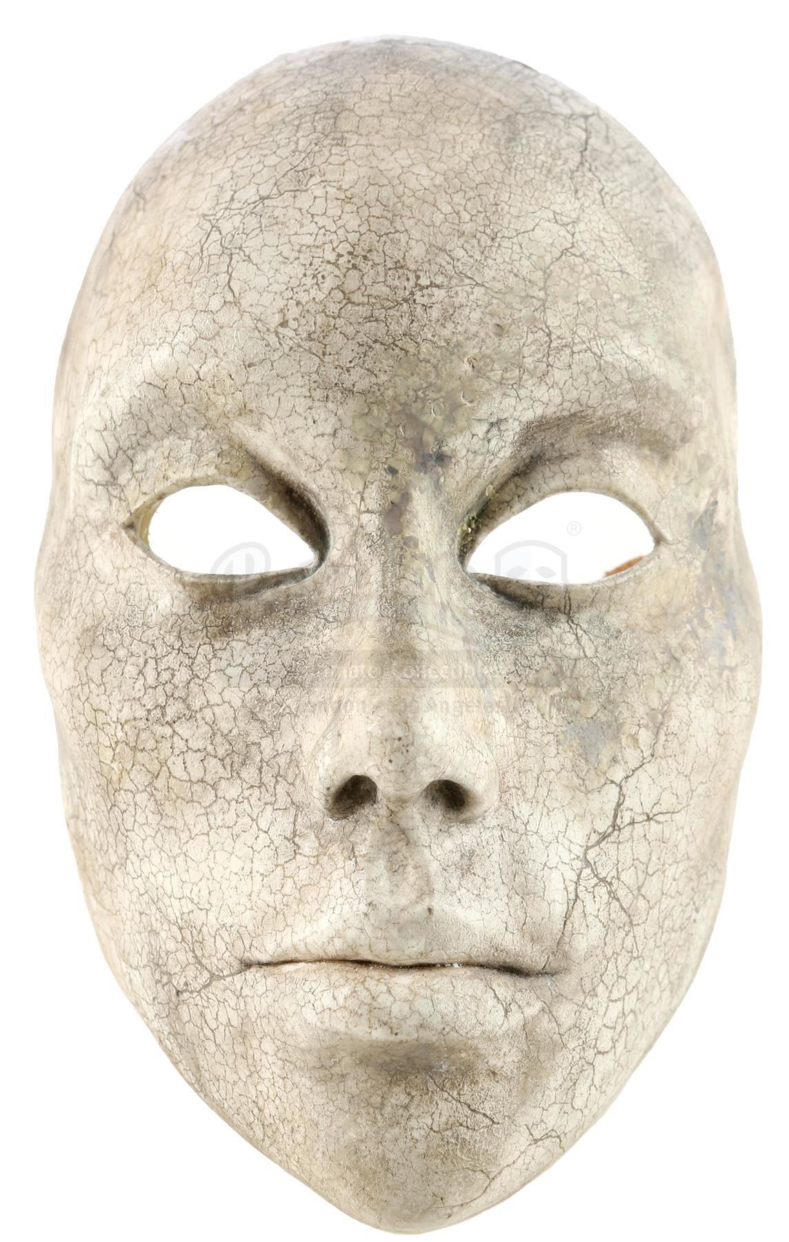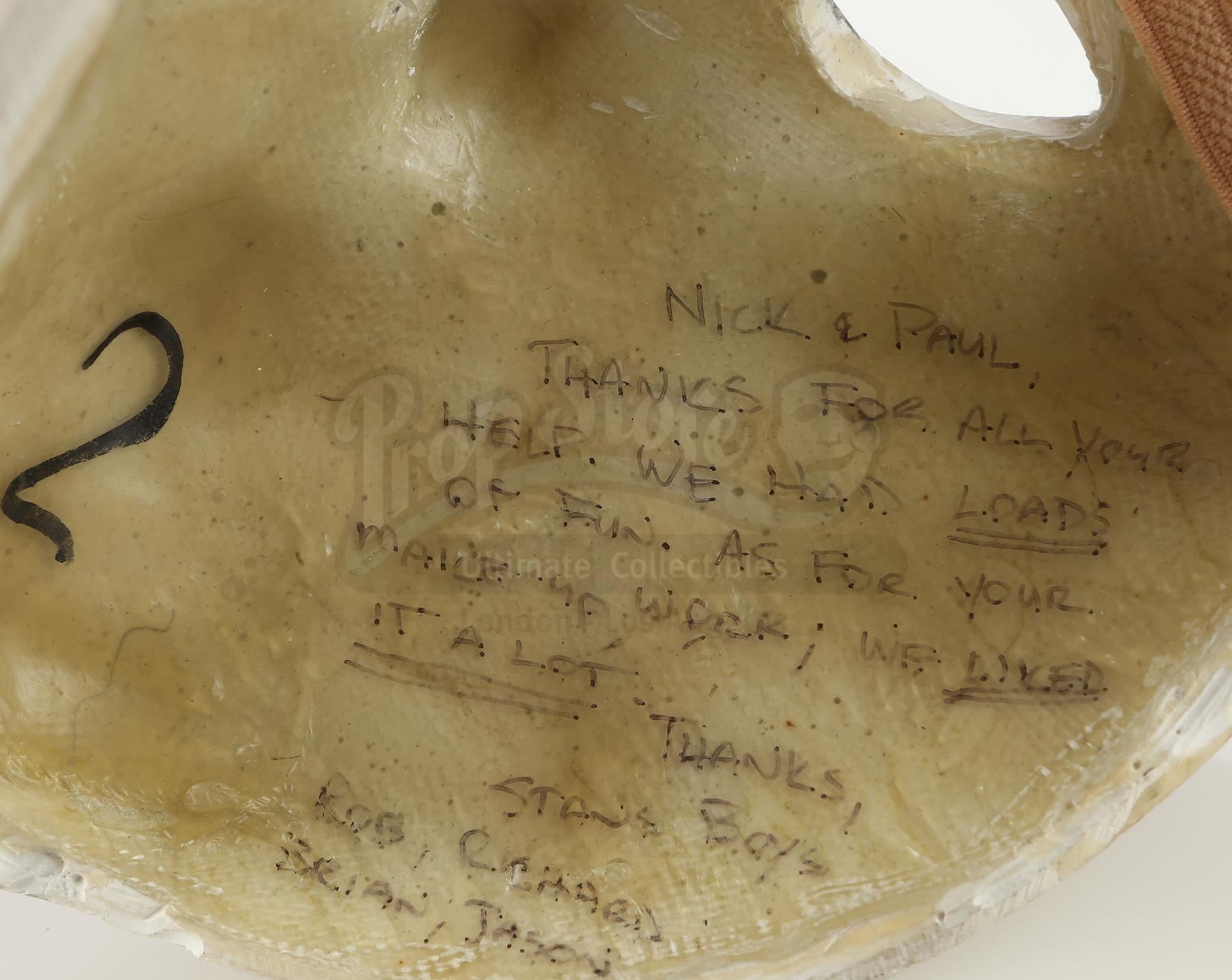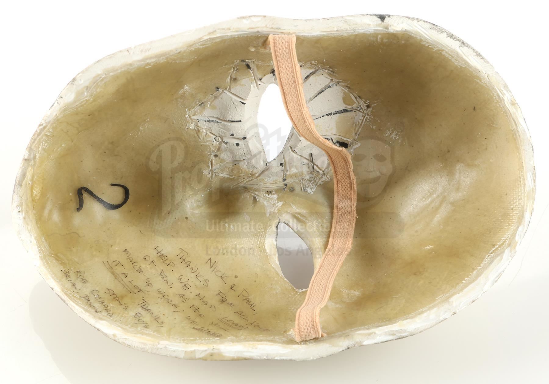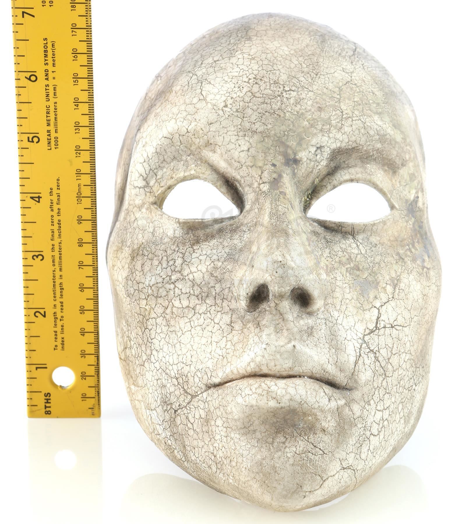 This mask, fabricated by Steve Wang Studio with updates from Stan Winston Studio, comes from an SFX makeup artist on the film. It is constructed of hand-painted and aged white plaster with fiberglass backing and an elastic strap. The mask is marked "2" and inscribed with a note of thanks from Stan Winston Puppeteers on back. It is in excellent overall condition with minor signs of wear from production. Dimensions: 9" x 6" x 4 1/2" (23 cm x 15.25 cm x 11.5 cm)