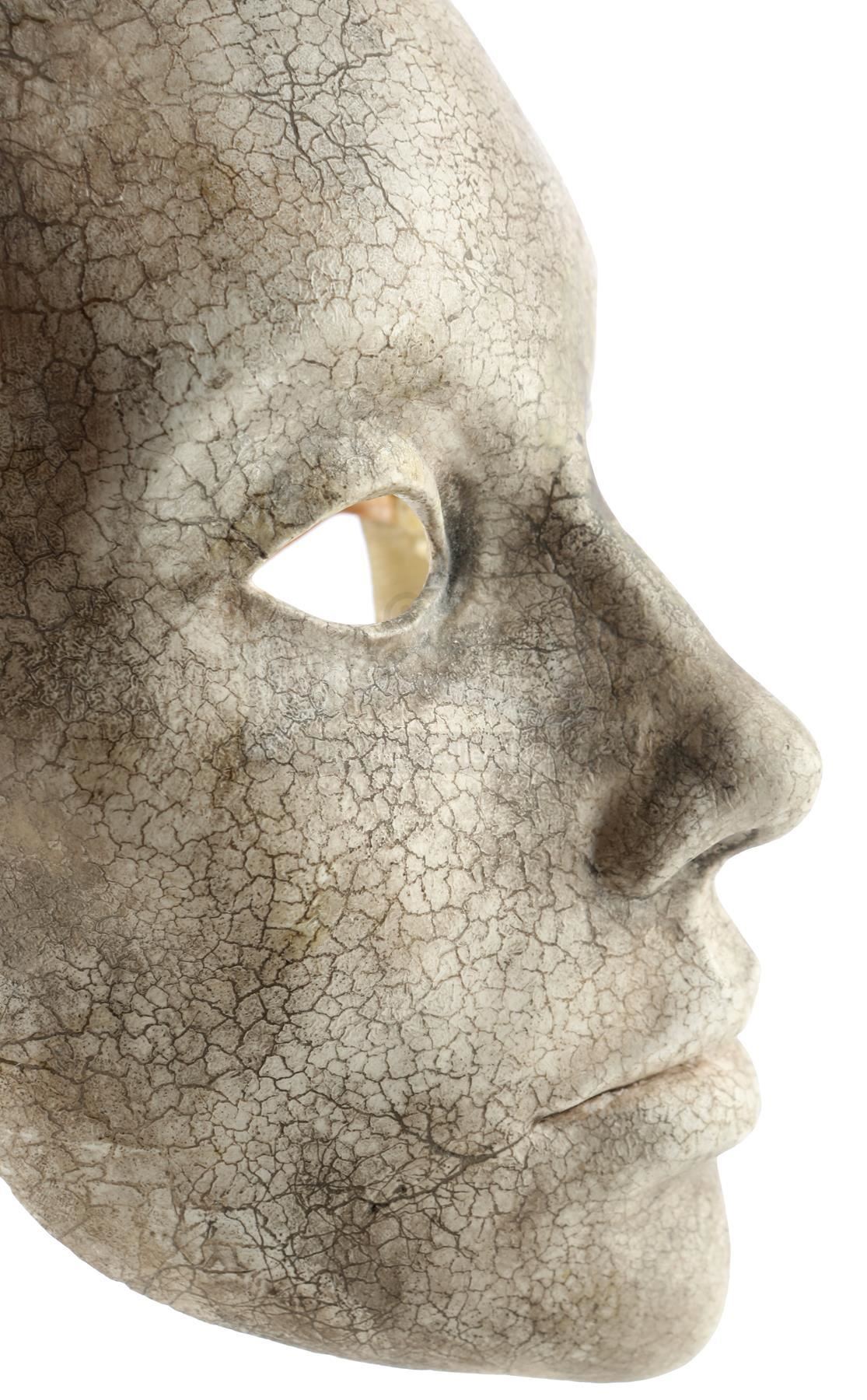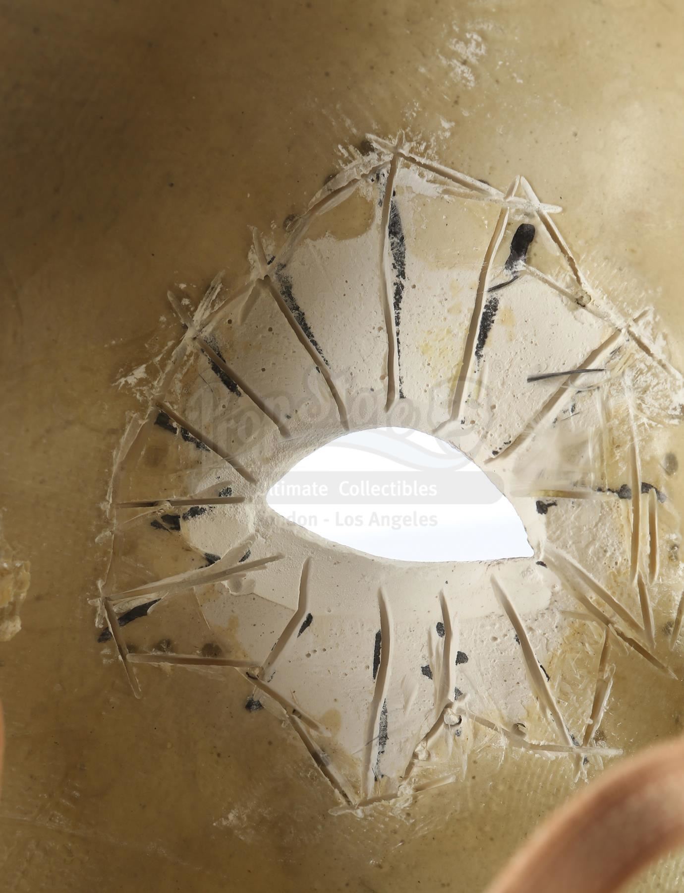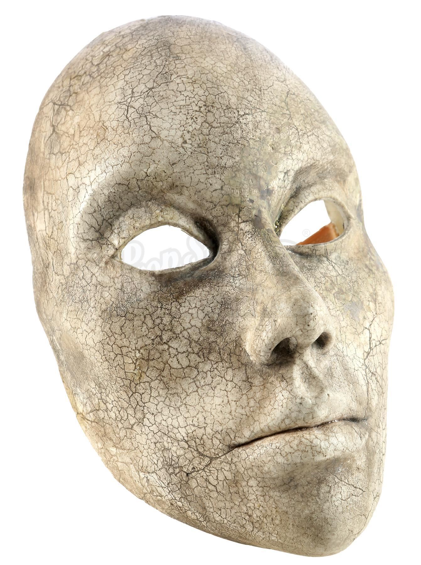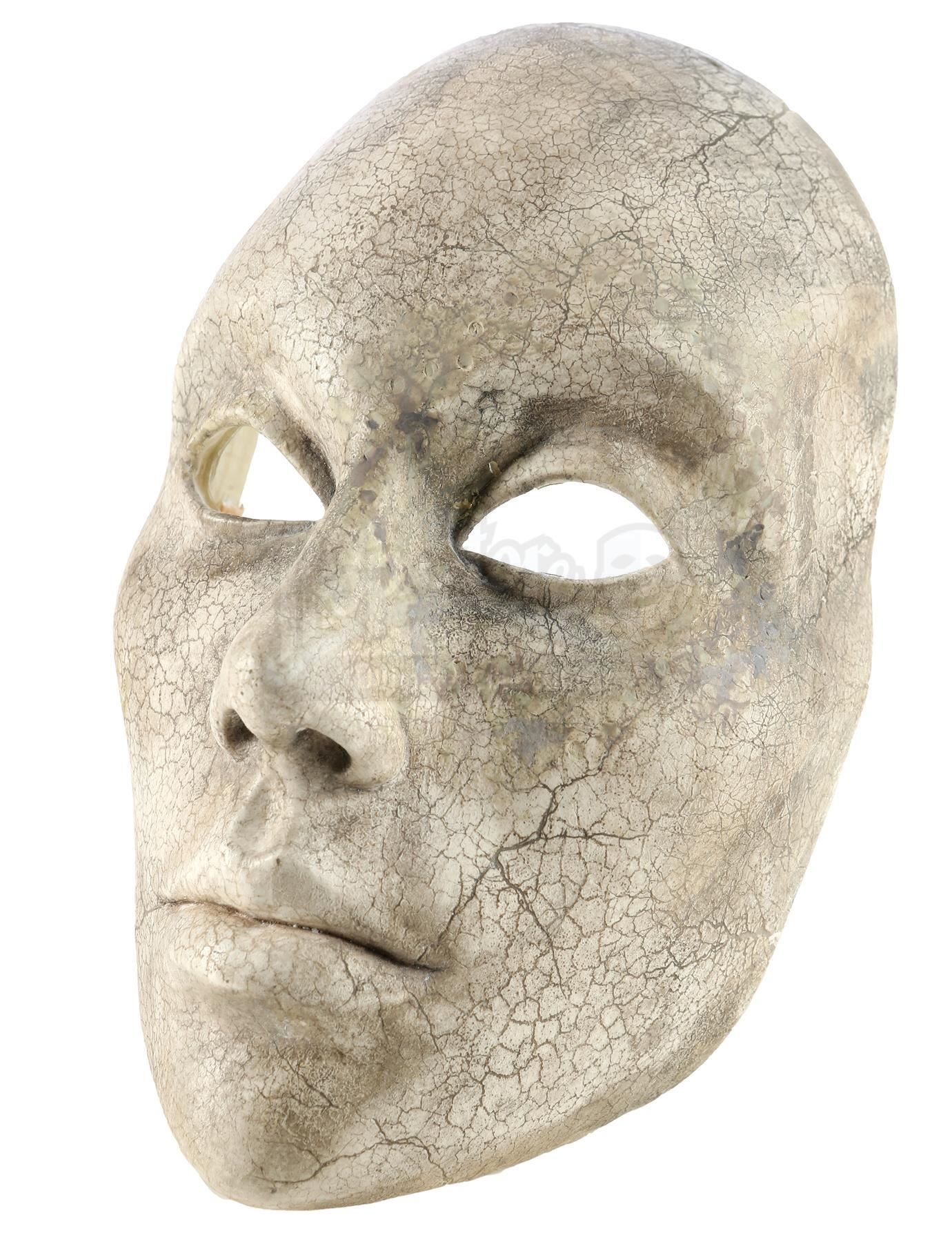 This mask, fabricated by Steve Wang Studio with updates from Stan Winston Studio, comes from an SFX makeup artist on the film. It is constructed of hand-painted and aged white plaster with fiberglass backing and an elastic strap. The mask is marked "2" and inscribed with a note of thanks from Stan Winston Puppeteers on back. It is in excellent overall condition with minor signs of wear from production. Dimensions: 9" x 6" x 4 1/2" (23 cm x 15.25 cm x 11.5 cm)