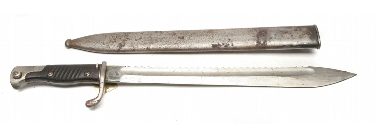 German WW1 model S98/05 "butcher blade" bayonet - saw back - freckling on blade - right ricasso marked with Henckels symbol - German crown proof on spine - 19.75" overall, 14.5" blade - crown proof on pommel - rust on crossguard - freckling on pommel - grooved wood handles with wear - later style metal scabbard with rust - numbered brass tag - non-ffl - 25CRRMA060
