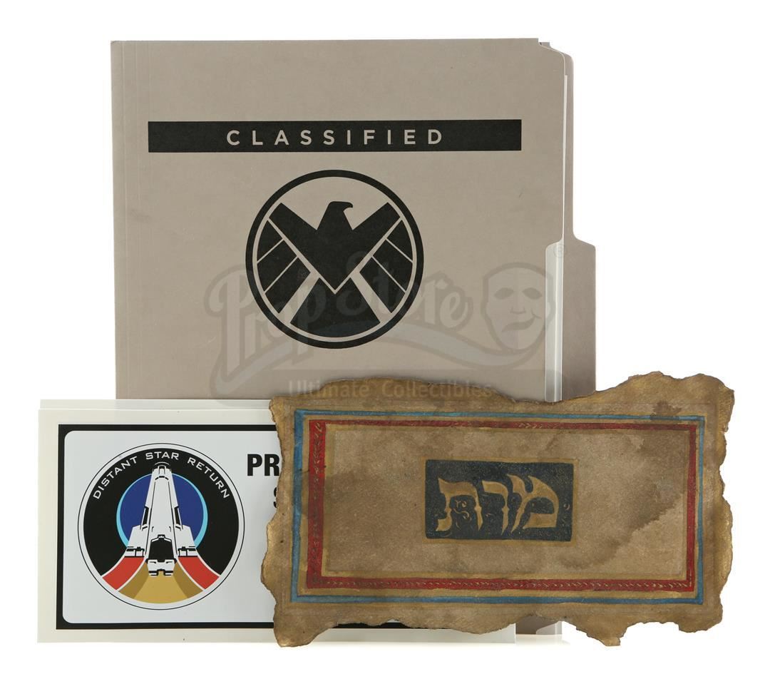 A set of Project Distant Star Return paperwork from Season 3 of Marvel's Agents of S.H.I.E.L.D. Using the codename Project Distant Star Return, agents of Hydra led by Gideon Malick and Grant Ward conspire to bring Hive to Earth throughout the season. This set consists of four printed pages showing the evolution of the Hydra logo, a gray S.H.I.E.L.D. folder labeled 'Classified', two unpeeled color Project Distant Star Return stickers, and a paper scroll fragment with 'Mavet' printed in Hebrew on front. The set is in good overall condition with the scroll intentionally torn and stained by production to look ancient.