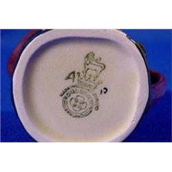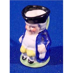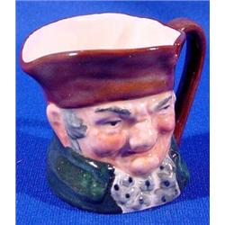 Three (3) Pc.- 1 Jug & 2 Pitchers; Royal Doulton Character Jug and Two German Miniature Character Pitchers; All in nice condition. Old Charley is 2.5"t. The German miniature jugs in the form of a Colonial man and woman are 1.5"t each. Est. $60 - $100.