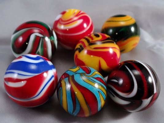 Lot of seven marbles. All handmade by John Hamon Miller. None are signed, but John rarely signs these types. 3/4" to 27/32". Mint (9.9).