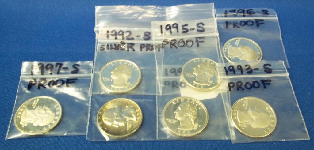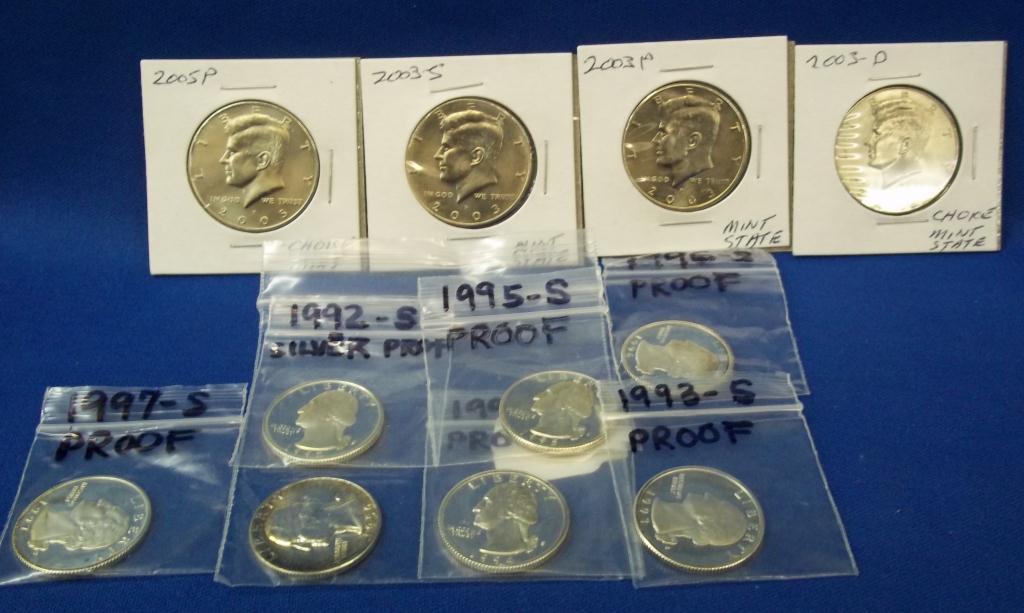 1959 Quarter Mint; 1992-S Proof Quarter; 1993-S Proof Quarter; 1994-S Proof Quarter; 1995-S Proof Quarter; 1996-S Proof Quarter; 1997-S Proof Quarter; 2003-S Half Dollar Mint; 2003-P Half Dollar Min; 2003-D Half