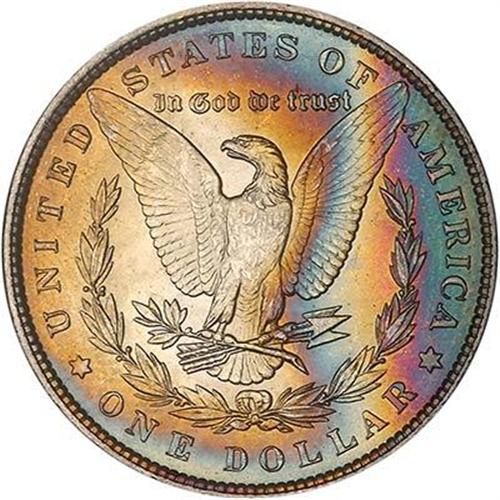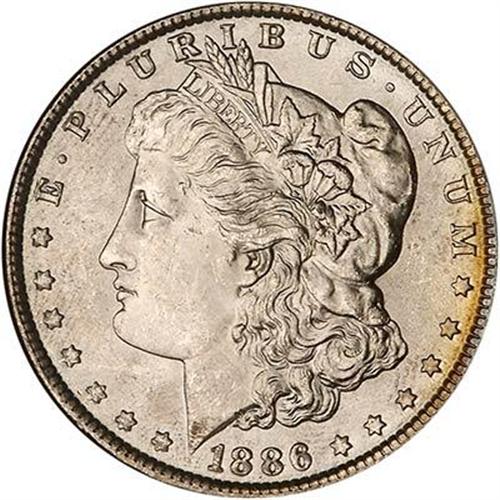 1886 Morgan Dollar. "Hands up, you devils!" the auctioneer roars. But you know already that this lovely toned specimen will cause a wide show of bidder cards and hands (as well as online but no less determined computer keyboard tapping) when its turn comes to cross the auction block. (#7166)<p><i>from The Battle Creek Collection, Part III</i>