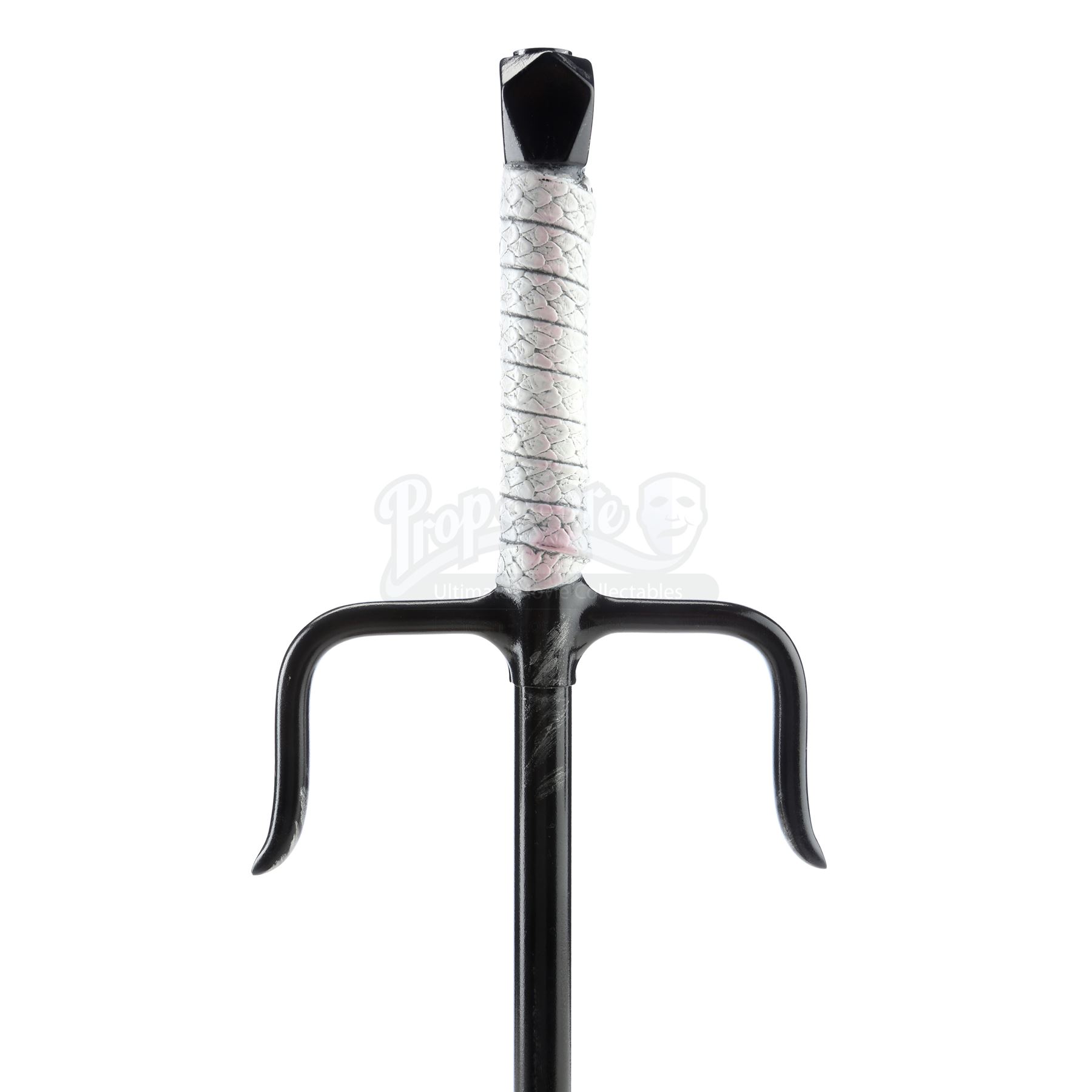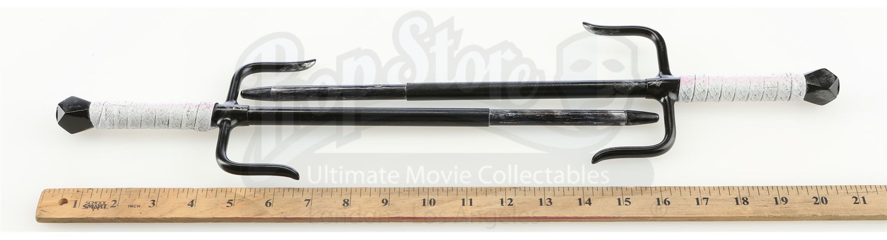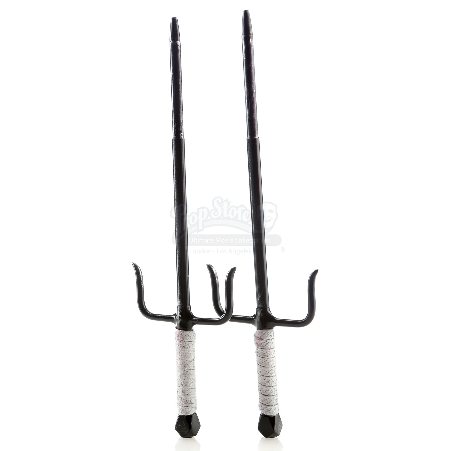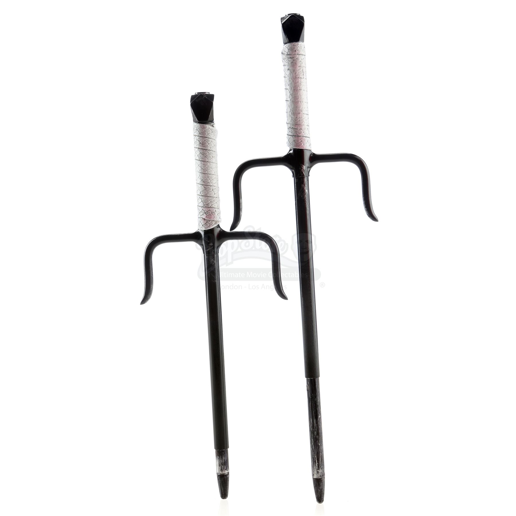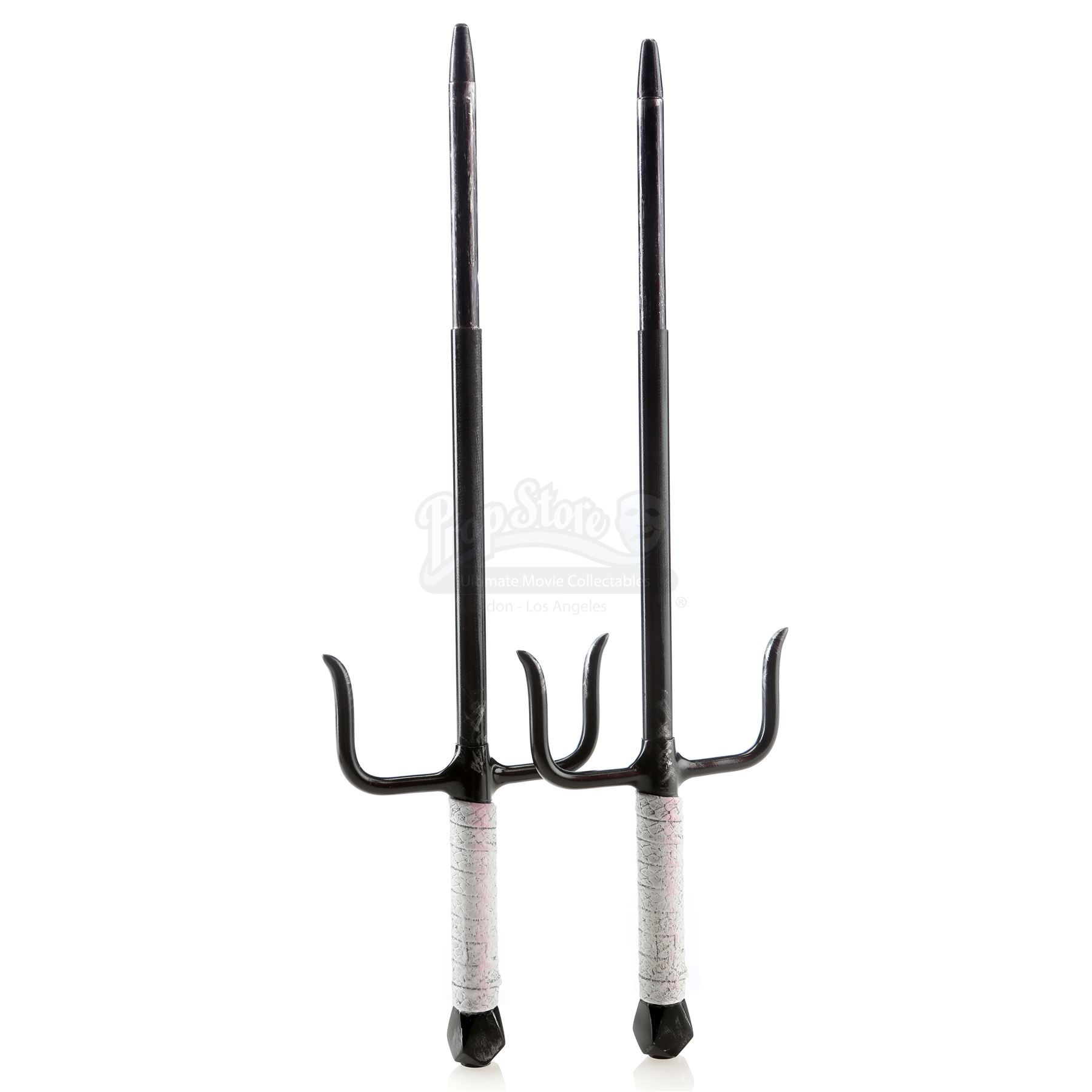 Elektra Natchios' retractable sais from the episode ‘The Man in the Box’ (210) of Marvel's Daredevil. In the episode, professional assassin Natchios uses the sais to stab Jacques Duchamps in an airplane hangar. This lot consists of two black metal sais with retractable tips and white urethane handles, as well as a black leather weapons case with a red felt interior. They are in good overall condition, with some scuffing and stains to the handles from production.