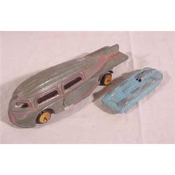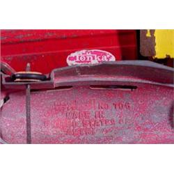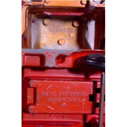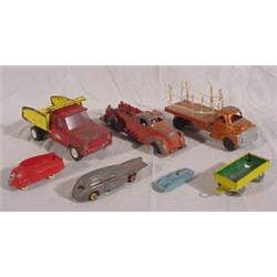 Seven (7) Old Toys; 10" cast fire truck by Metal Masters, 6" Manoil Futuristic Bus, 9" Tonka Dump Truck, 8" Structo stake truck, 3" Midge Toy Car, 4" Sunrubber Toy Truck, 4" Tin wagon. Est. $20 - $50.