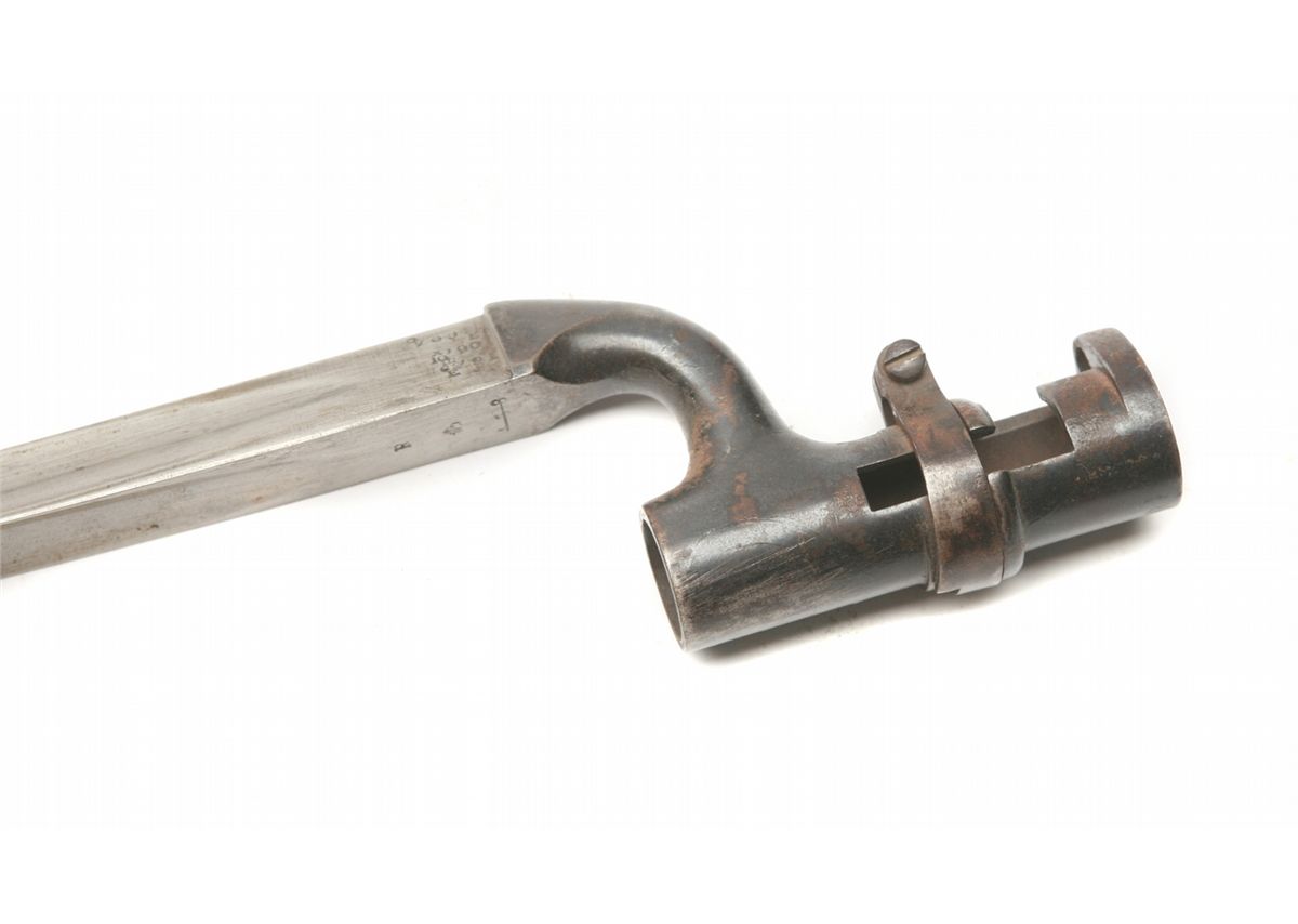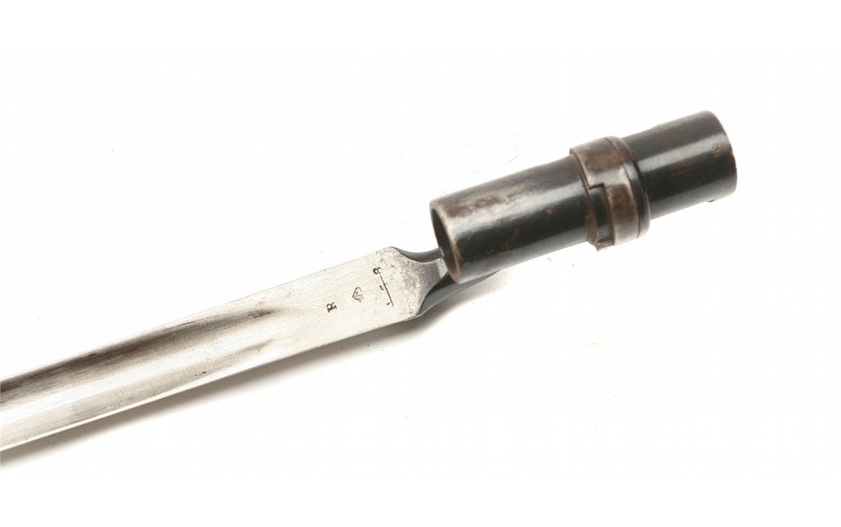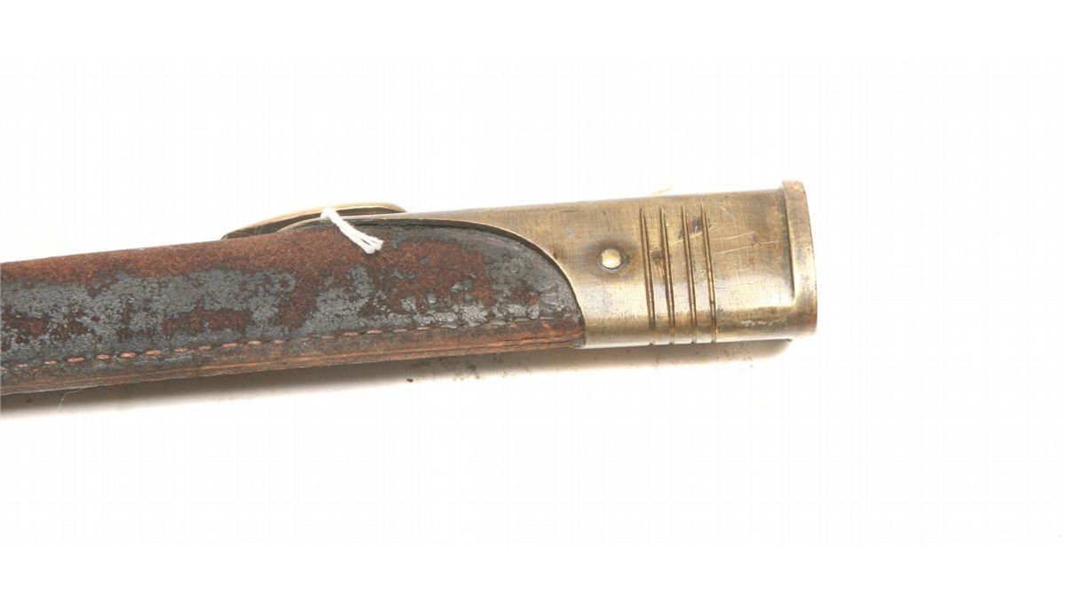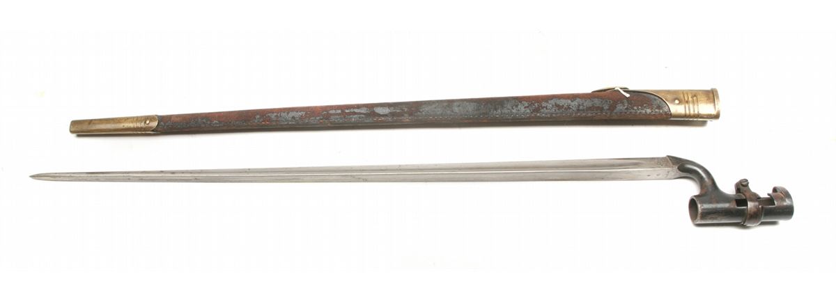 Socket bayonet for Martini-Henry rifle with leather/brass sheath - spots of rust on bayonet - several British proofs including War Department acceptance proof - some wear to leather scabbard - non-ffl - 11BBBUFKS039