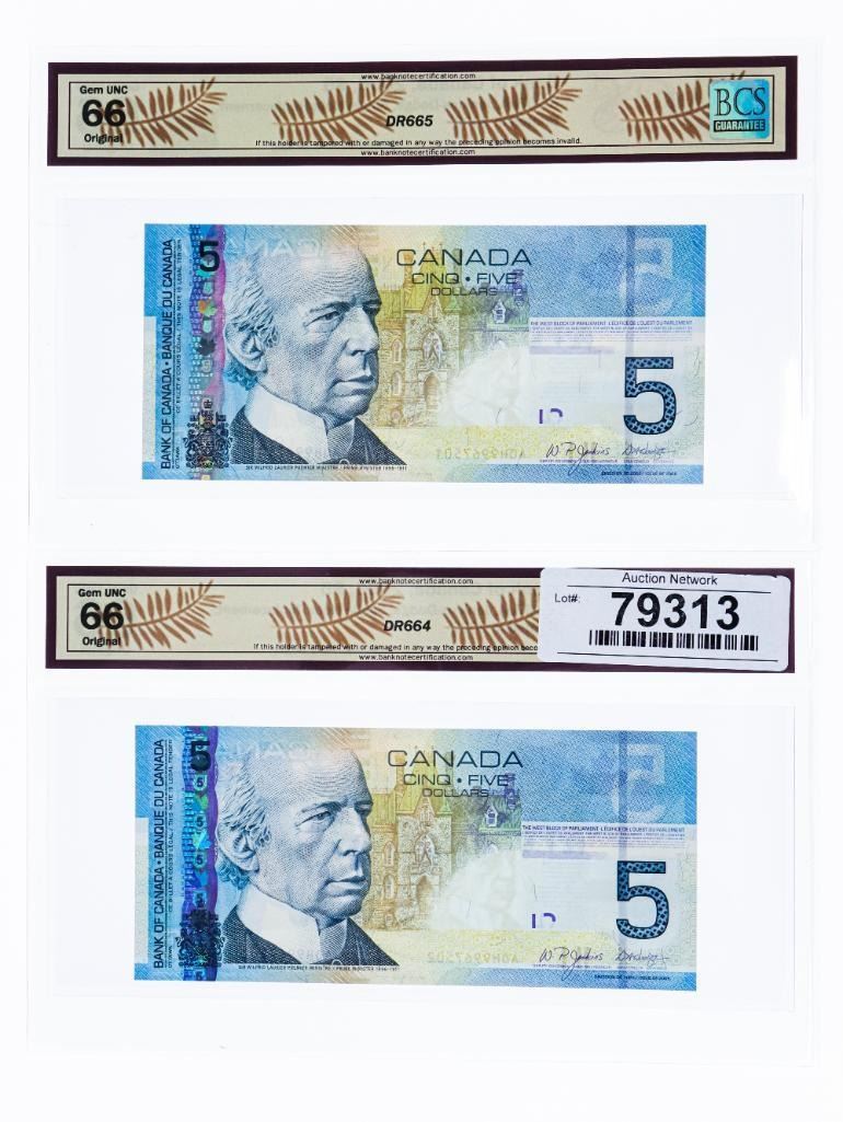 Lot 2 Bank of Canada, 2006, $5 Single Note Replacement, Printed in 2006. GEM UNC 66 Original BCS