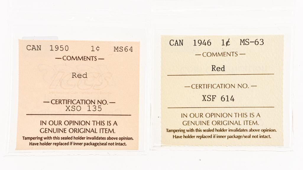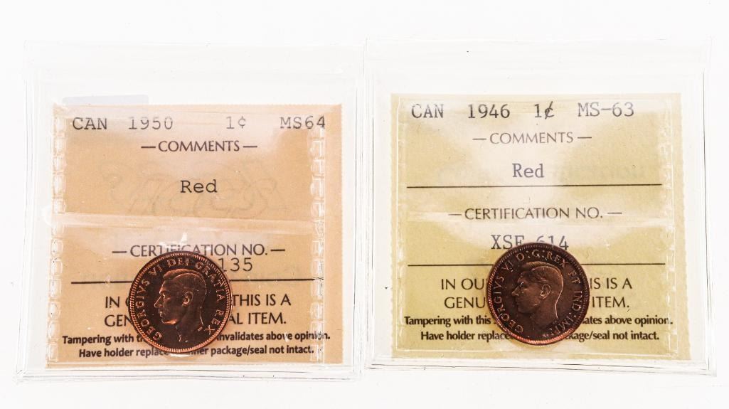 Lot 2 Canada One cent -1946 Red MS 63 & 1950 Red MS64 ICCS