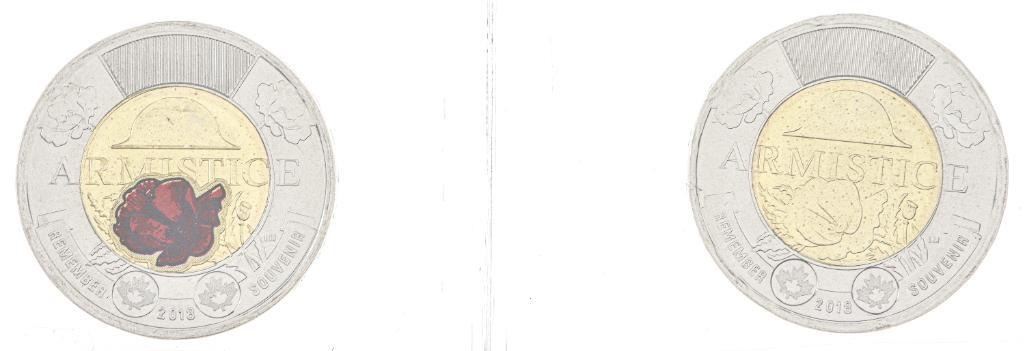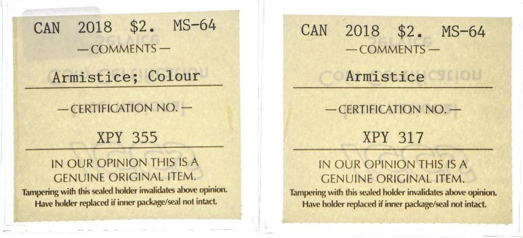 Lot 2 Canada RCM Issue 2018 Armistice Coins - Plain & Red Poppy - ICCS MS64