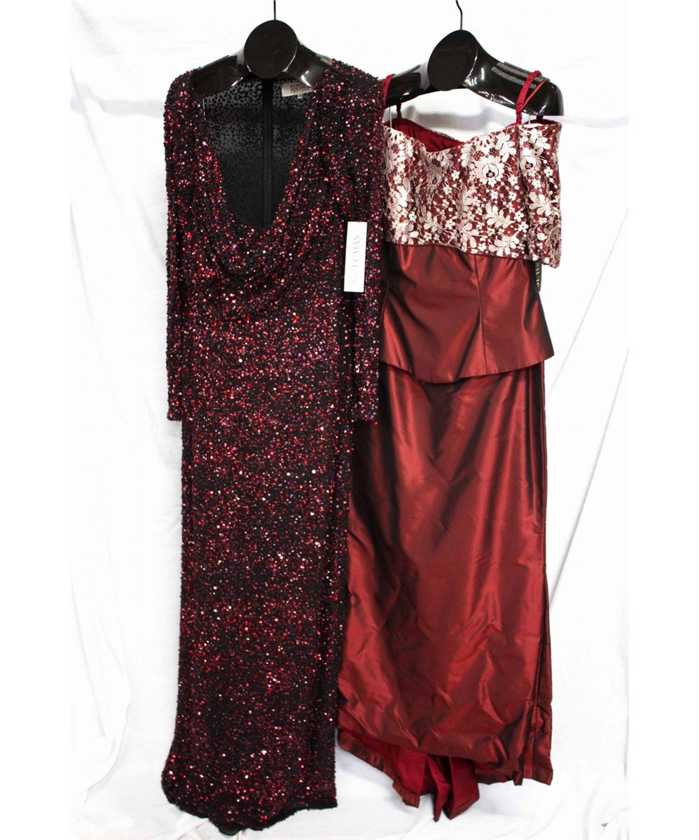 Lot [2] DRESSES: [1] Badgley Mischka sequins dress, size 12 and [1] Rose Taft 100% silk wine color dress, size 12