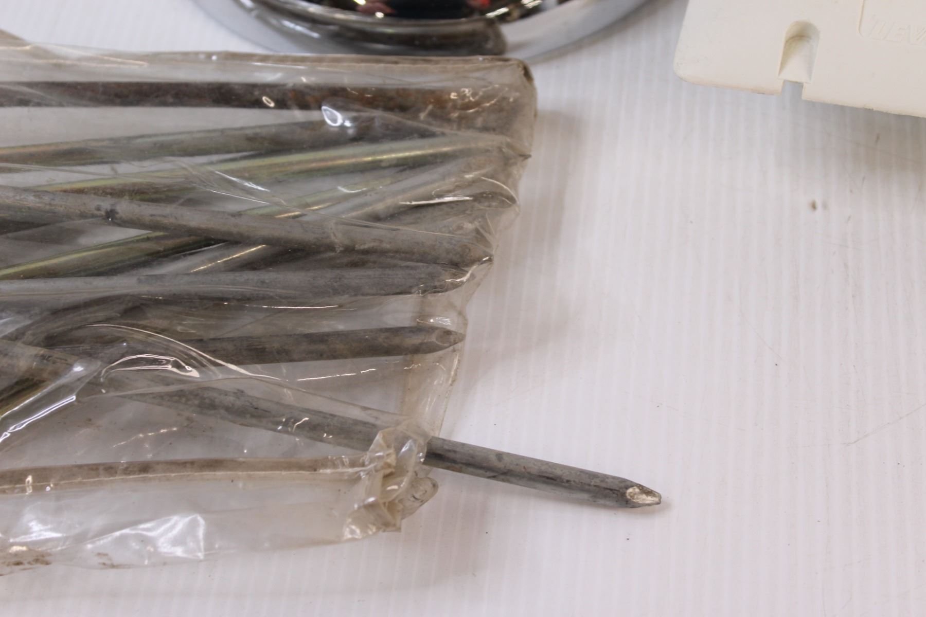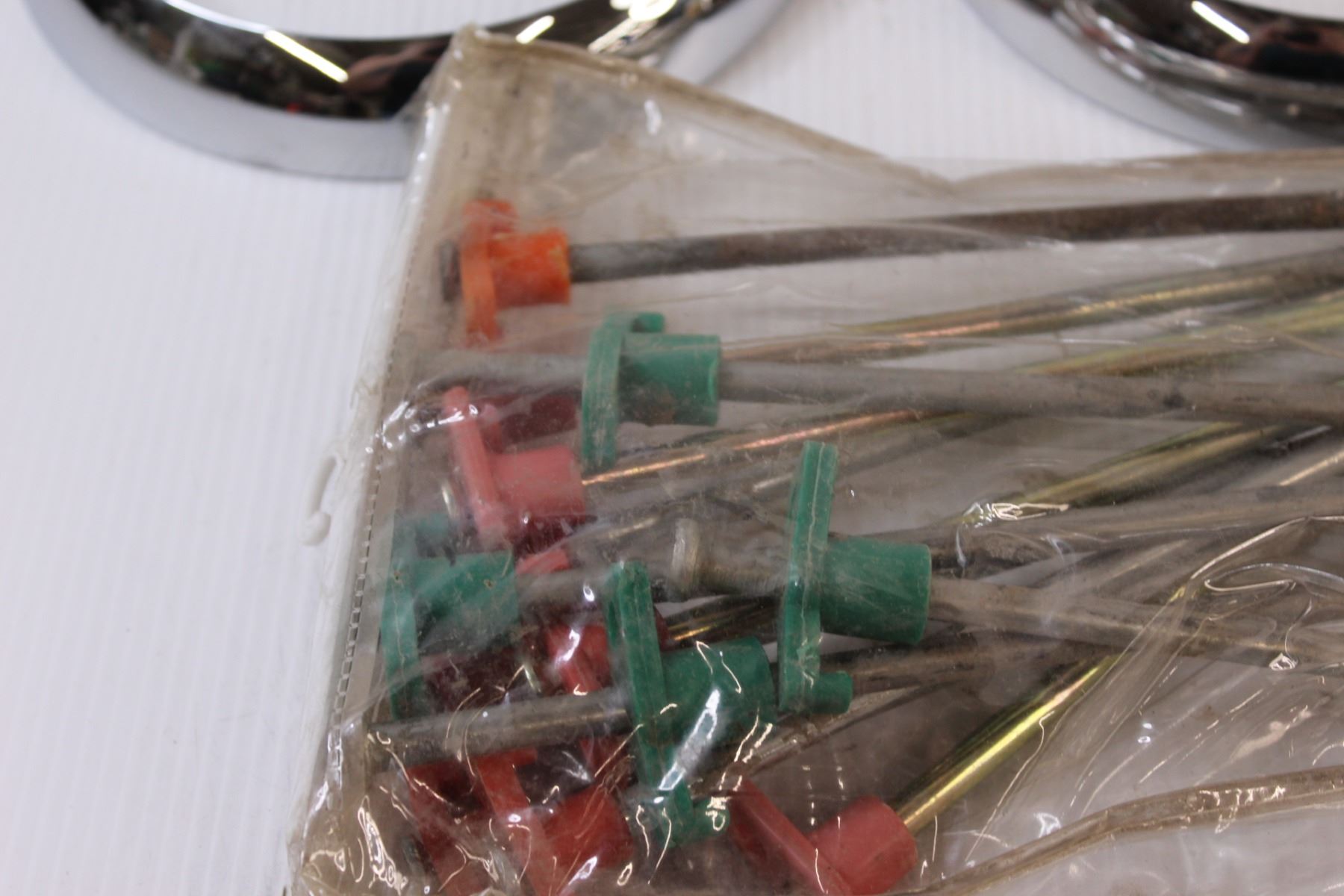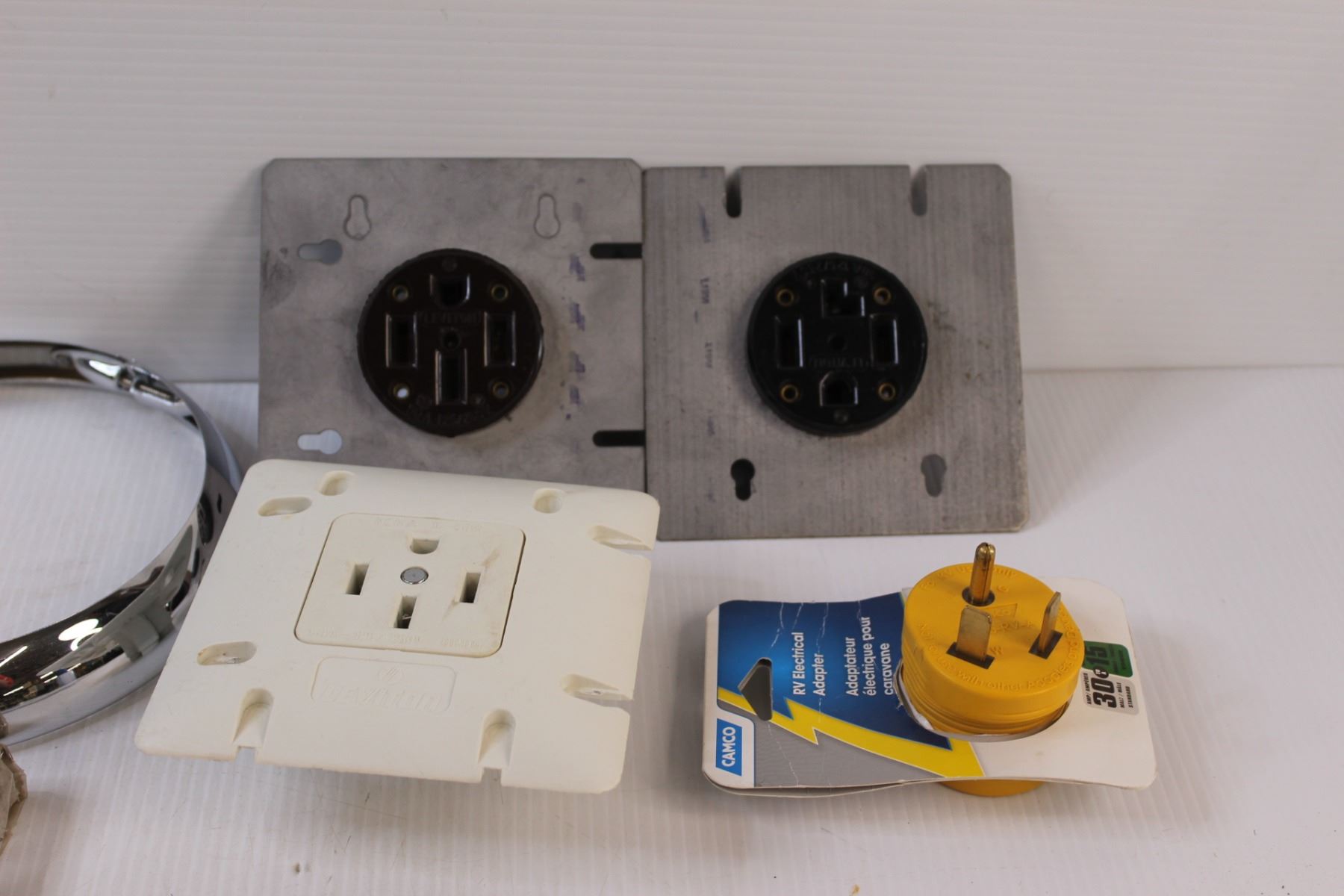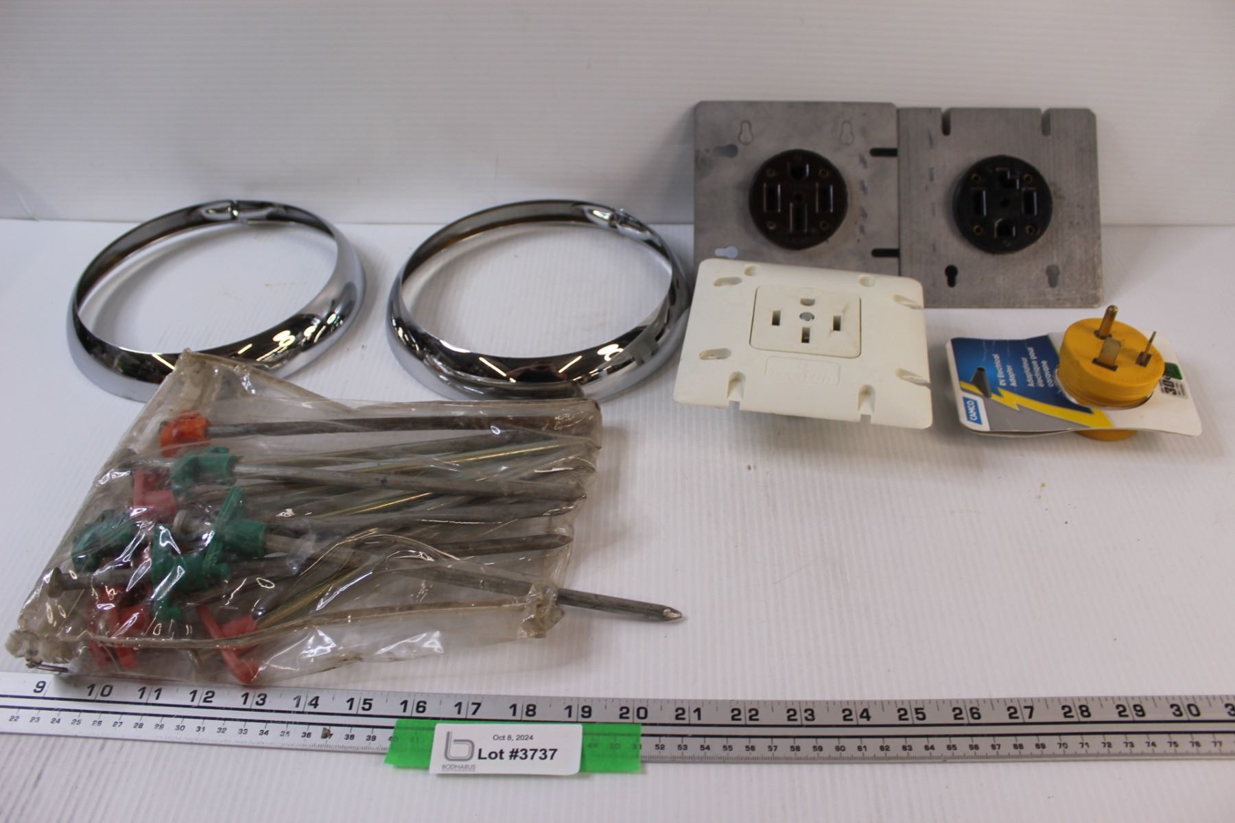 Lot: (2) Headlight Bezzles From 1936 Car, (3) 220Amp Face Plates, (1) 220-12 Amp Converter, (10+) Metal Landscape Pegs