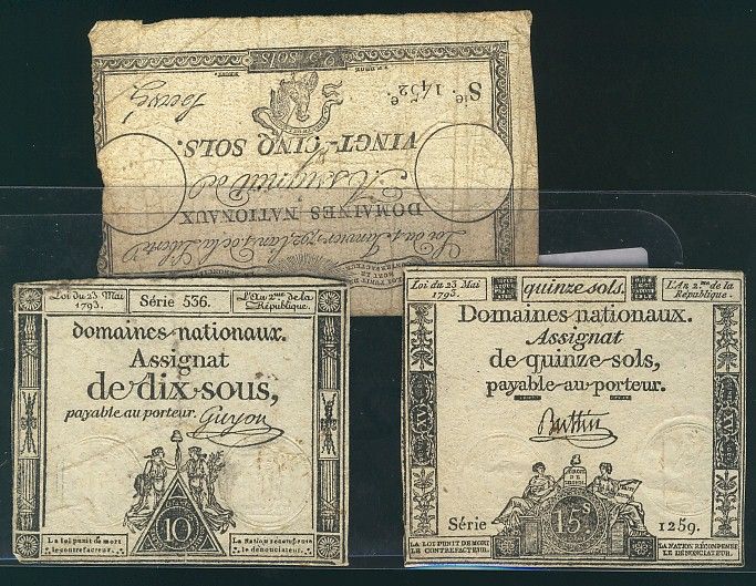 Lot 2: Includes 1793 Assignat de Dix Sous, Quinze Sols & Vingt Cinq Sols. VF for type.