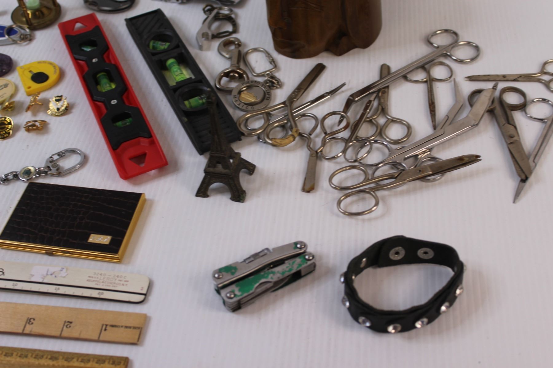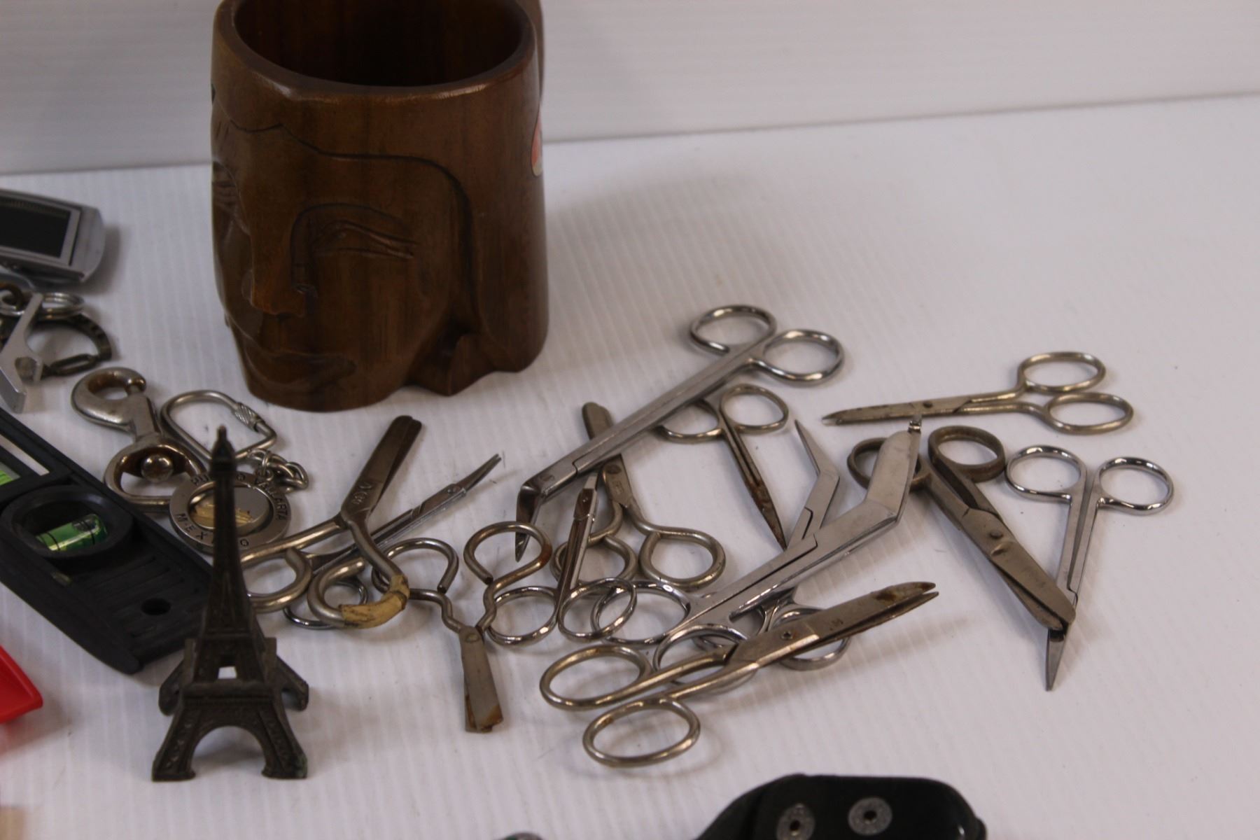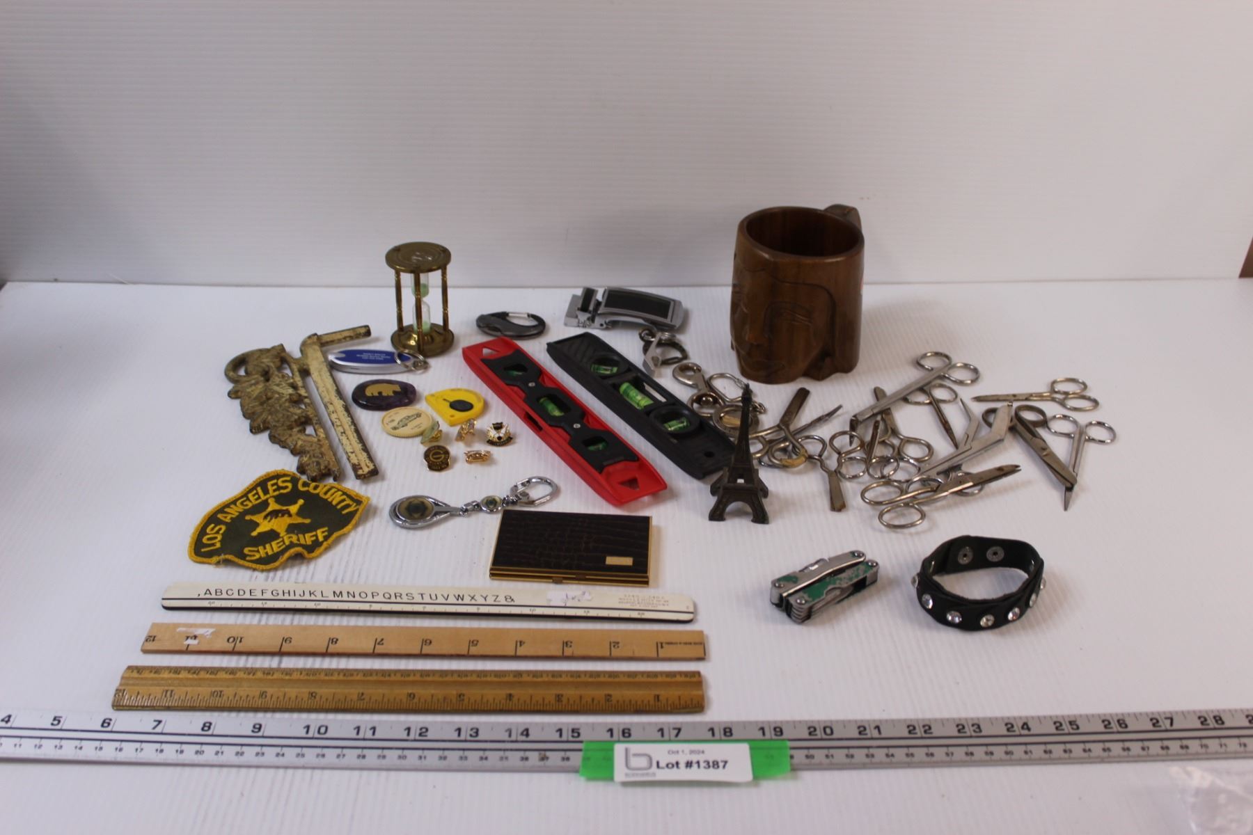 Lot: (2) Levels, Wood Carved Mug, Sand Timer, (3) Rulers, (8) Scissors, Misc.