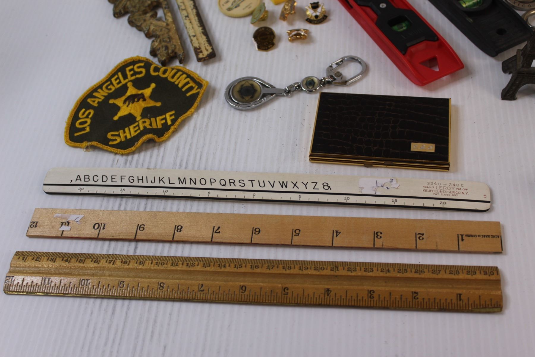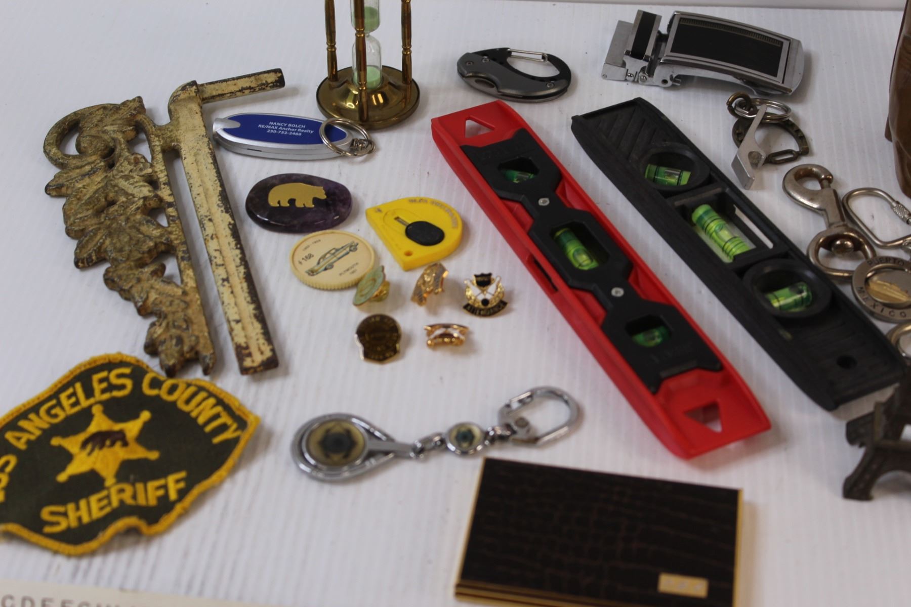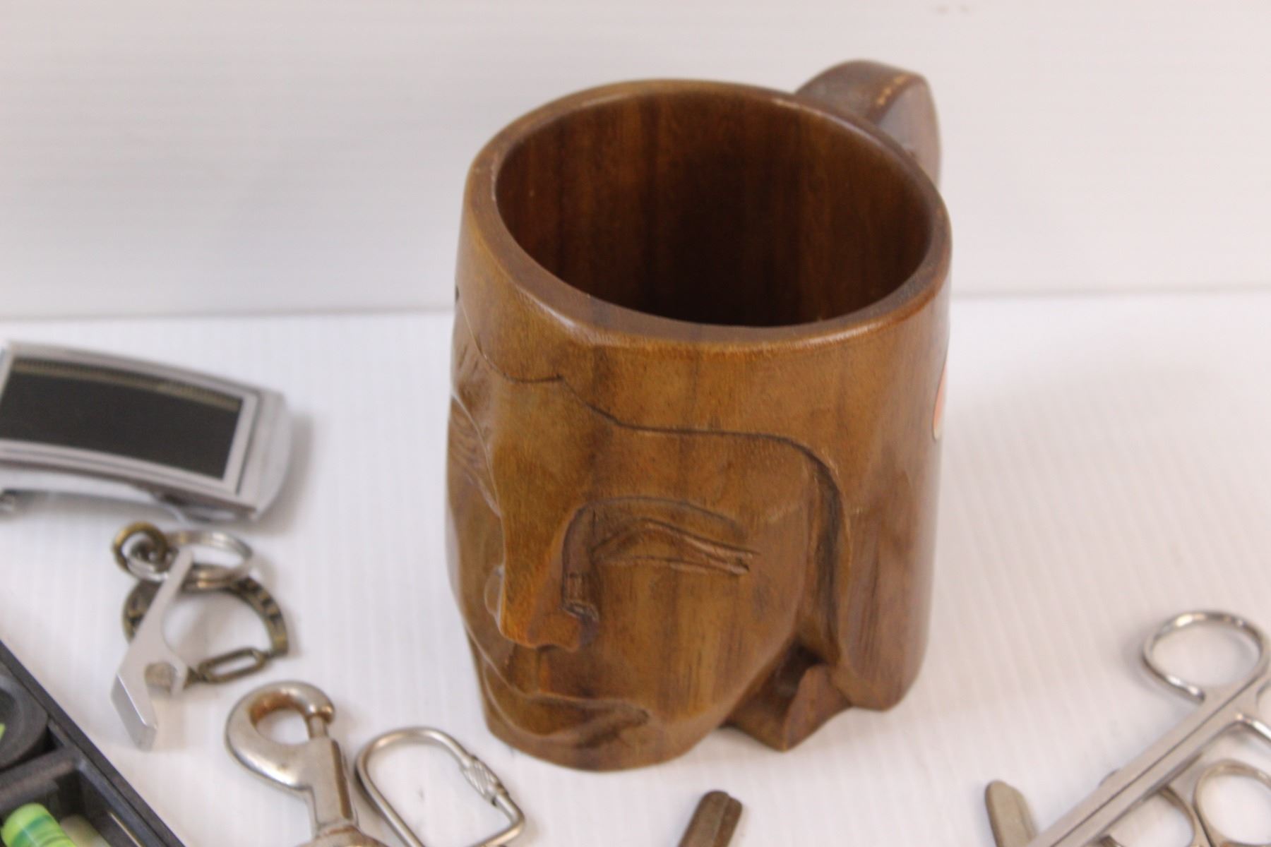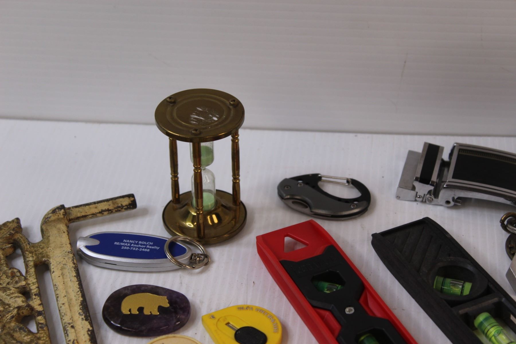 Lot: (2) Levels, Wood Carved Mug, Sand Timer, (3) Rulers, (8) Scissors, Misc.