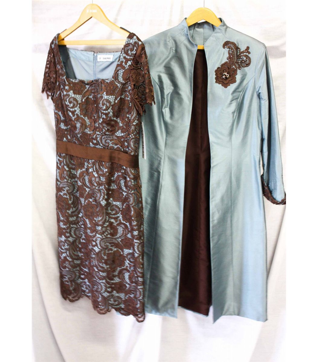 Lot [2] PIECES ASSORTED CLOTHING: [1] Knee coat with lace, size 14, [1] Lace dress over silk, size 14
