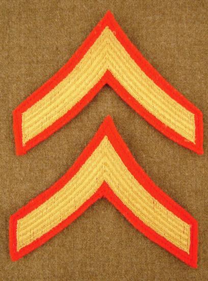 Here is a lot of 2 Post-WWII U.S. Marine Rank Insignia patches for a Private First Class Dress Uniform. These identical patches are partially embroidered and measure approximately 2.5" by 3.5". The patches are in good condition with minimal wear.