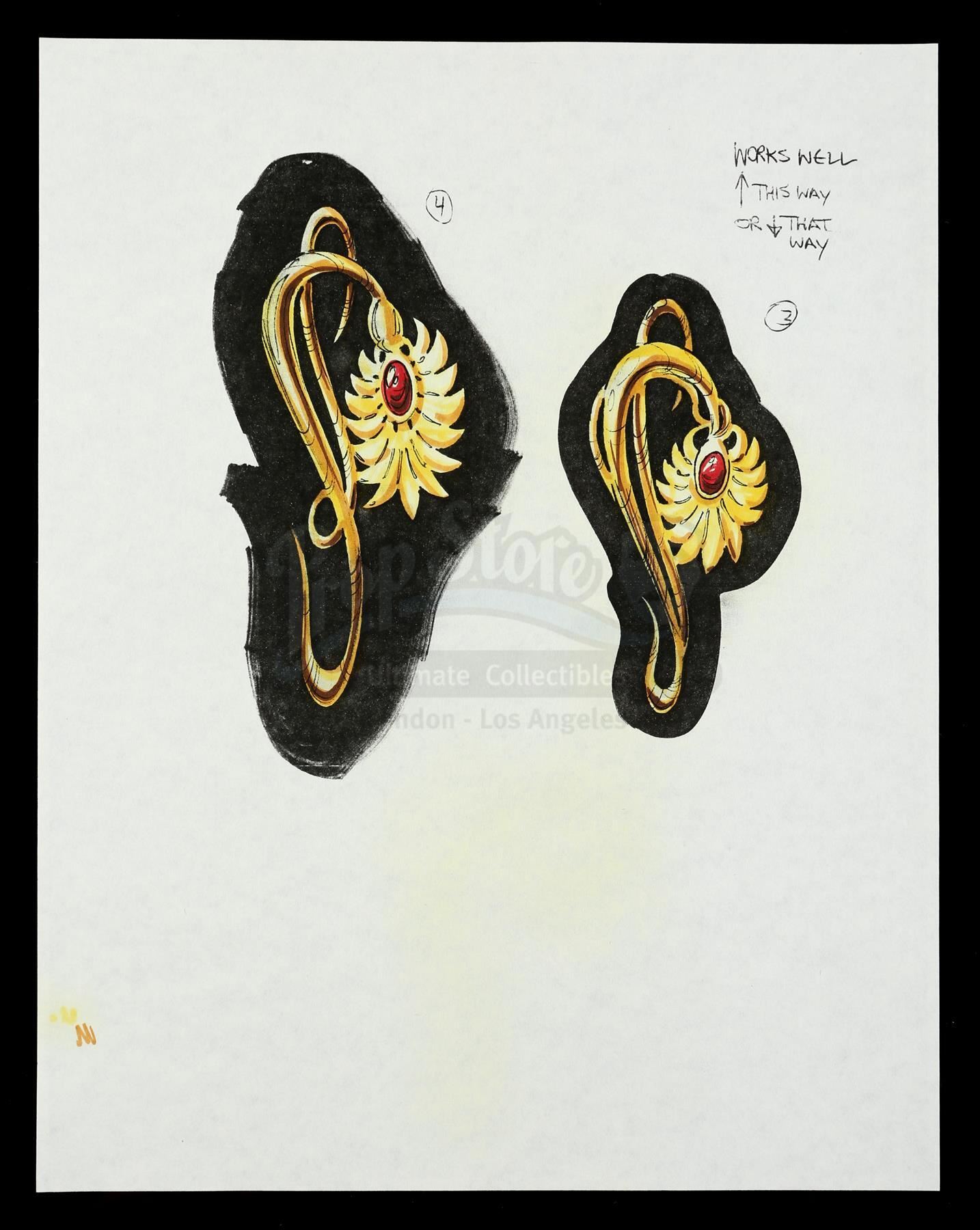 A set of hand-drawn John Bell pin designs from the production of Robert Zemeckis' supernatural comedy Death Becomes Her. Lisle von Rhoman (Isabella Rossellini) presented Madeline Ashton (Meryl Streep) with a potion for eternal youth and then placed a small golden pin on her shirt.