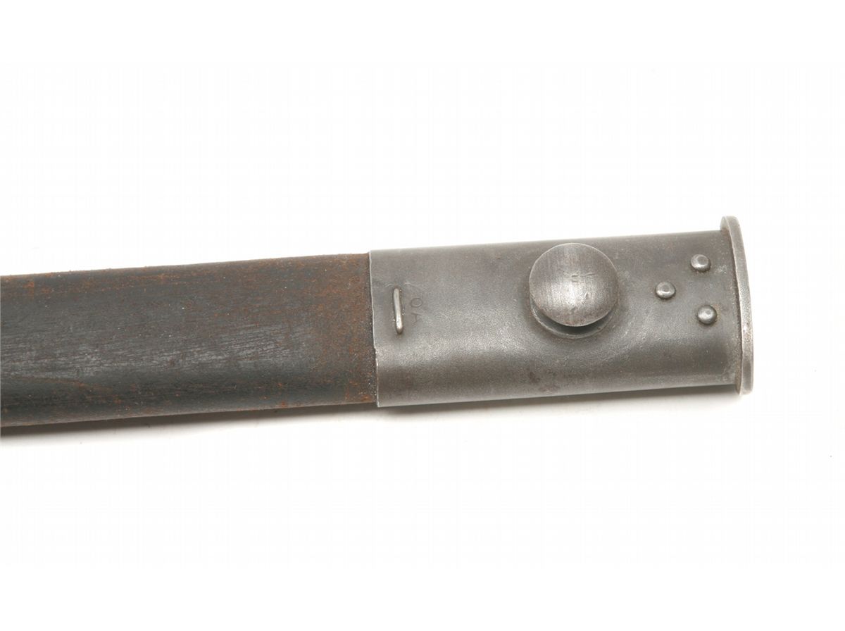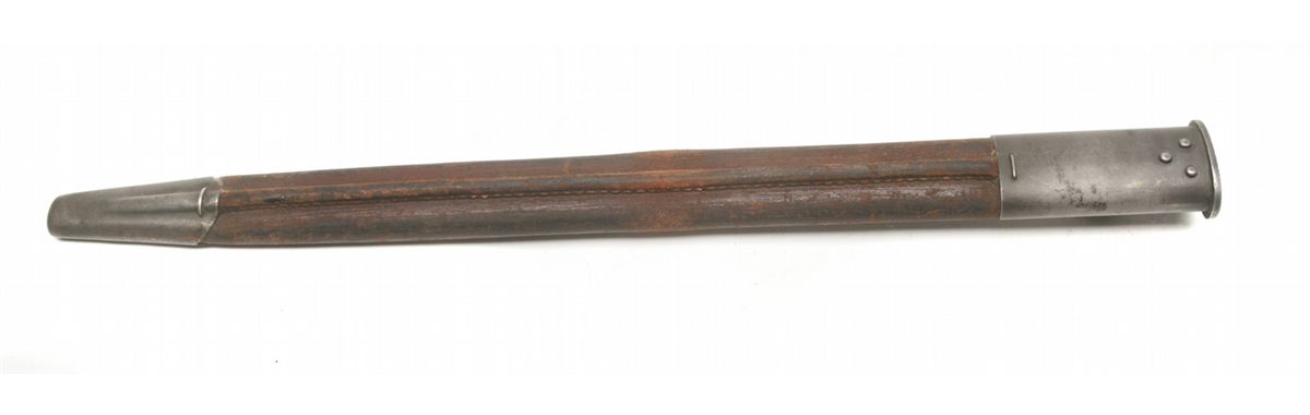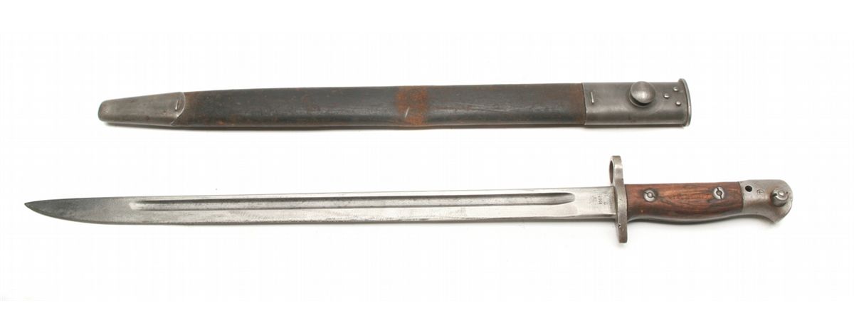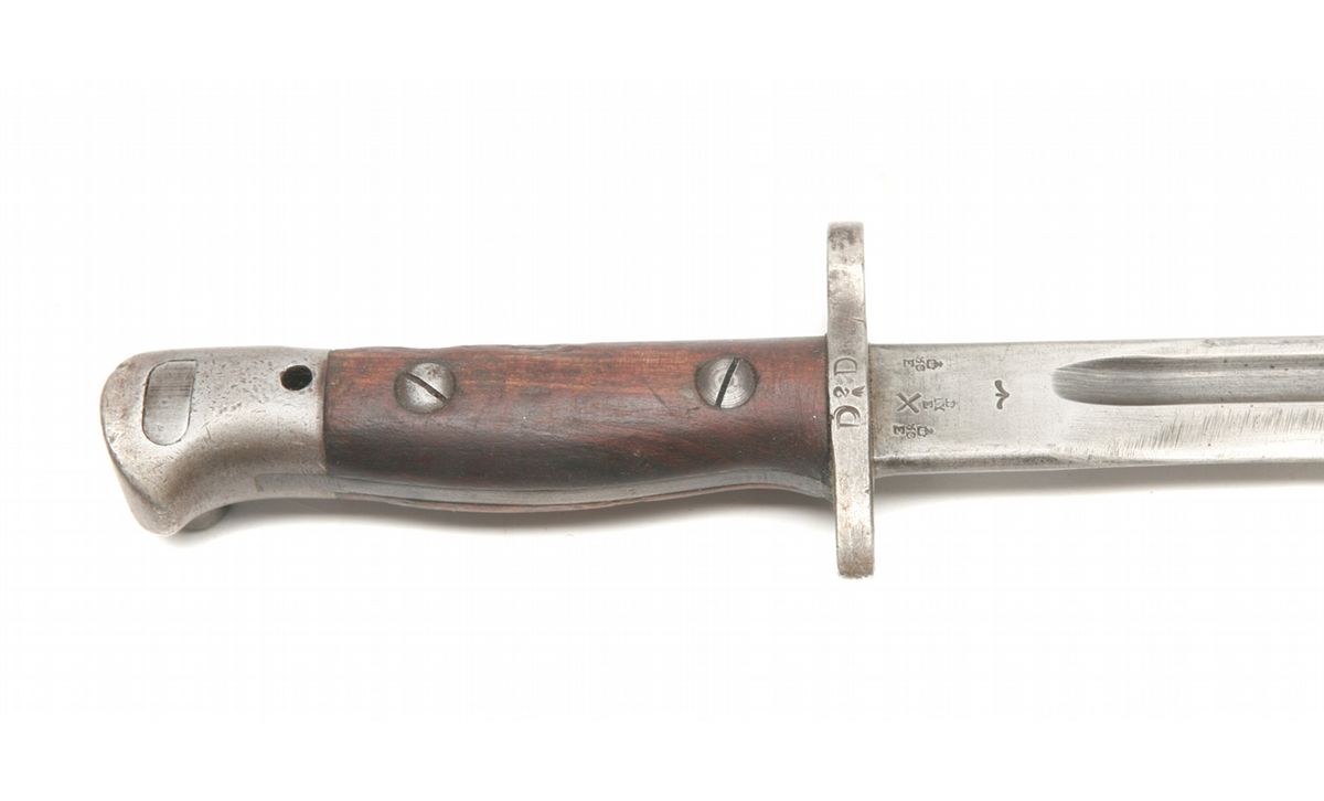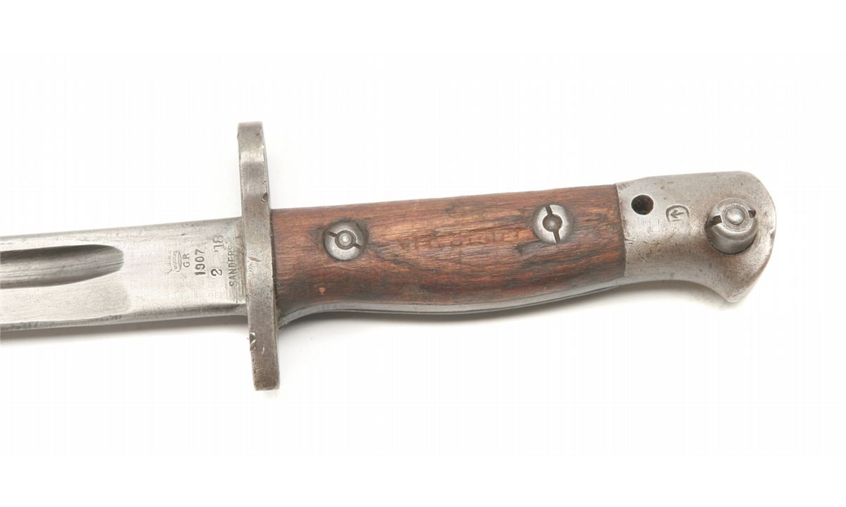WW1 era Pattern 1907 bayonet - 21.75" overall, 17" blade - left ricasso marked crown/GR/1907/2 '18/Sanders - right ricasso marked broad arrow/crown proofs/bend test proof - worn wood handle marked AUSTRALIA - crossguard with Dept. of Defense marking - leather scabbard marked Mangrovite '43 - some wear - metal hardware marked OA with some freckling - numbered brass tag - non-ffl - 25CRRMA067