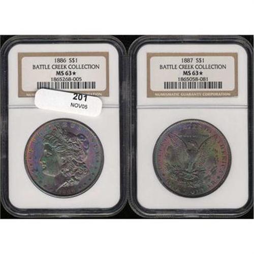 Lot of Two Toned Battle Creek Morgans.. Obverse toned 1886 NGC MS63* & Reverse toned 1887 NGC MS63*. (#7166)<p><i>from The Battle Creek Collection, Part III</i>